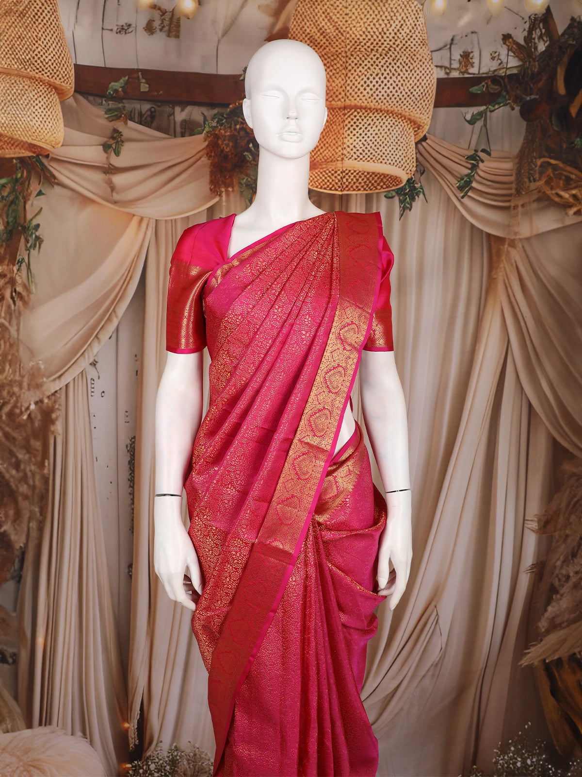 Step into elegance with this Rani Pink Pure Kanchipuram Silk Saree, a masterpiece of timeless beauty and skilled craftsmanship. The saree features intricate floral zari woven patterns that shimmer against the radiant pink backdrop, giving it an exquisite royal charm. The luxurious silk texture and natural luster make it a perfect pick for weddings, festive occasions, and grand celebrations.