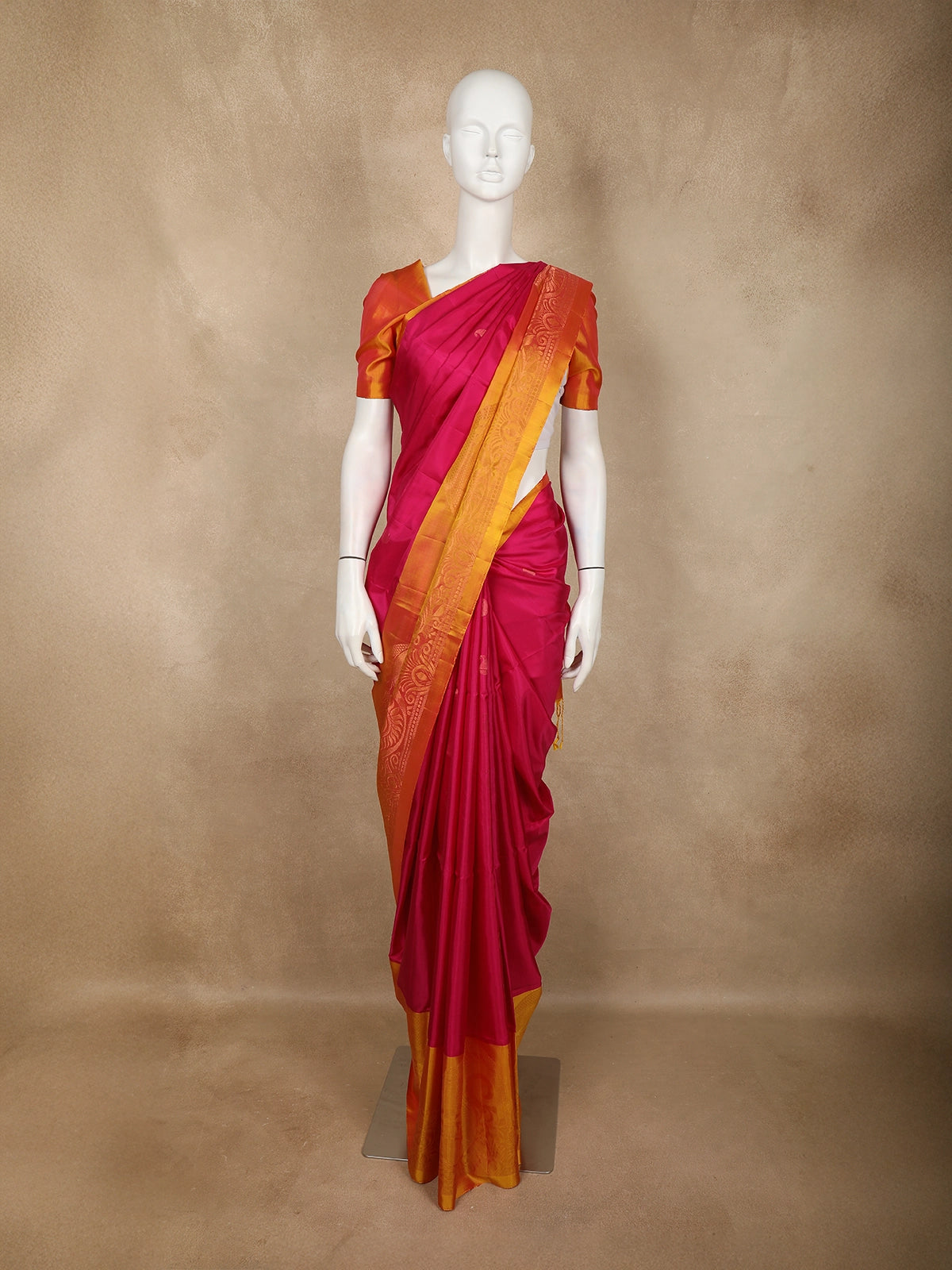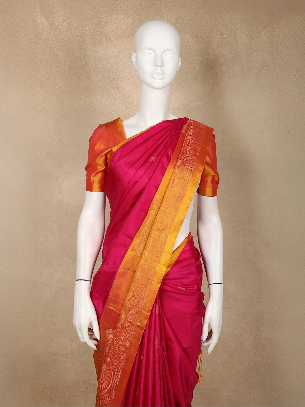 The saree is beautifully enhanced with a striking contrast yellow–orange zari border, intricately woven with floral and paisley motifs that add depth and sophistication. The pallu carries a detailed geometric zari pattern, elevating the overall look with a regal touch.