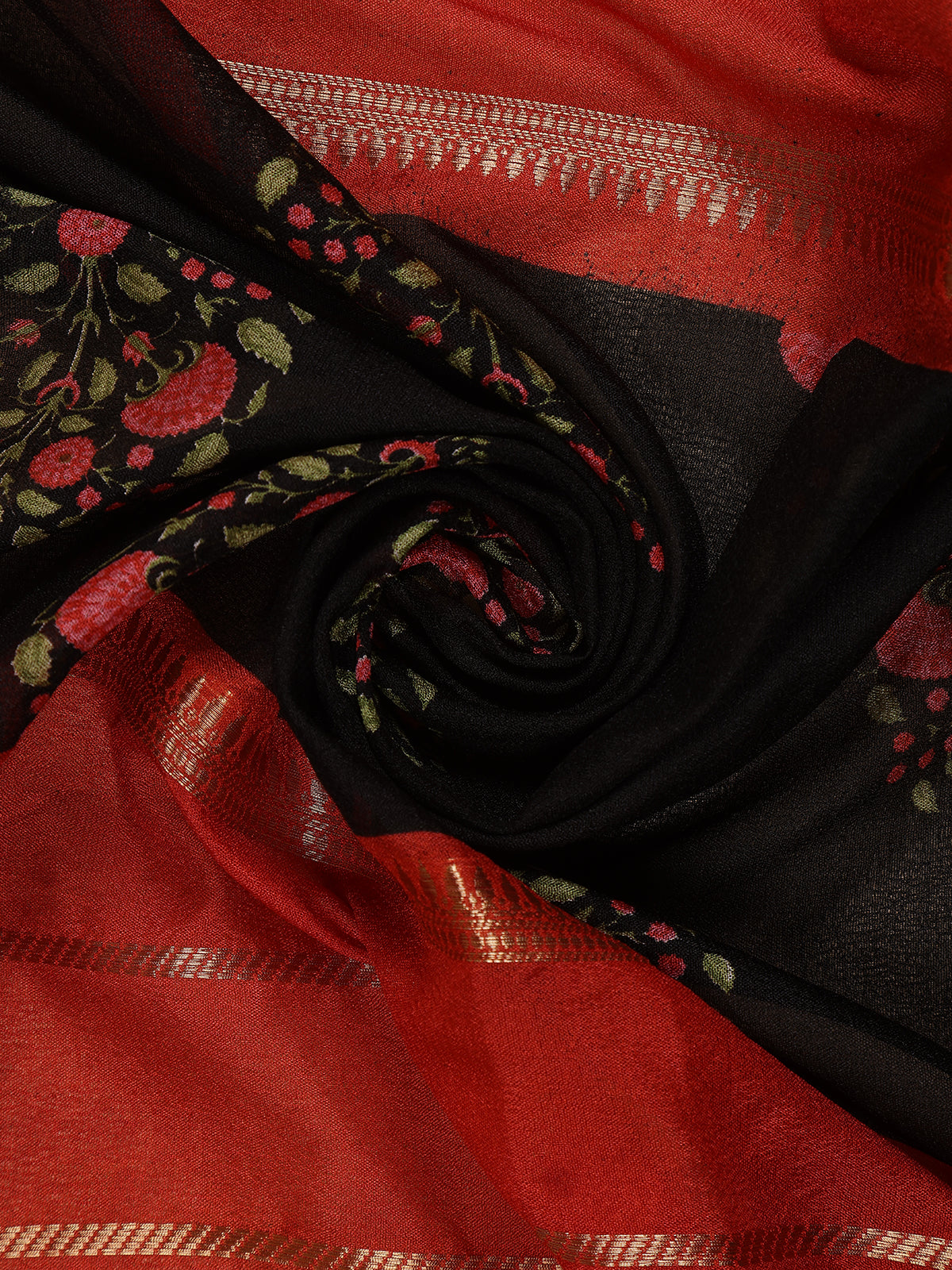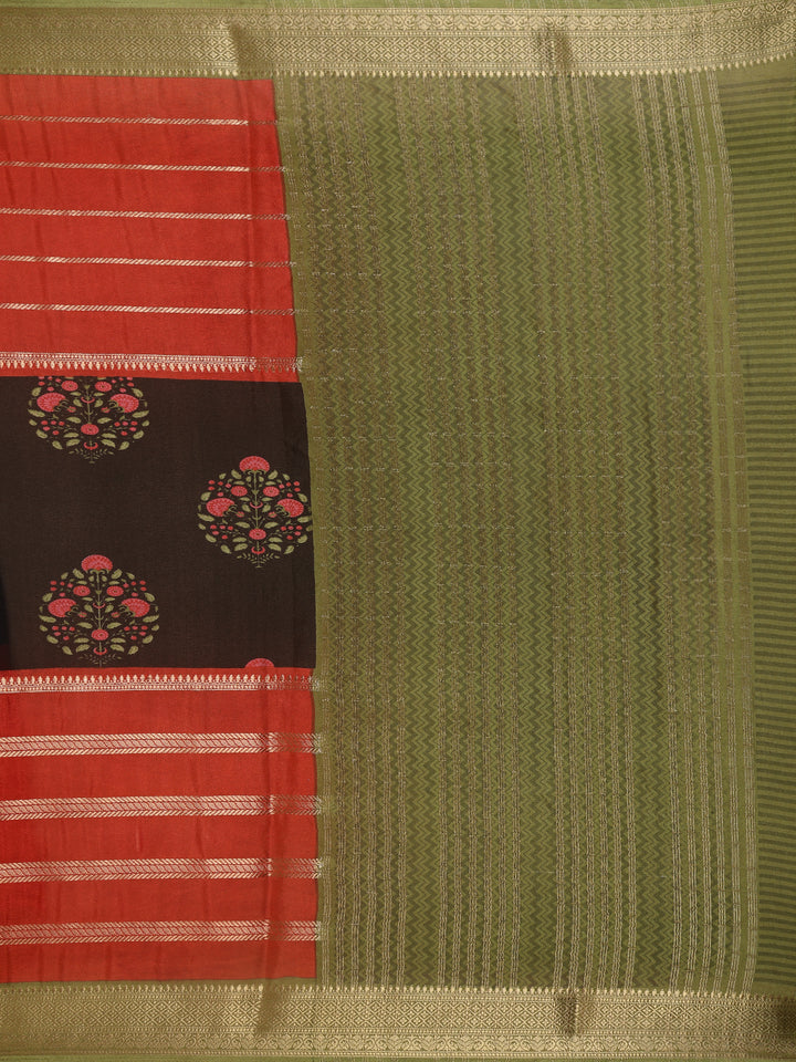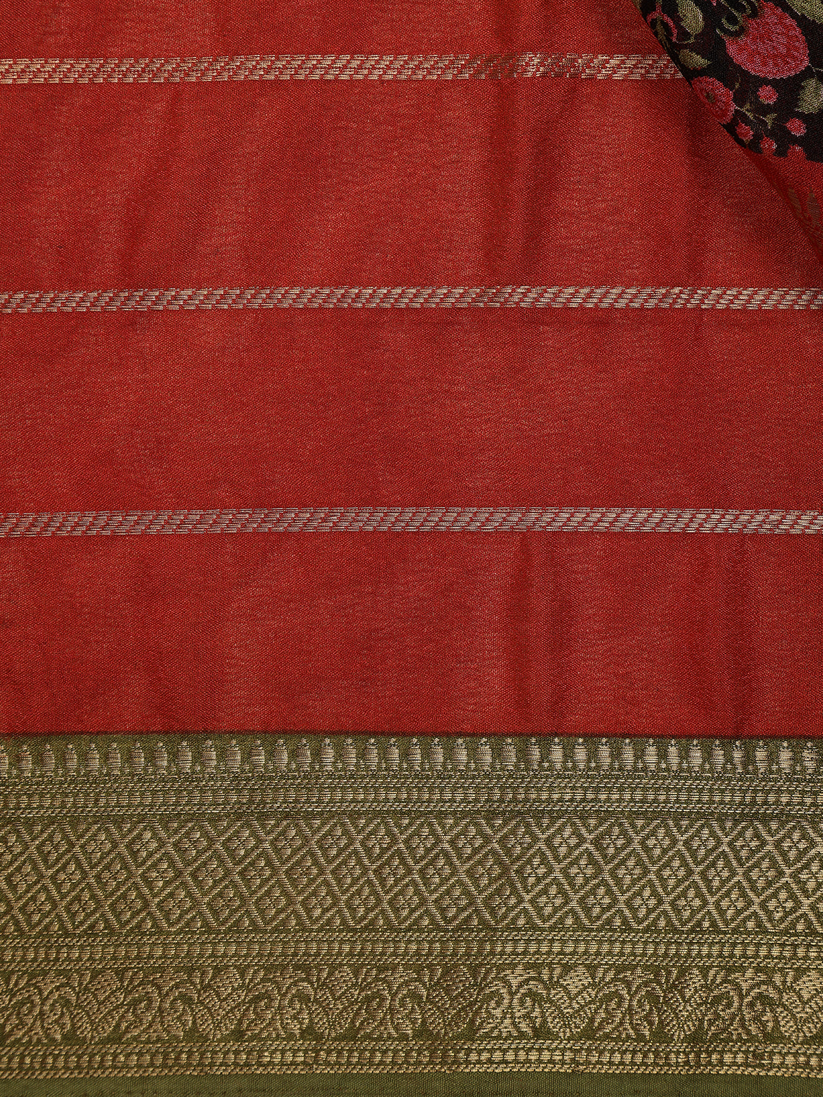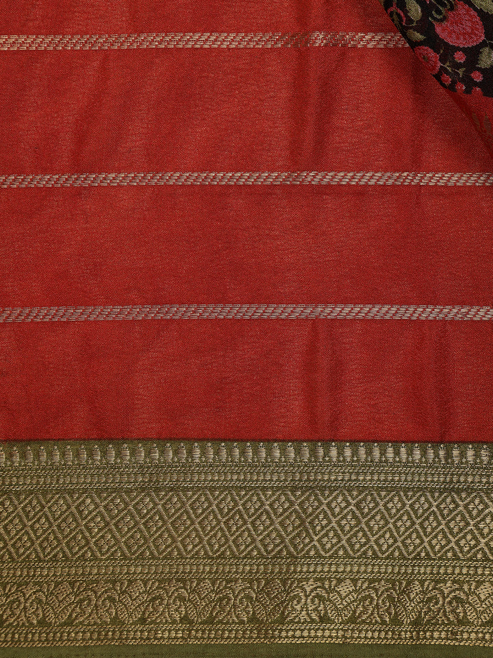 This Red and Black Mul Mul Cotton Saree radiates refined elegance with its delicate zari stripes and floral butta detailing. The contrast olive green border and blouse balance the vibrant red body and intricate black floral pallu, creating a perfect blend of tradition and style. Lightweight and graceful, it’s ideal for festive occasions and elegant daytime events.