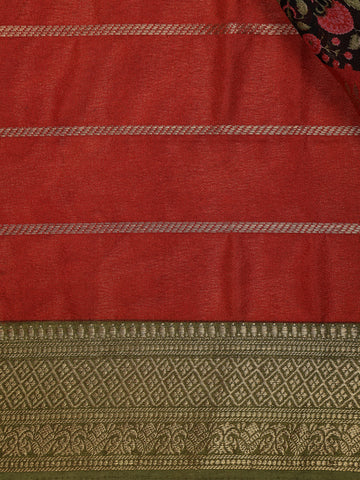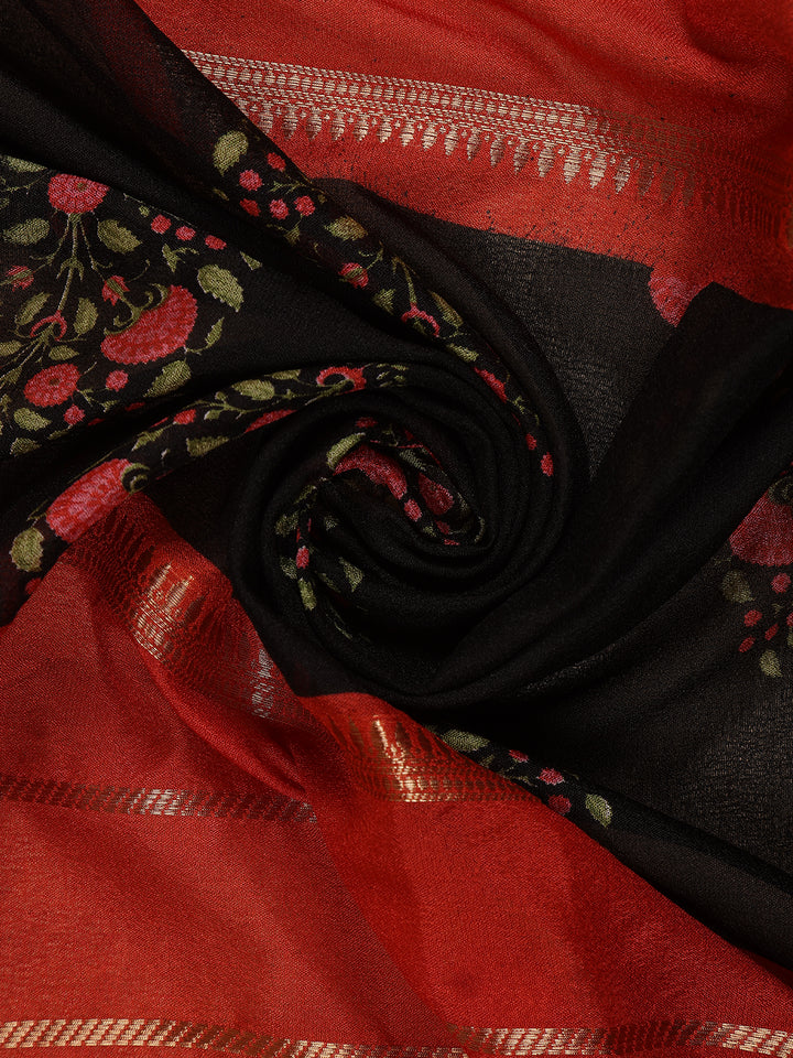Red and Black Floral Butta Striped Design Mul Mul Cotton Saree with Zari Border