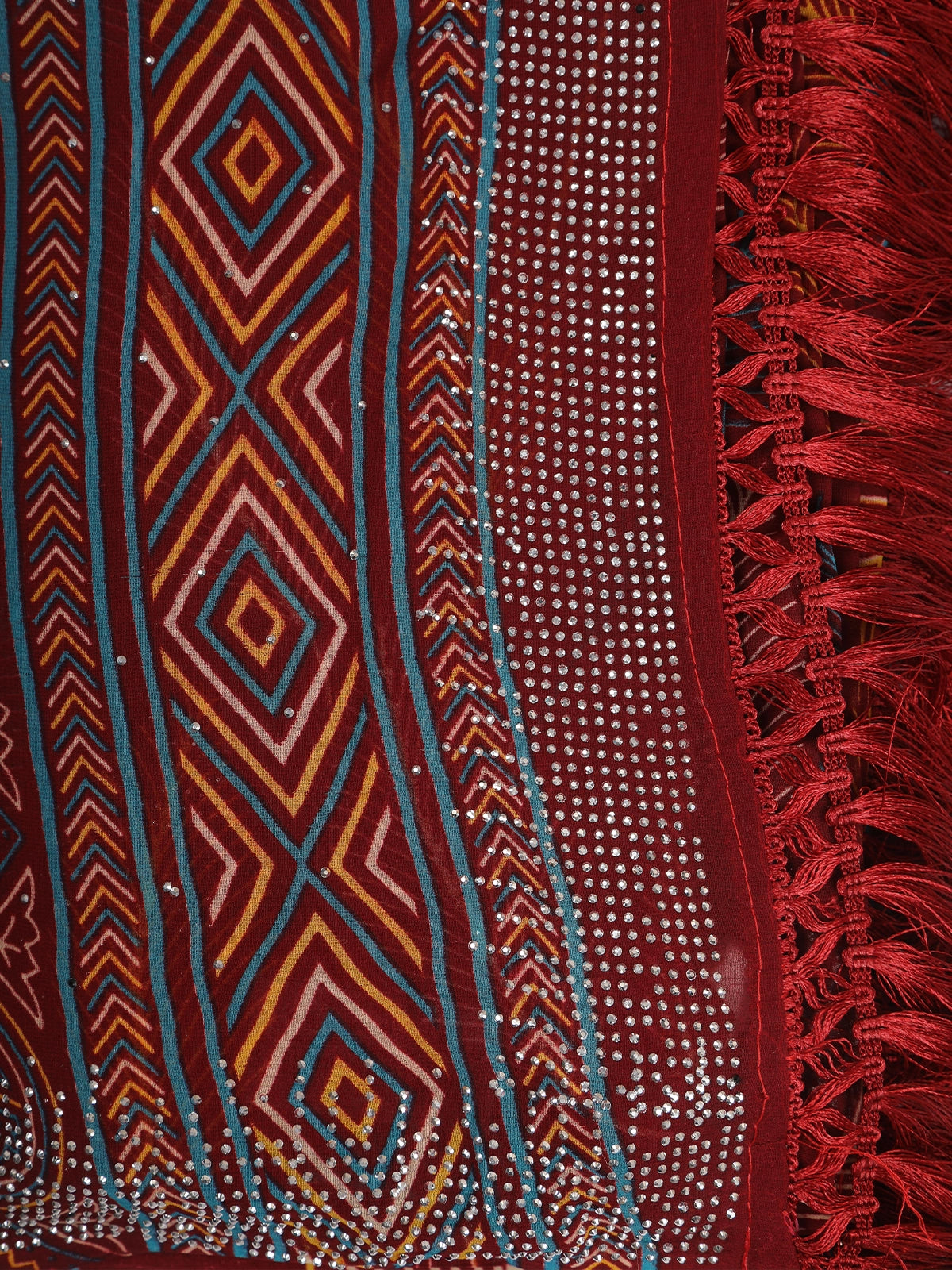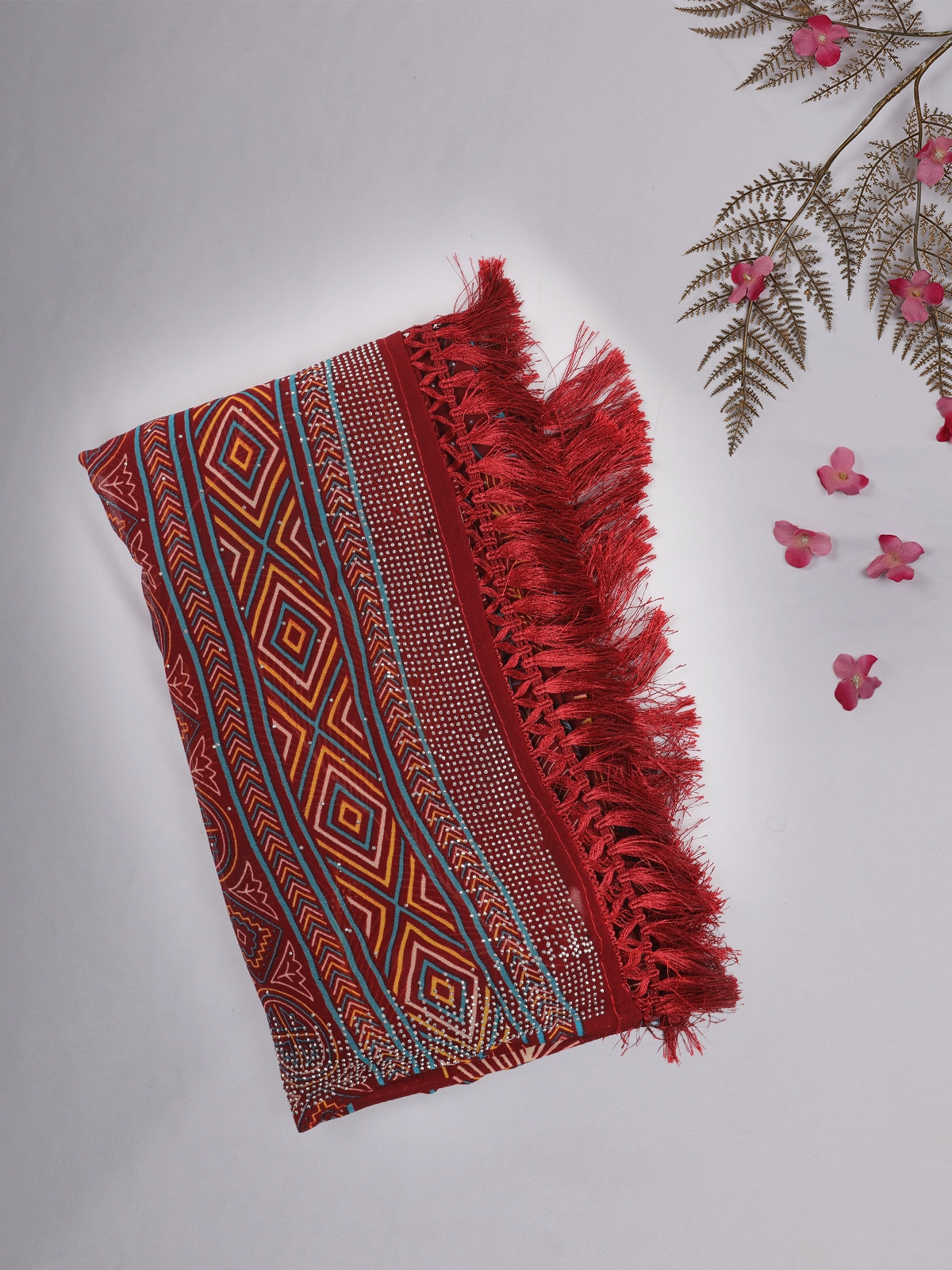 Red and Maroon Geometric Printed Design Chiffon Saree with Stone Embellished Border