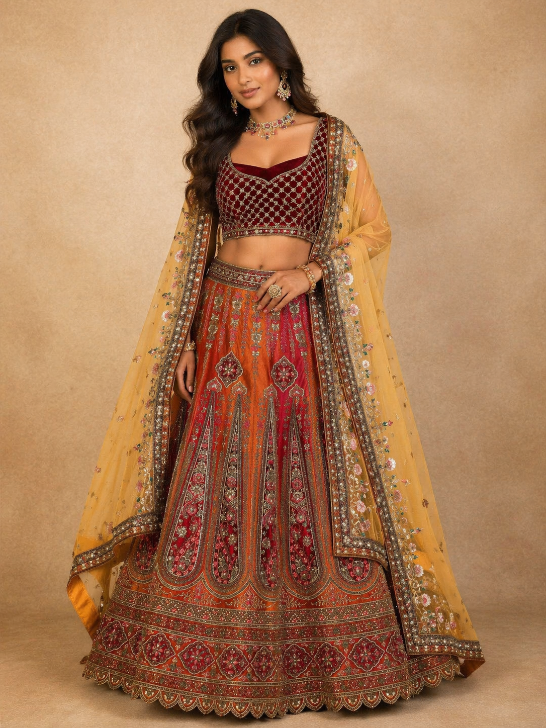Ideal as a wedding lehenga, festive wear lehenga, or reception outfit, this ensemble blends classic craftsmanship with contemporary styling. The contrast dupatta in soft net fabric, highlighted with embroidered borders and delicate embellishments, completes the outfit gracefully. This designer lehenga stands out for its fine detailing, balanced color combination, and elegant drape, making it suitable for weddings, engagements, and grand celebrations.