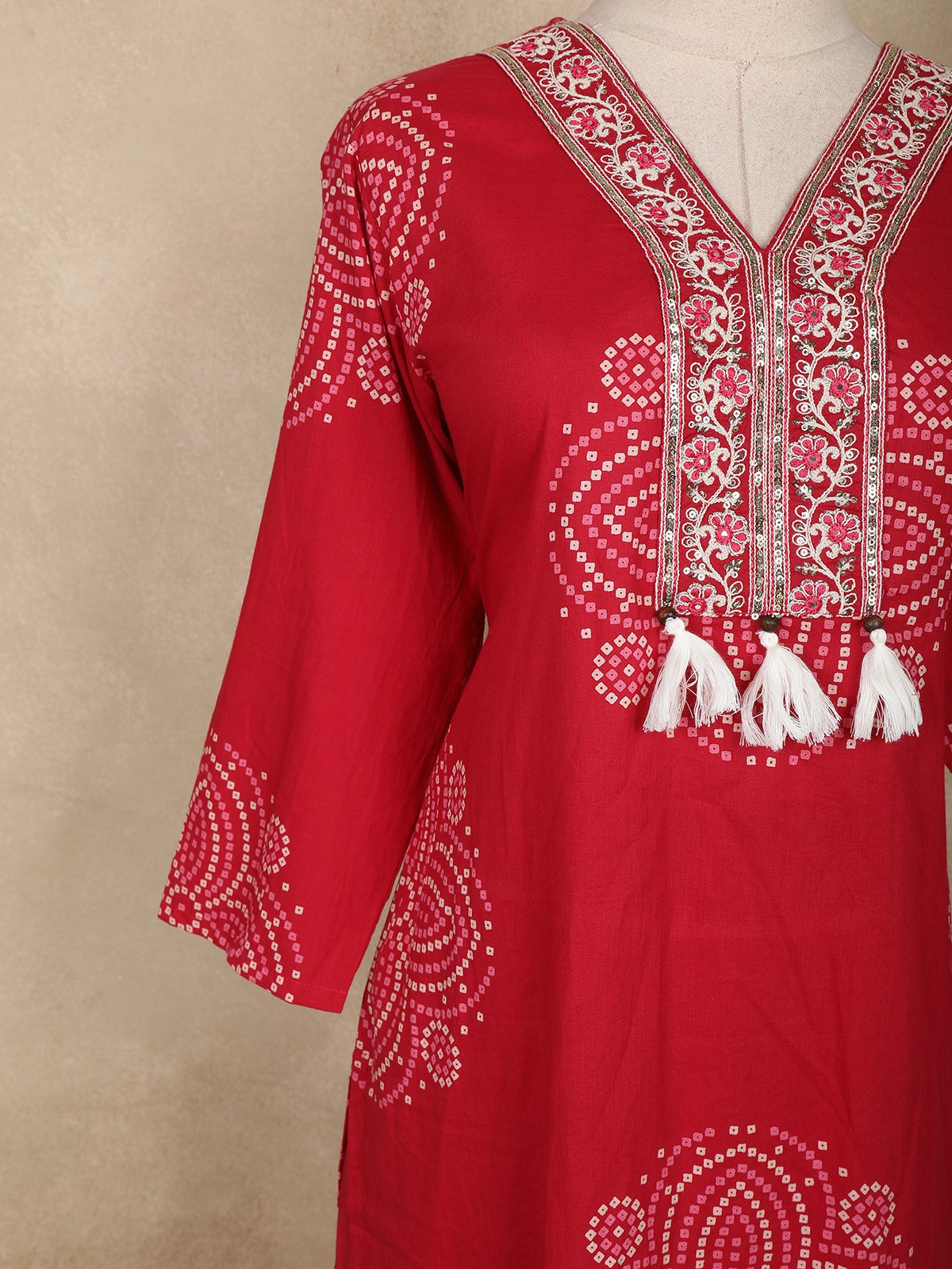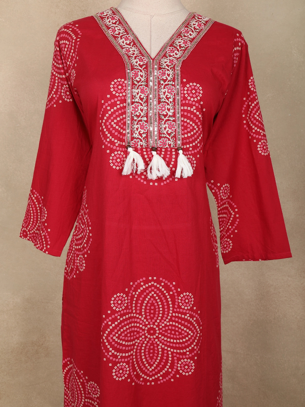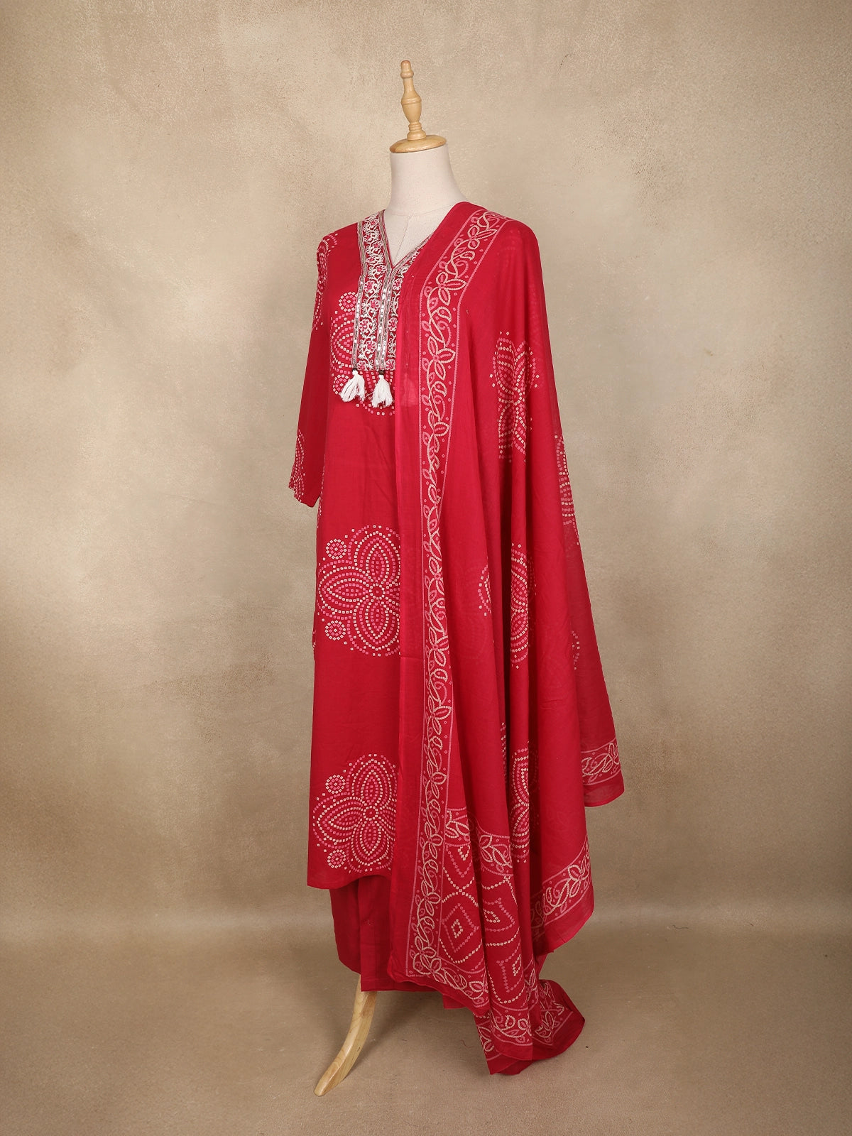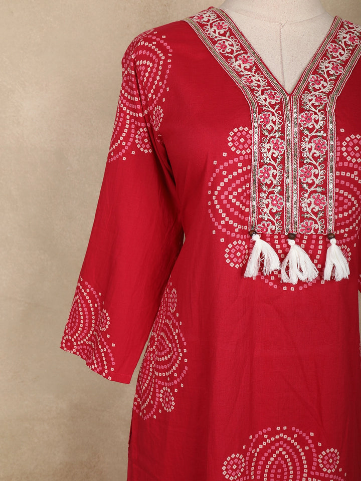 Elevate your everyday ethnic style with this elegant red Bandhani-printed cotton salwar suit, designed for comfort and charm. The straight-cut kurta features beautifully arranged Bandhani-inspired dot motifs, adding a touch of traditional artistry to its vibrant red base. The highlight of the ensemble is the intricately embroidered V-neckline, embellished with delicate resham threadwork and finished with playful tassels for a stylish ethnic touch.