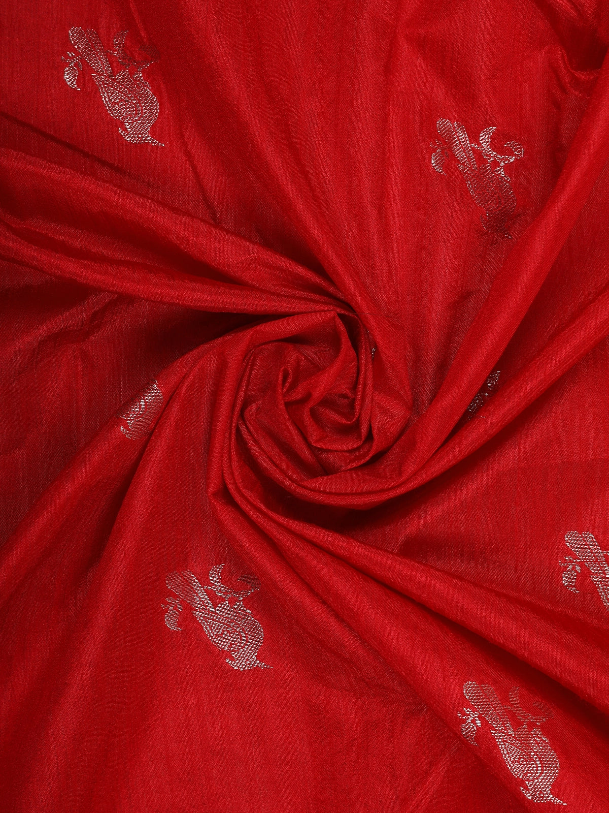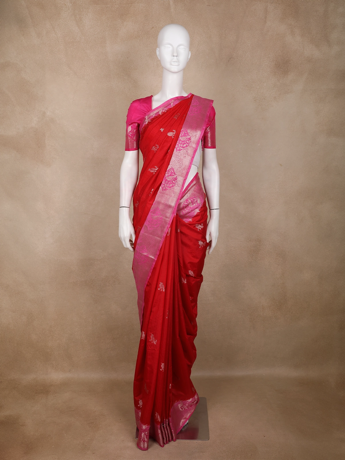 This charming Red Raw Silk Saree is woven with dainty silver zari bird motifs scattered gracefully across the body, offering a subtle traditional appeal. The highlight of the saree is its Contrast Pink Zari Border, artistically adorned with peacock and floral patterns, bringing an eye-catching contrast and a festive elegance to the drape.