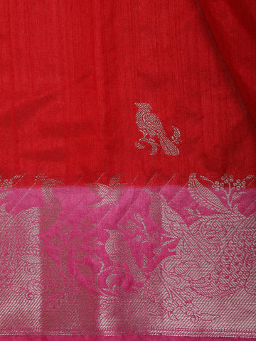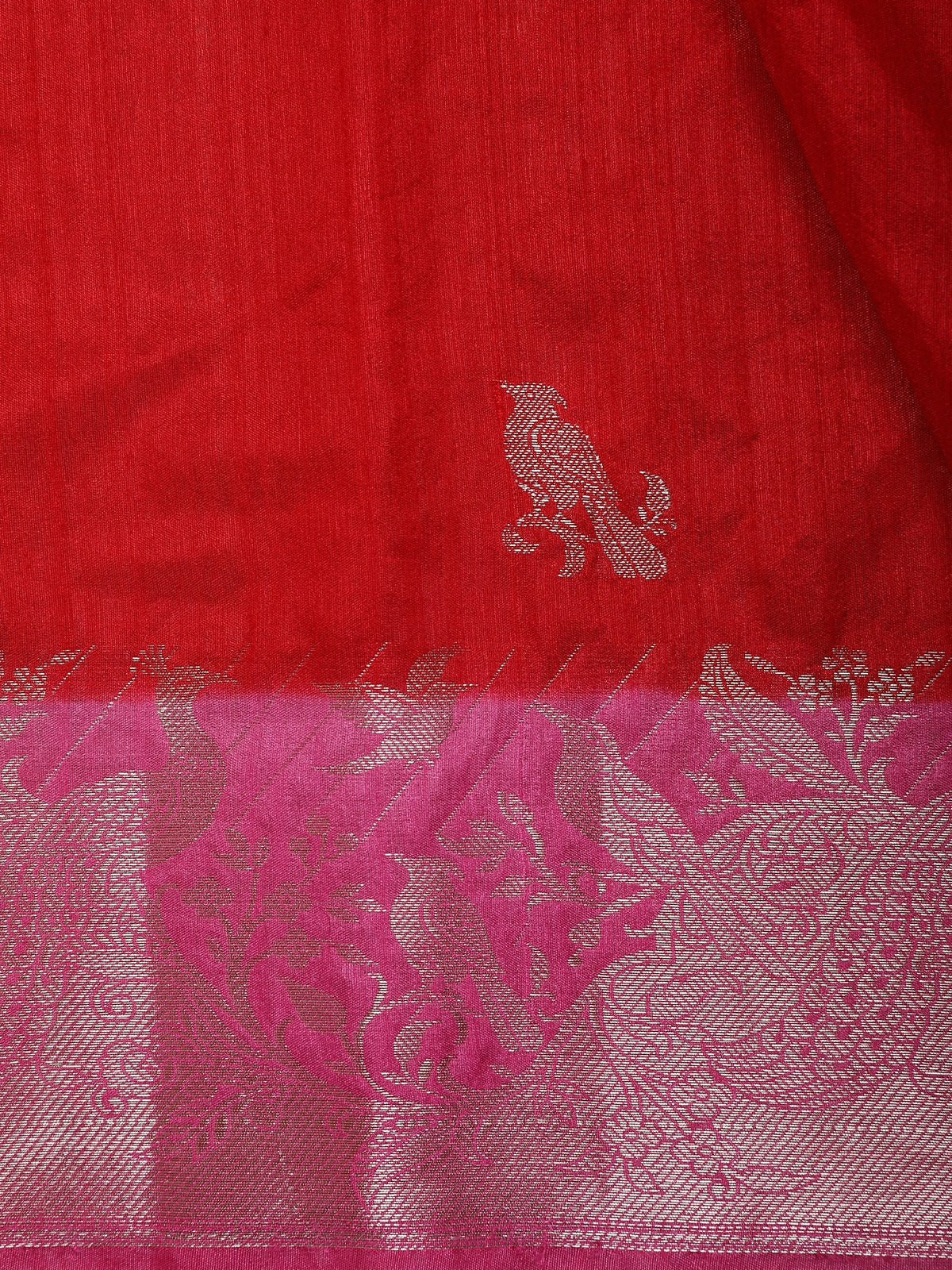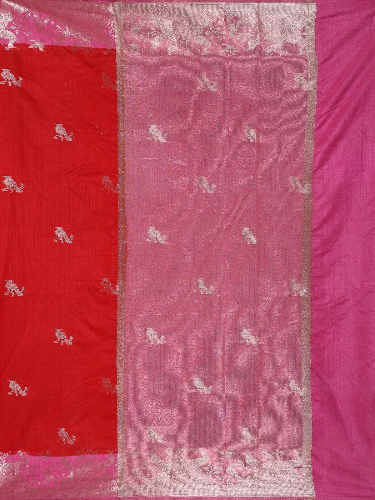 Red Birds Woven Raw Silk Saree with Contrast Pink Zari Border