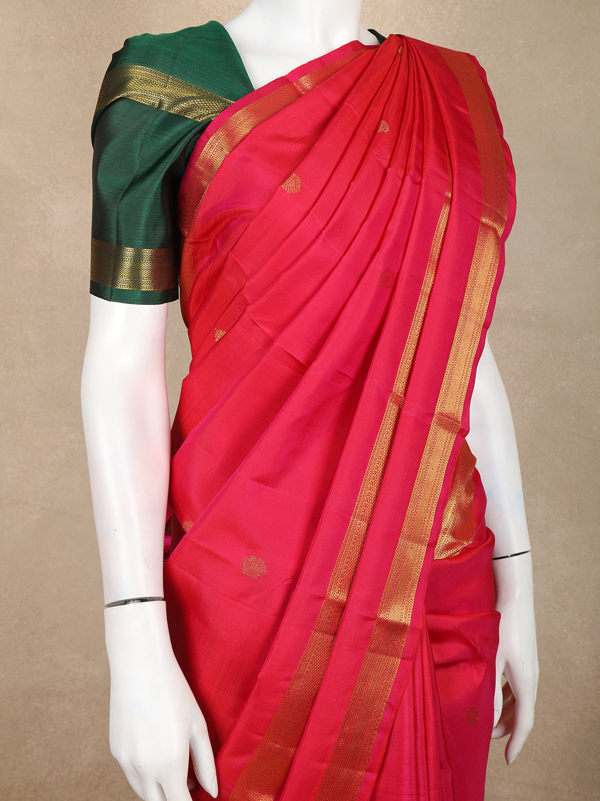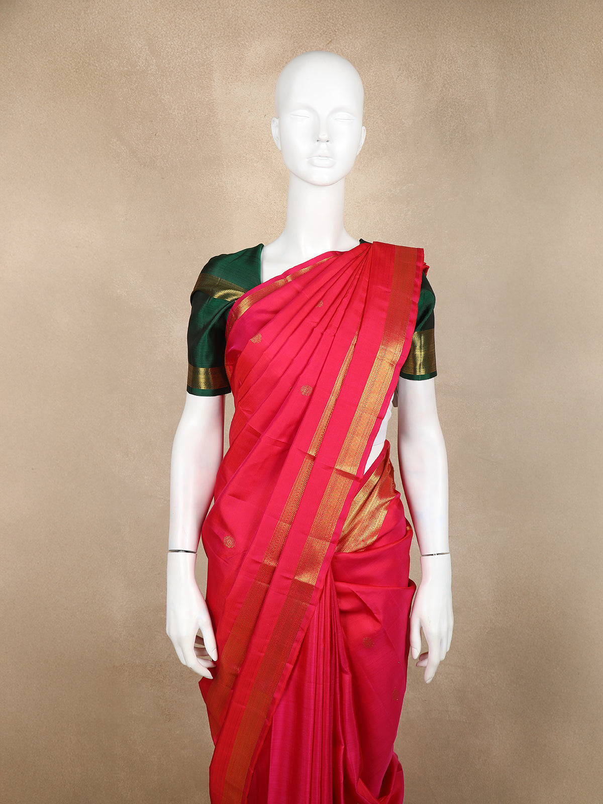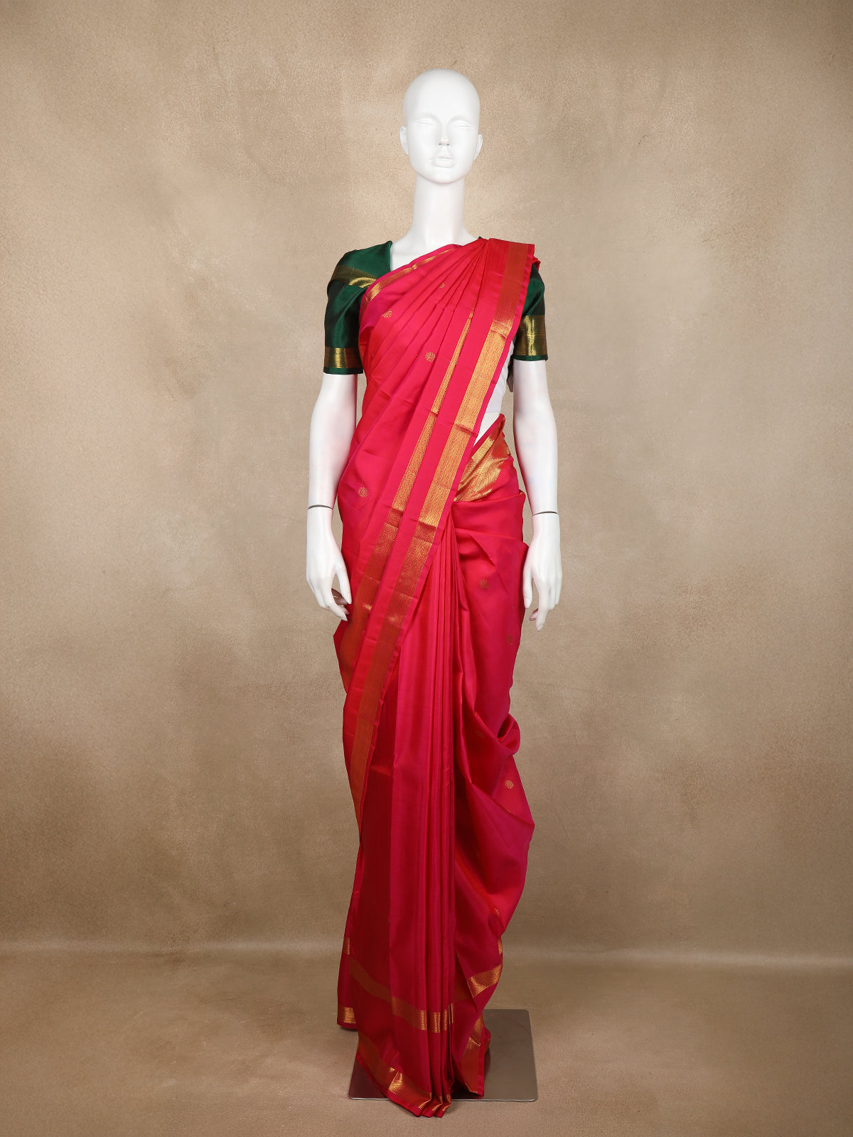 The bold and auspicious red hue symbolizes celebration and grace — making it an exceptional choice for weddings, bridal trousseau, temple visits, and all festive occasions. Enhanced with a beautiful zari border and matching pallu, this saree exudes royal charm with every drape.