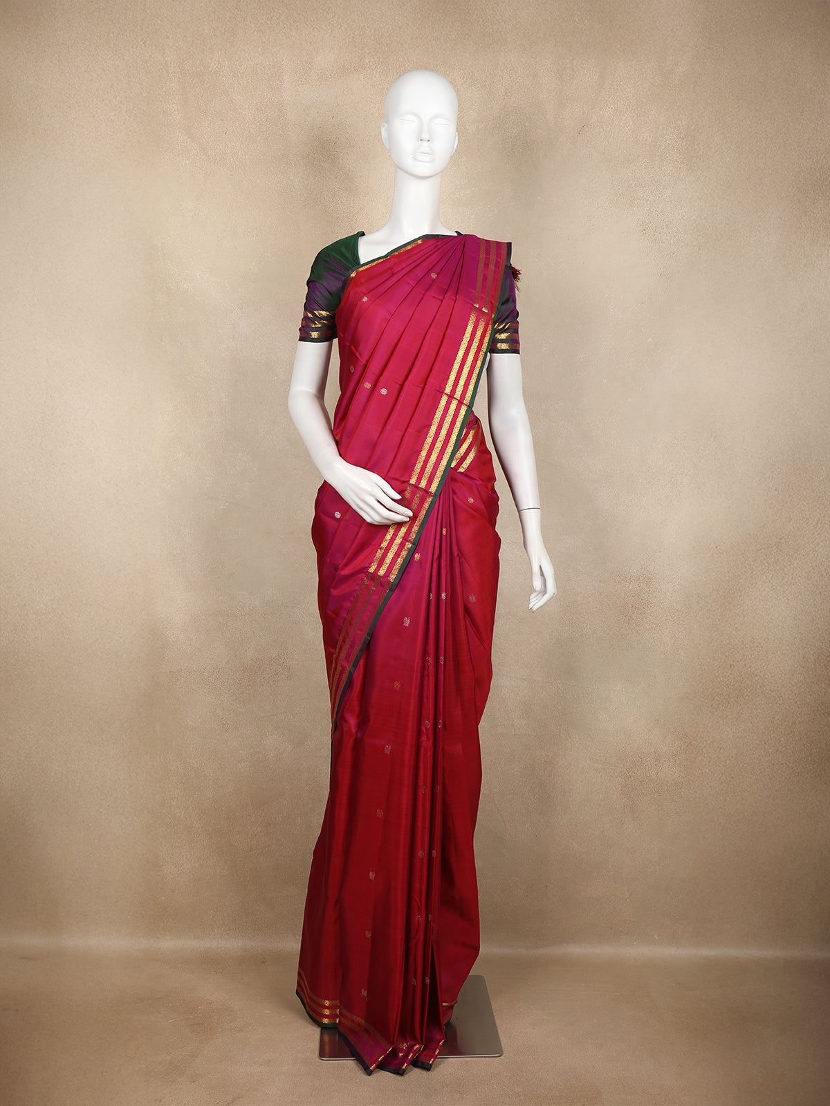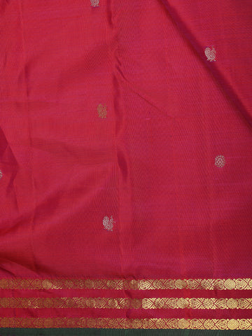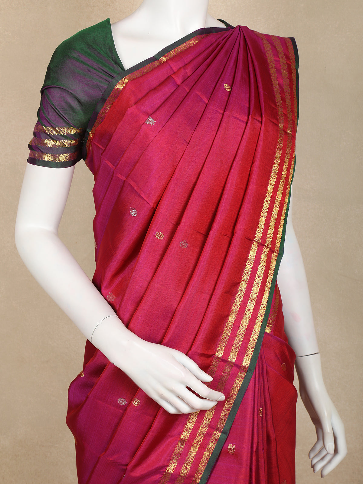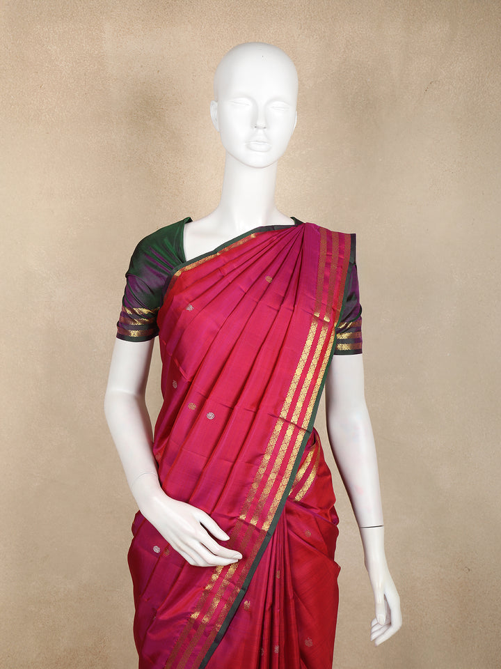 Elevate your ethnic wardrobe with this exquisite Kanchipuram Silk Saree, crafted to bring out timeless elegance in every drape. The saree features a graceful body complemented by a contrasting green blouse and pallu, creating a striking combination that exudes festive charm.