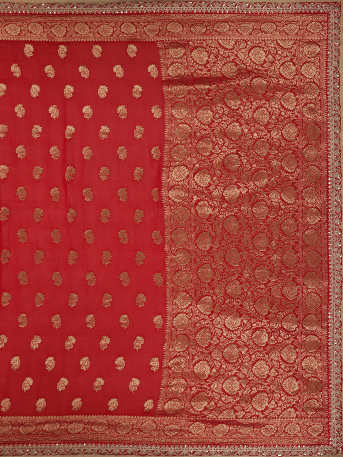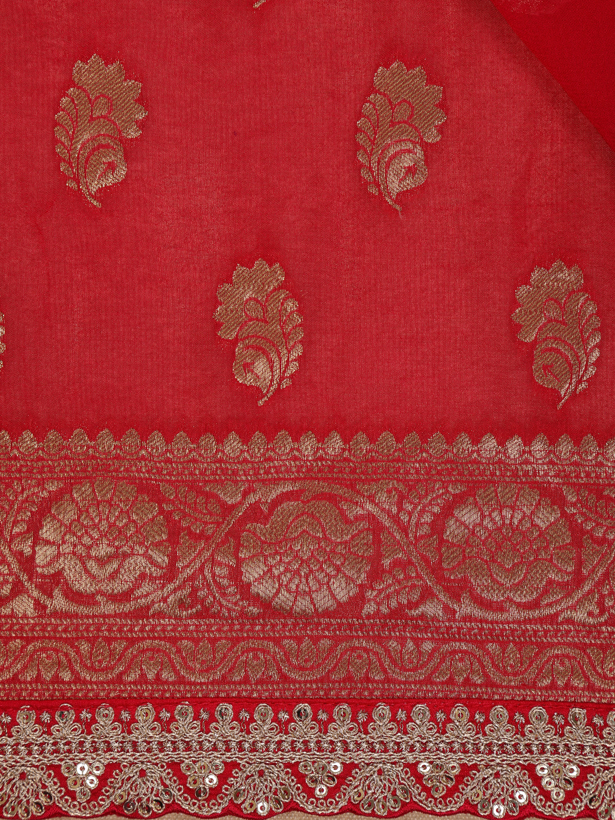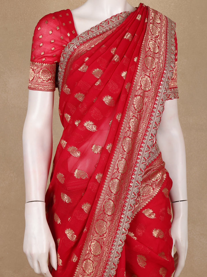 Drape yourself in regal elegance with this exquisite Red Banarasi Silk Saree, a timeless piece that beautifully reflects Indian heritage. The saree features intricate woven butta motifs that shimmer gracefully across the body, adding depth and sophistication to its rich red hue.