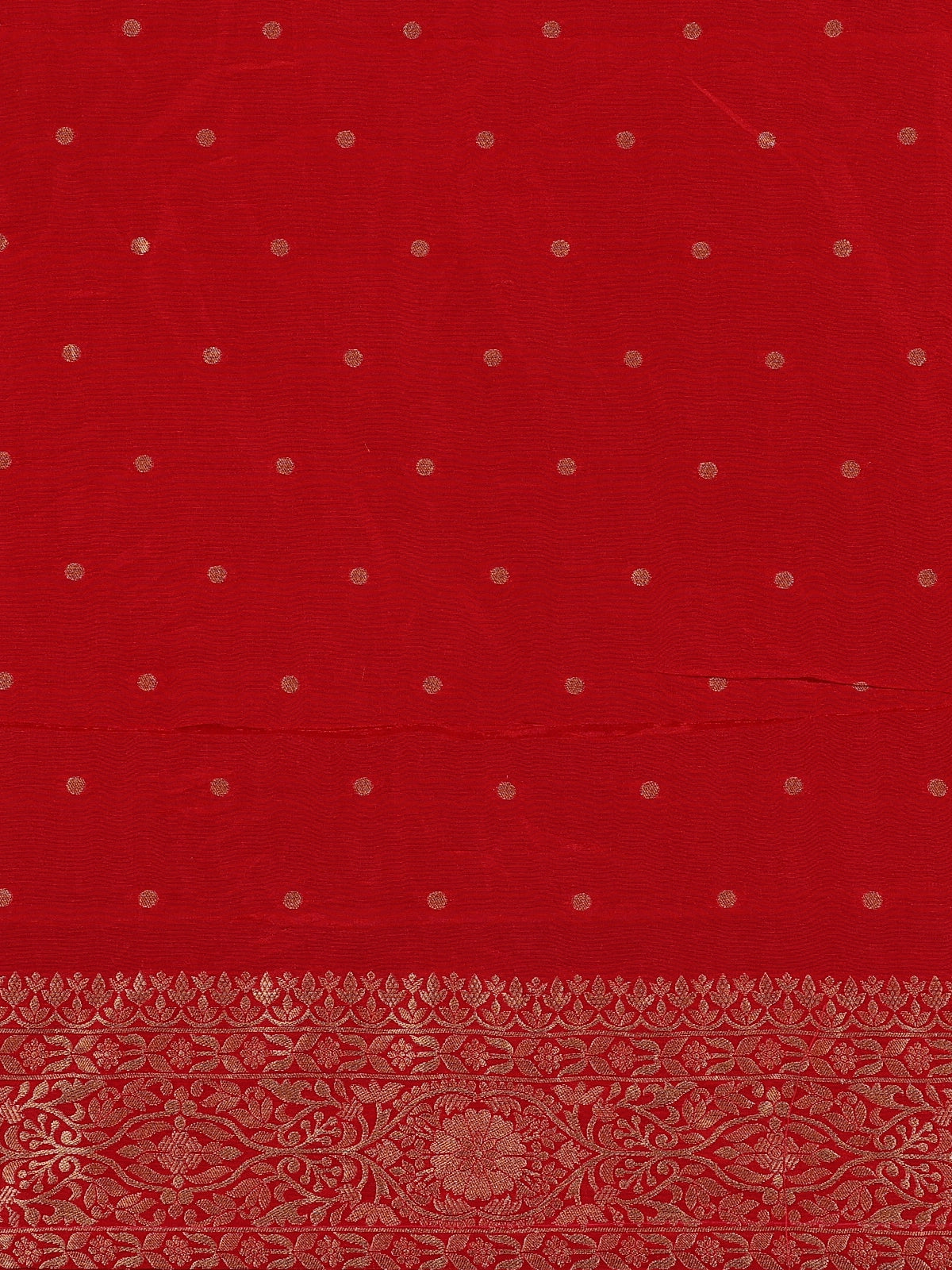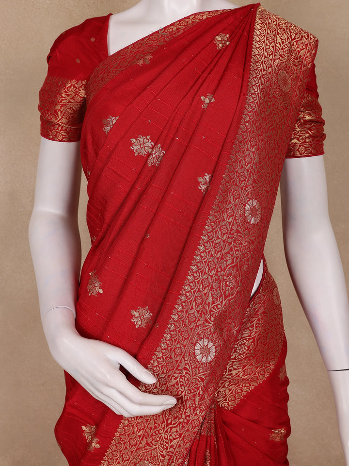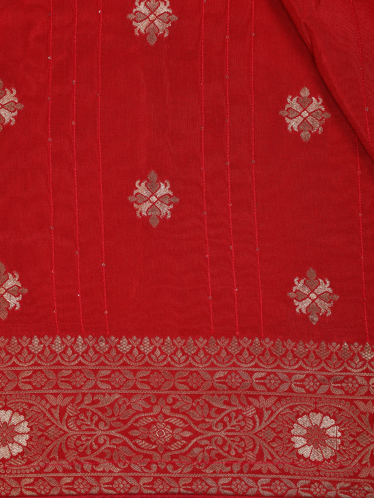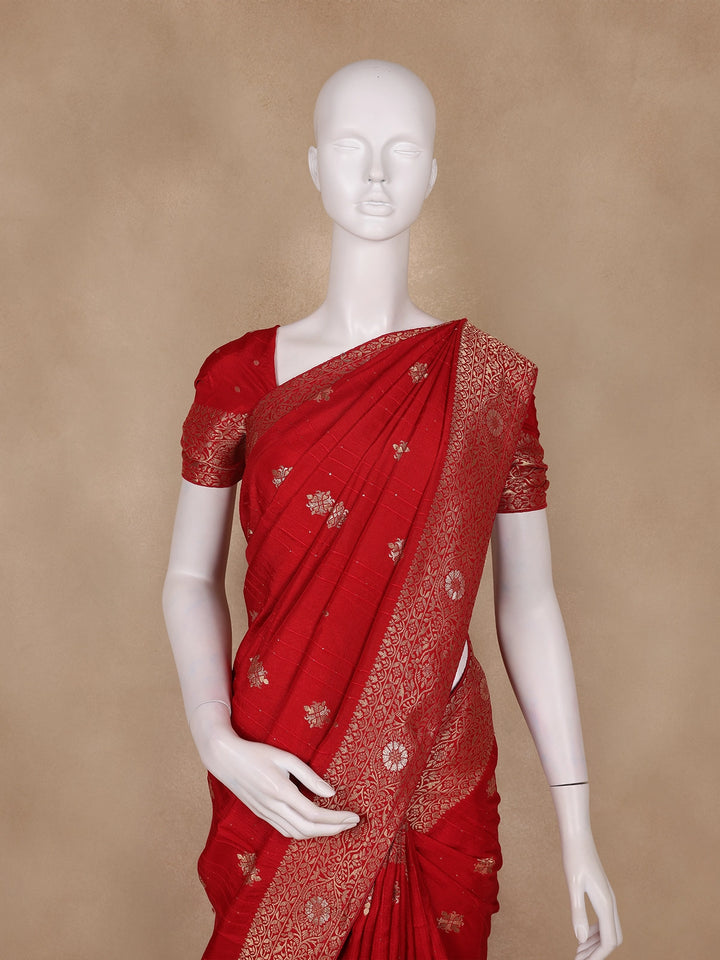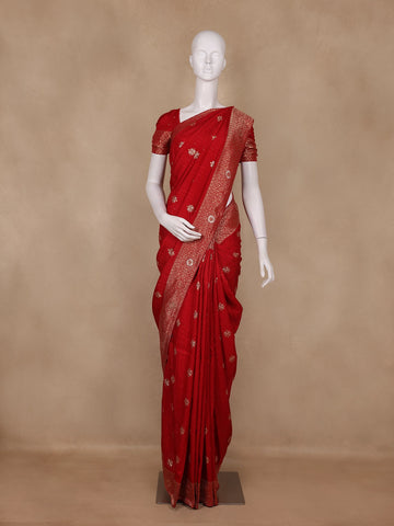 A matching blouse and pallu in red complete the ensemble, ensuring a seamless and harmonious appeal. The combination of lustrous fabric, delicate motifs, and ornate border makes this saree a true statement piece for special occasions.