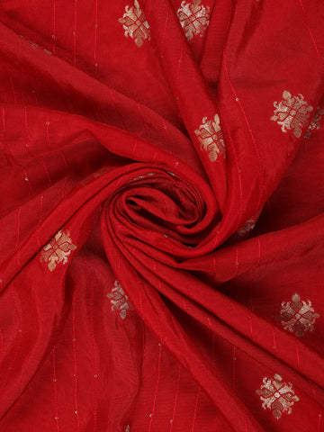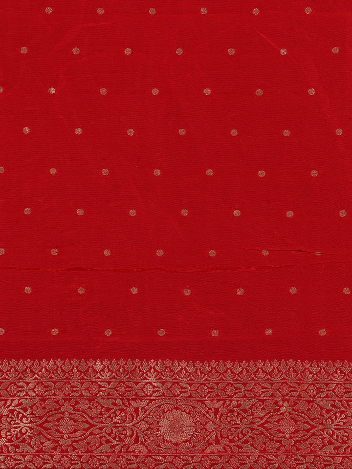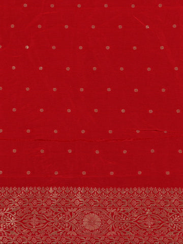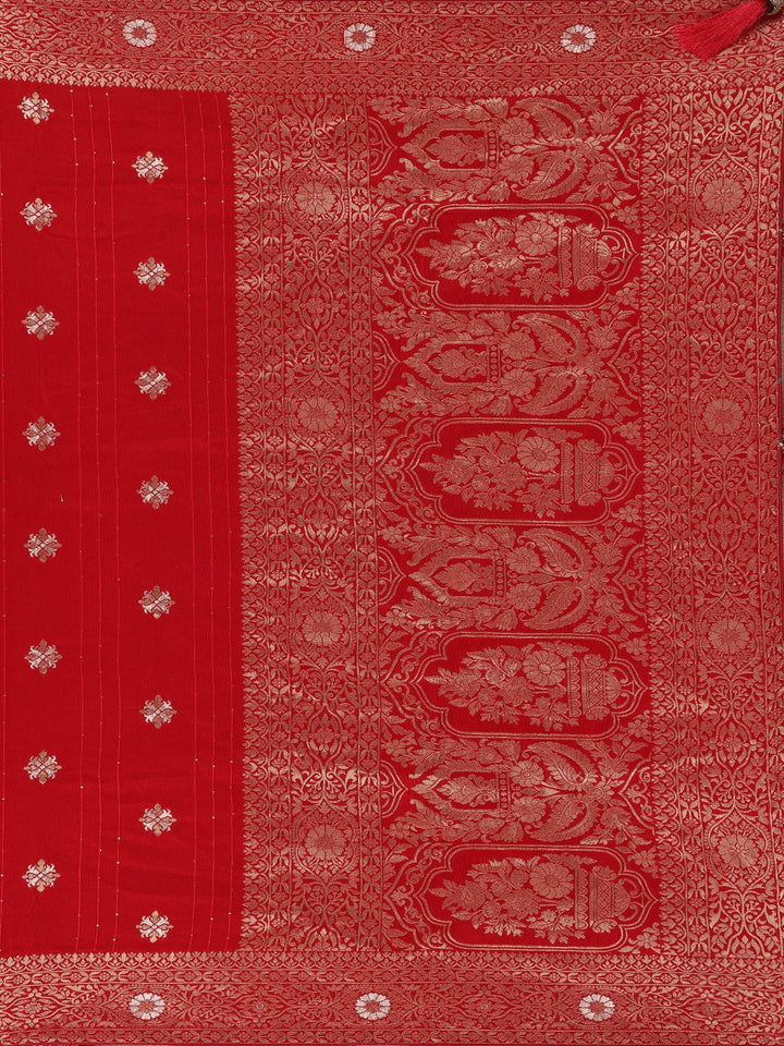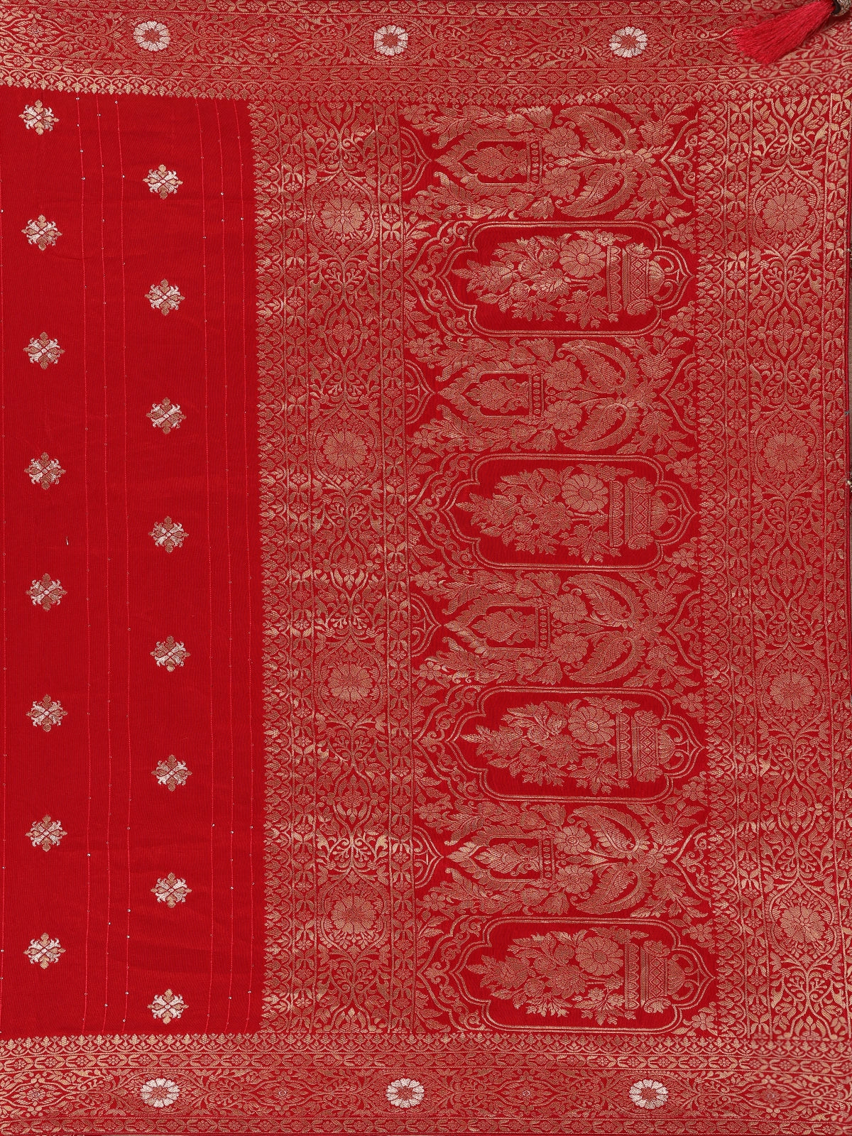 A matching blouse and pallu in red complete the ensemble, ensuring a seamless and harmonious appeal. The combination of lustrous fabric, delicate motifs, and ornate border makes this saree a true statement piece for special occasions.