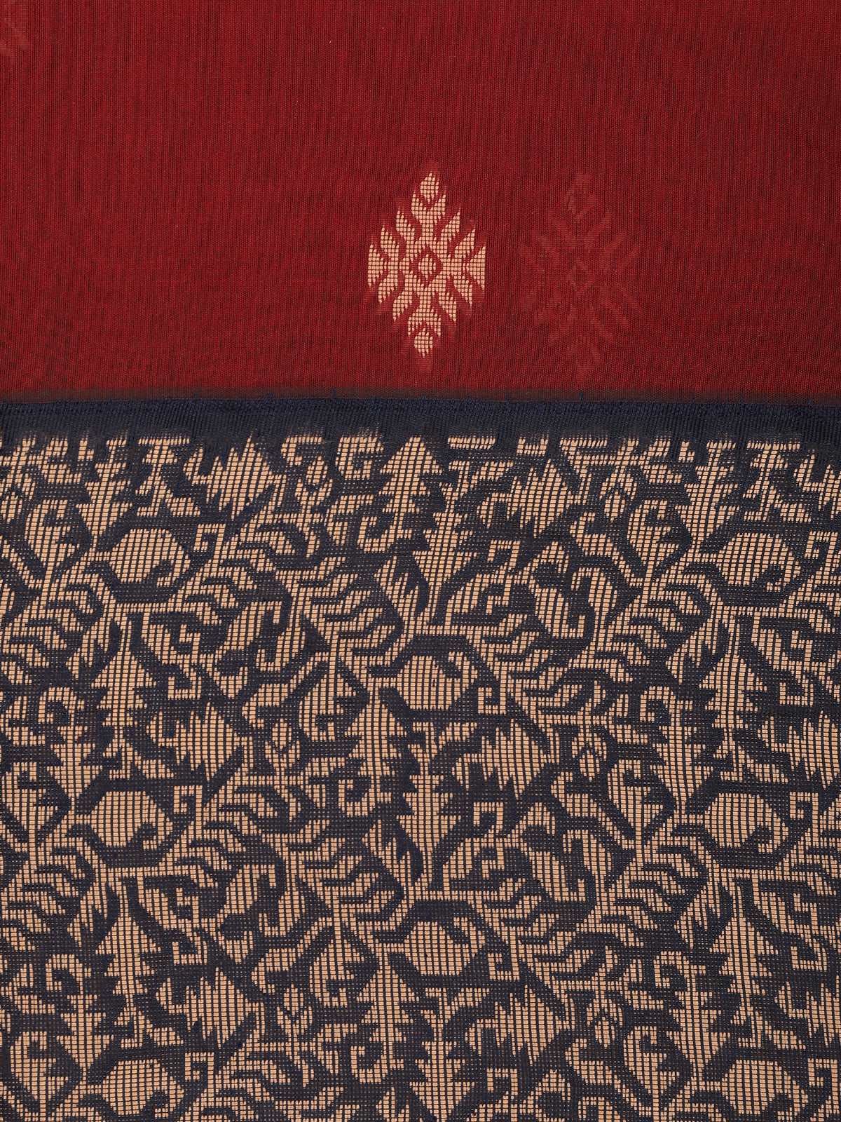 This Wine Red Geometric and Floral Woven Cotton Saree is an elegant fusion of tradition and contemporary charm. The rich wine-red body features delicate woven motifs, beautifully complemented by a contrast black pallu and border intricately detailed with floral and geometric patterns. The combination of deep tones and fine weaving makes it a versatile pick for office wear, cultural events, and casual occasions.