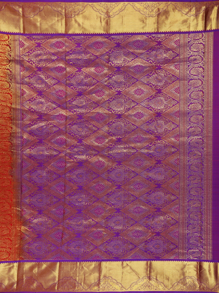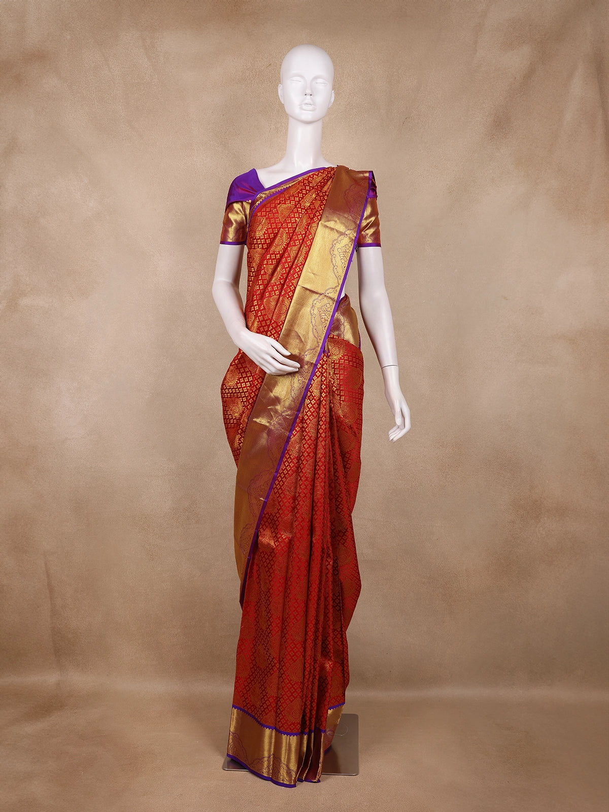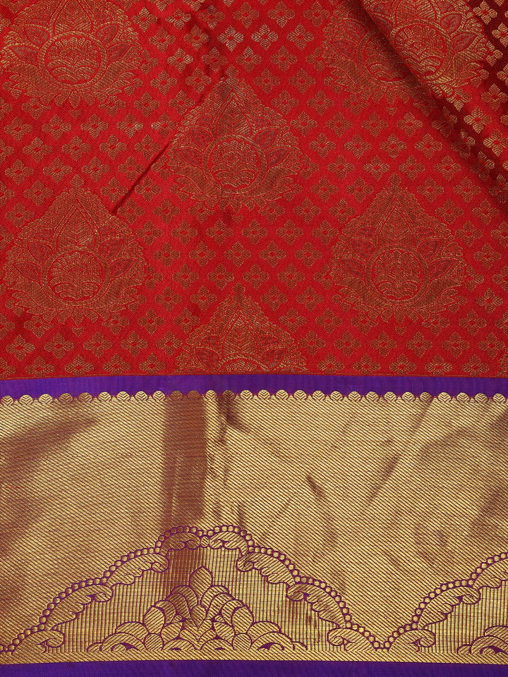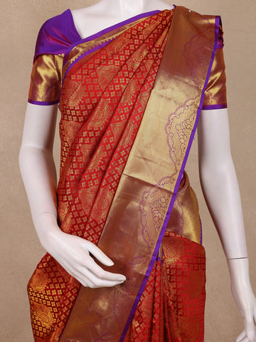 Experience the grandeur of South Indian tradition with this Red Butta Woven Design Kanchipuram Silk Saree. Crafted from rich silk, the saree features intricate gold zari motifs across the body, exuding royal allure and timeless craftsmanship. The contrast violet blouse and pallu elevate its elegance, beautifully bordered with shimmering gold zari that adds a regal charm to the drape.