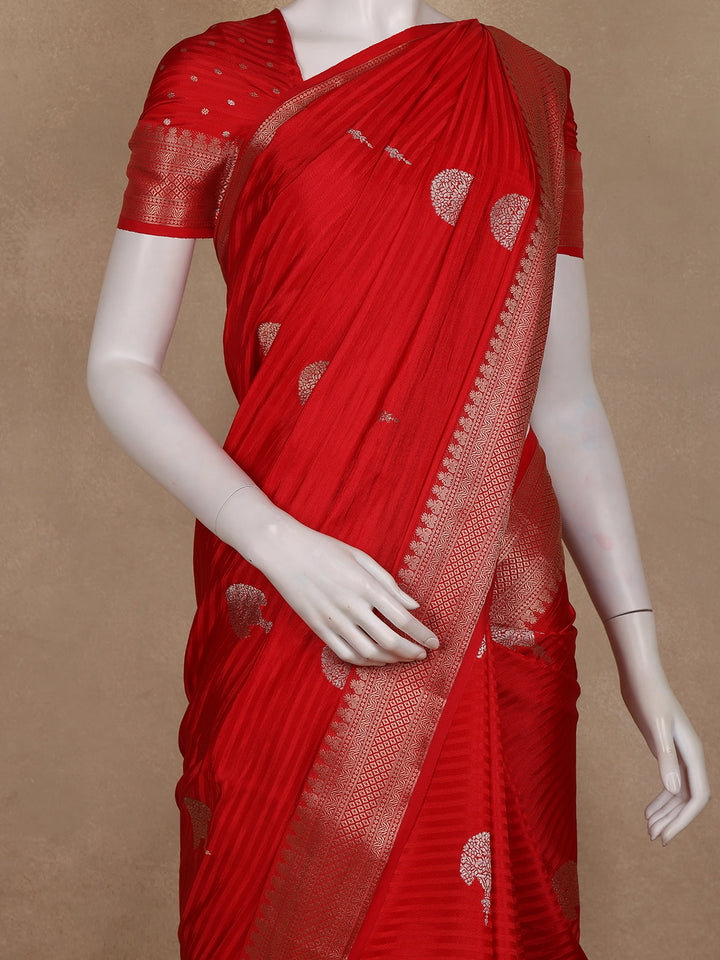 Make every moment special with this captivating Red Semi Banarasi Saree that exudes pure festive elegance. The saree features beautifully woven butta motifs in shimmering zari, delicately spread across the body, enhancing its rich and traditional charm. The subtle striped weave adds depth and a refined texture, making it visually grand yet graceful.