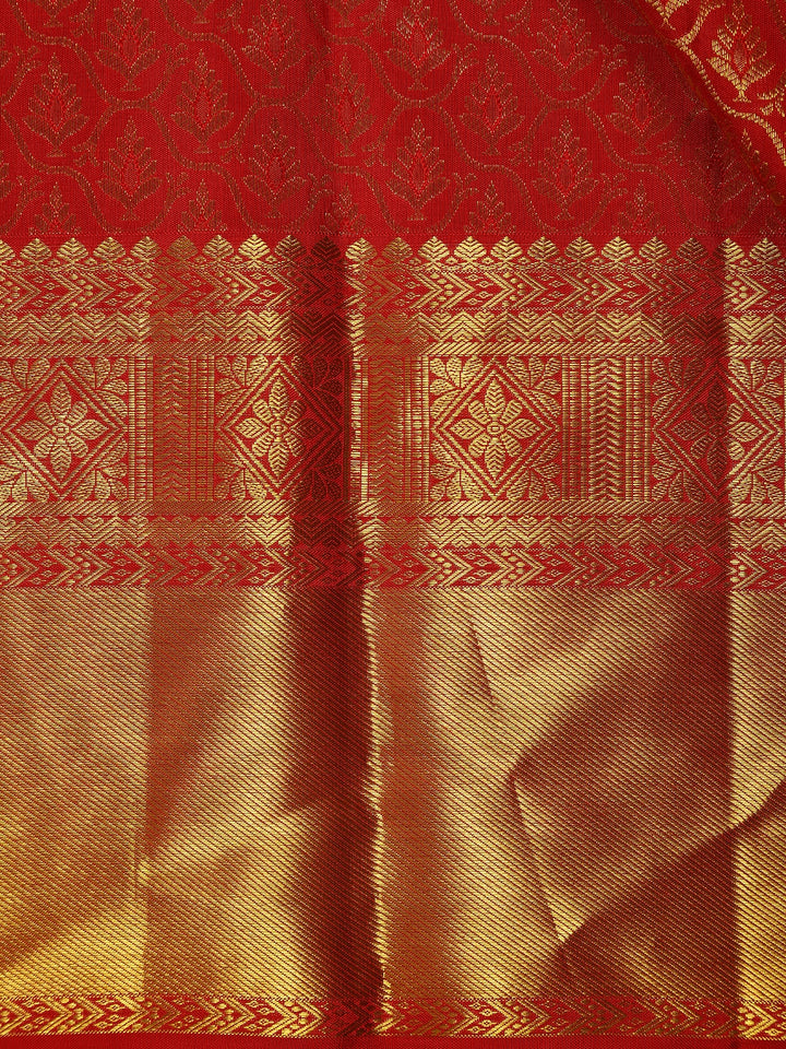 Exude regal charm with this Red Pure Kanchipuram Silk Saree, intricately woven with rich golden butta motifs across the body. The saree radiates timeless elegance with its luxurious gold zari border and matching pallu that showcases exquisite craftsmanship. Ideal for weddings and festive occasions, this saree captures the grandeur of traditional South Indian weaving artistry. The matching red blouse piece enhances its classic appeal, making it a perfect drape for those who adore traditional opulence.