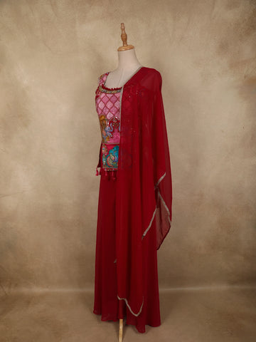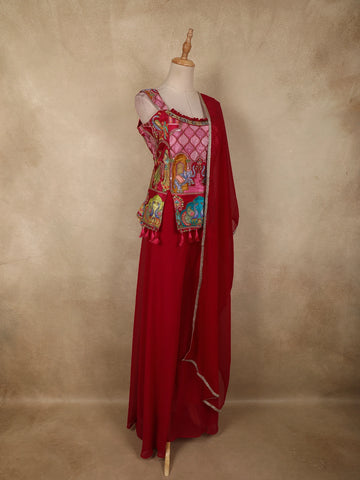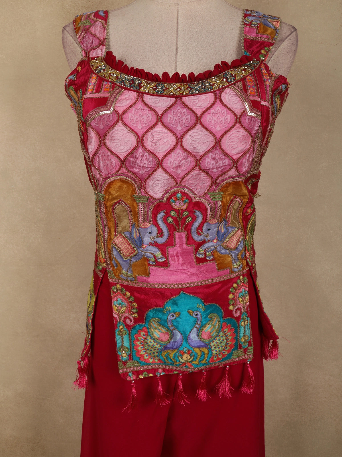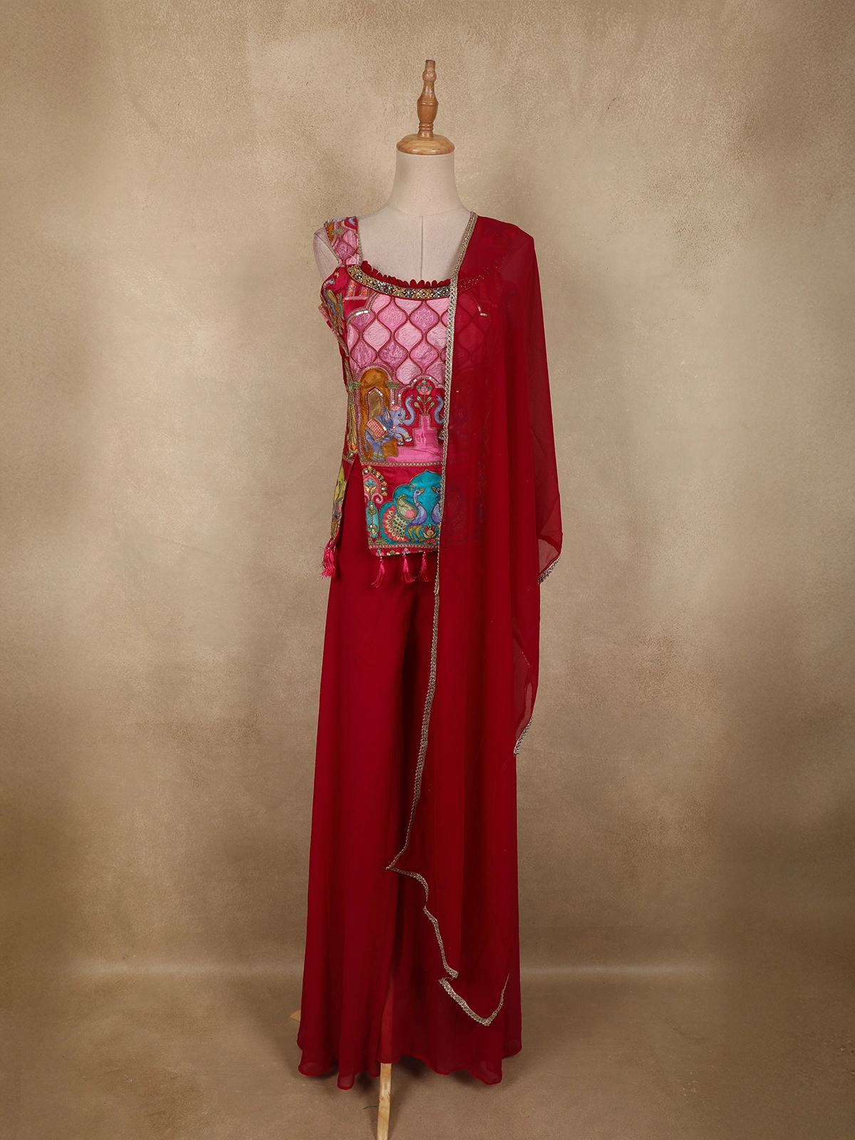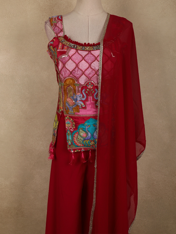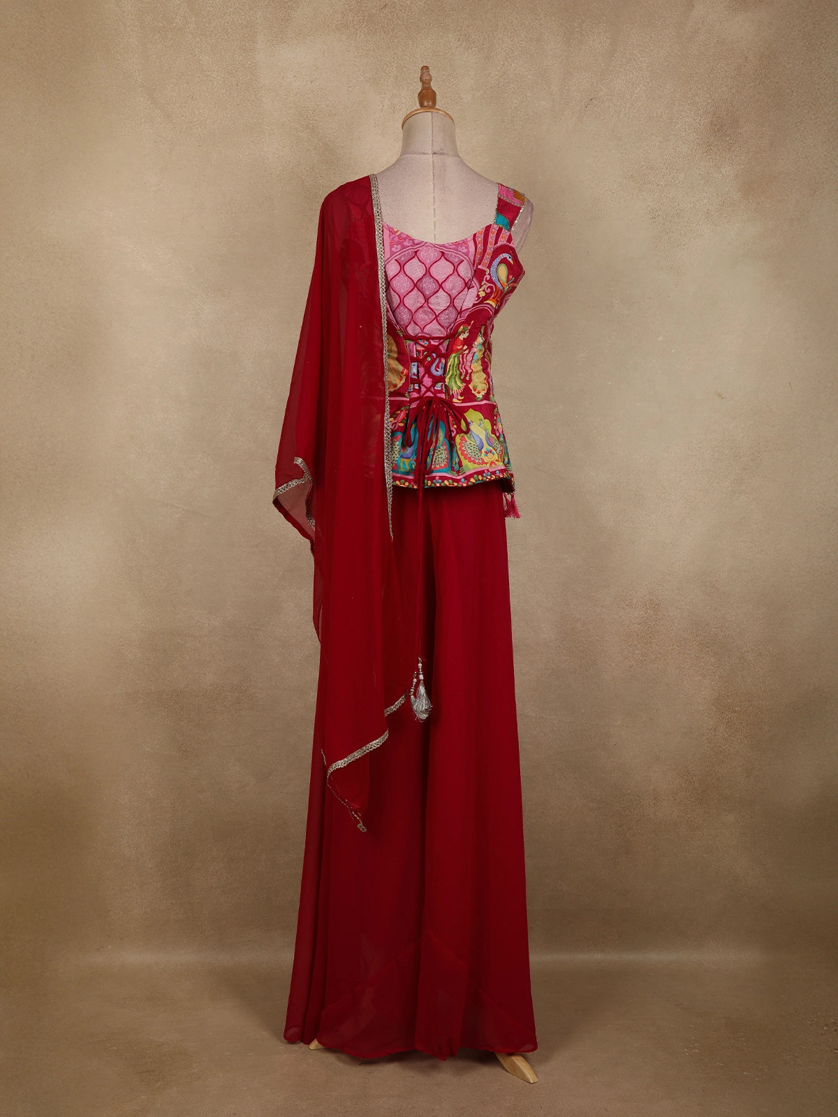 Red Embroidered Animal Printed Georgette Palazzo Suit