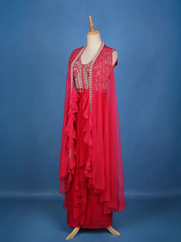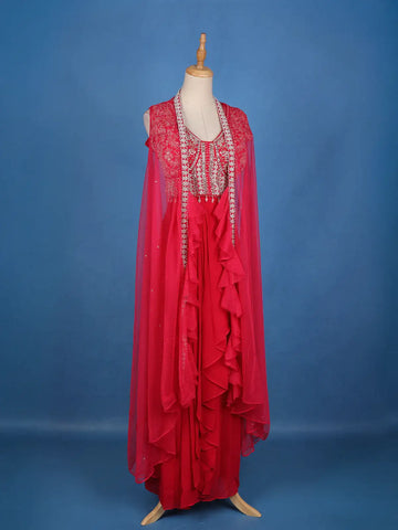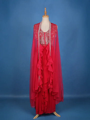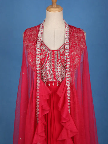 Step into the spotlight with this captivating Red Georgette Party Lehenga, designed to radiate glamour and sophistication. The lehenga features a flowy georgette base enhanced with a layered ruffle style that adds a modern twist to traditional elegance. Paired with a beautifully crafted blouse adorned with intricate sequin and embroidery work, this ensemble is further elevated by a sheer embroidered cape that lends it a contemporary and regal charm.