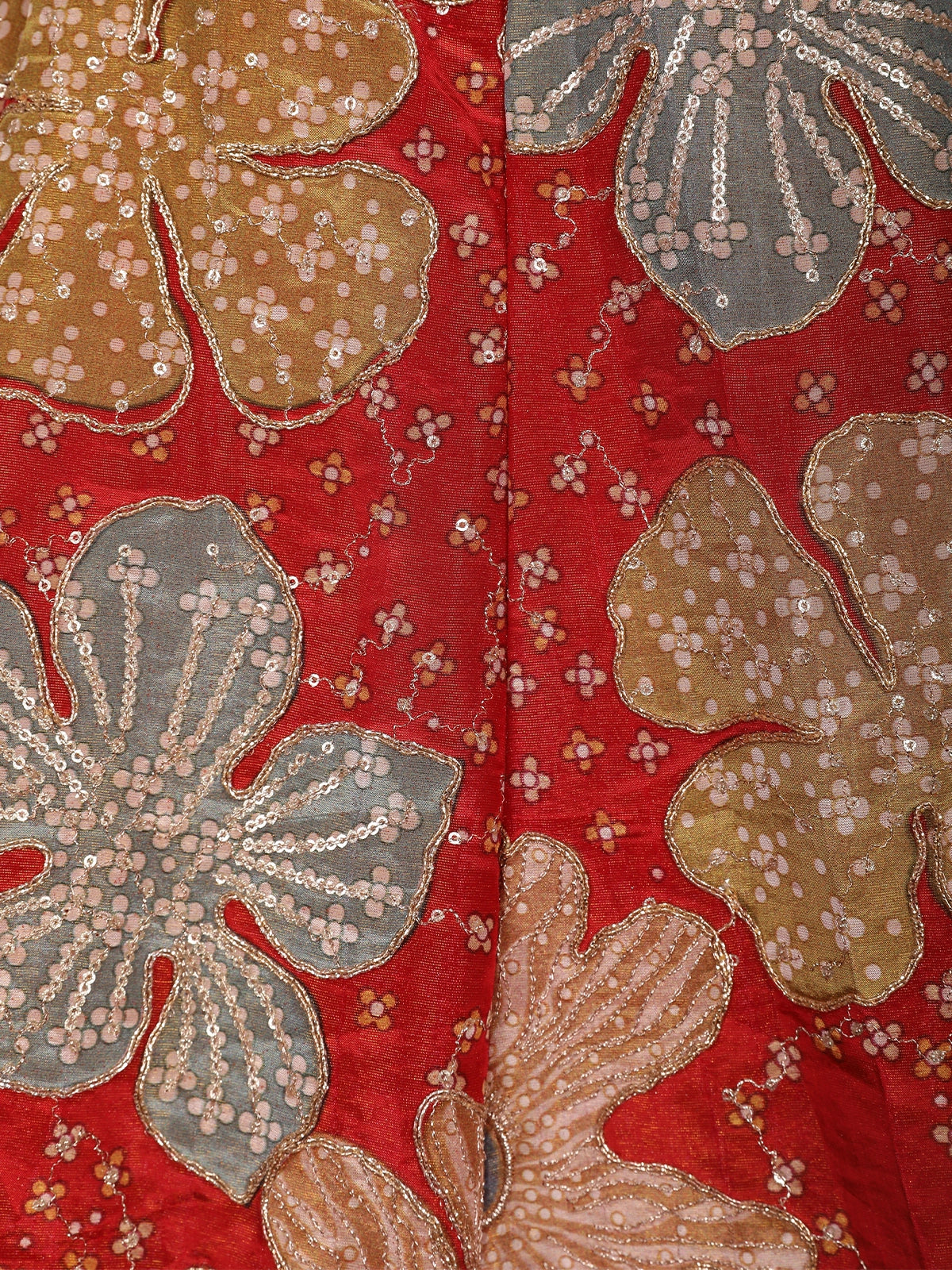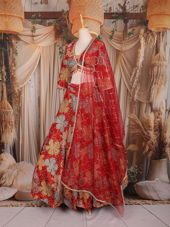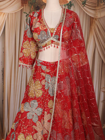 Red Floral Applique Embroidered Tissue Silk Lehenga With Dupatta