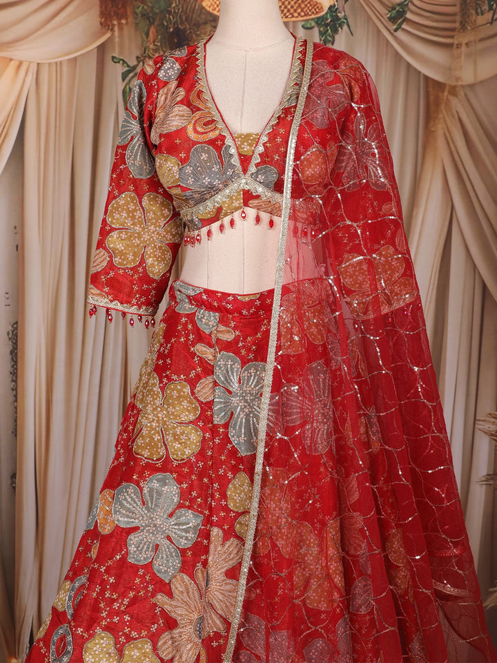 The flared lehenga showcases oversized floral motifs in pastel tones that stand out beautifully against the red backdrop. Paired with a soft net dupatta featuring sequin embroidered patterns and a shimmer edging, the ensemble feels complete and elegant.
