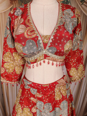 This lehenga set brings a bold and festive charm with its vibrant red base and beautifully crafted floral applique embroidery. The tissue silk fabric gives a subtle shimmer and a graceful structure, making the outfit look rich without being heavy. The blouse features a deep V-neckline and 3/4th sleeves, finished with delicate bead tassel edging that adds playful movement.
