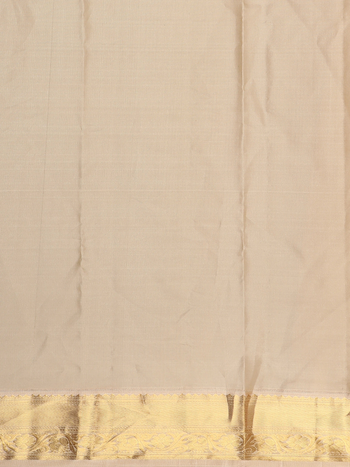 Enhancing its grandeur is a rich gold zari woven border, lending a regal touch and elegant definition to the saree. The look is completed with a contrast beige pallu, finely woven with zari patterns, creating a graceful balance between vibrancy and sophistication. A matching contrast beige blouse further elevates the ensemble, making it a complete festive-ready attire.