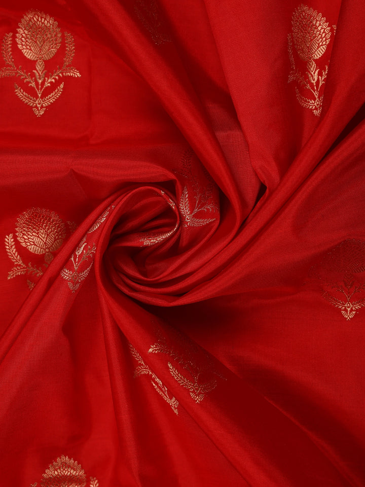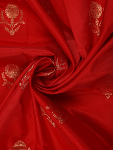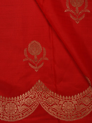 Embrace regal elegance with this Red Floral Butta Woven Katan Banarasi Saree, a masterpiece that reflects the grandeur of Banaras craftsmanship. Woven from luxurious Katan silk, it features intricate gold zari floral buttas that shimmer gracefully against the rich red base — a perfect symbol of timeless tradition and sophistication.