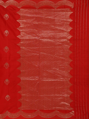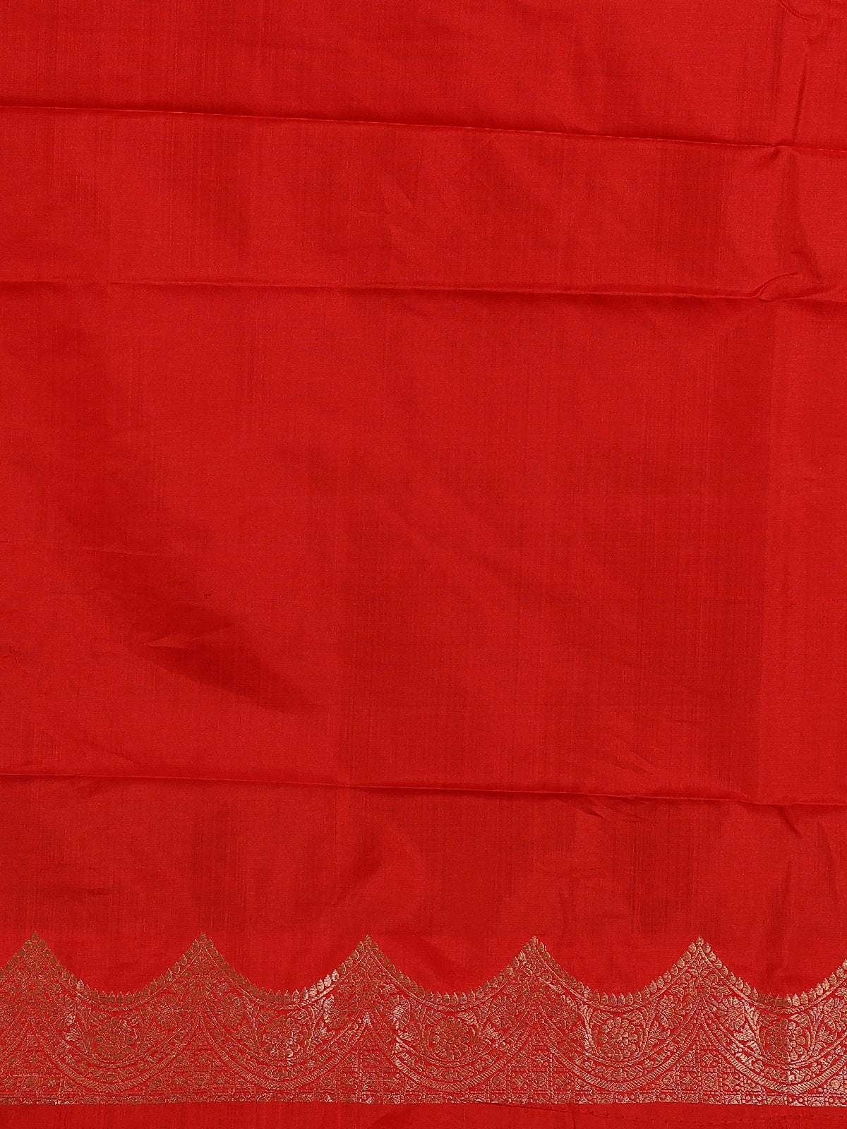 The matching red blouse and pallu create a seamless harmony, while the zari border frames the saree with ornate finesse. Its lustrous texture and graceful drape make it an ideal choice for weddings, festive celebrations, or traditional gatherings where opulence meets comfort.