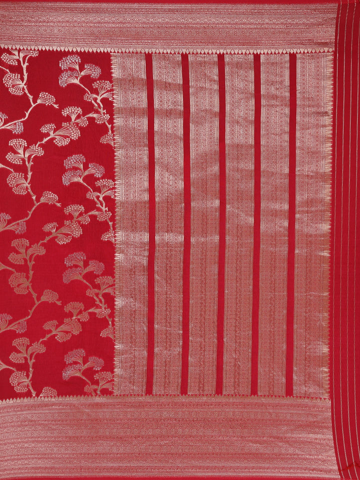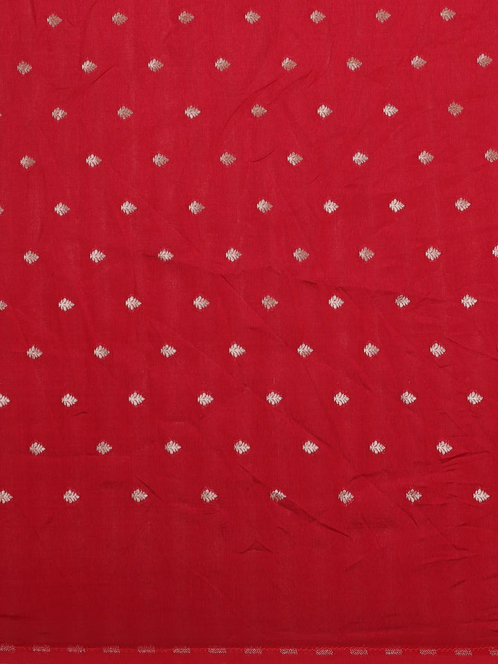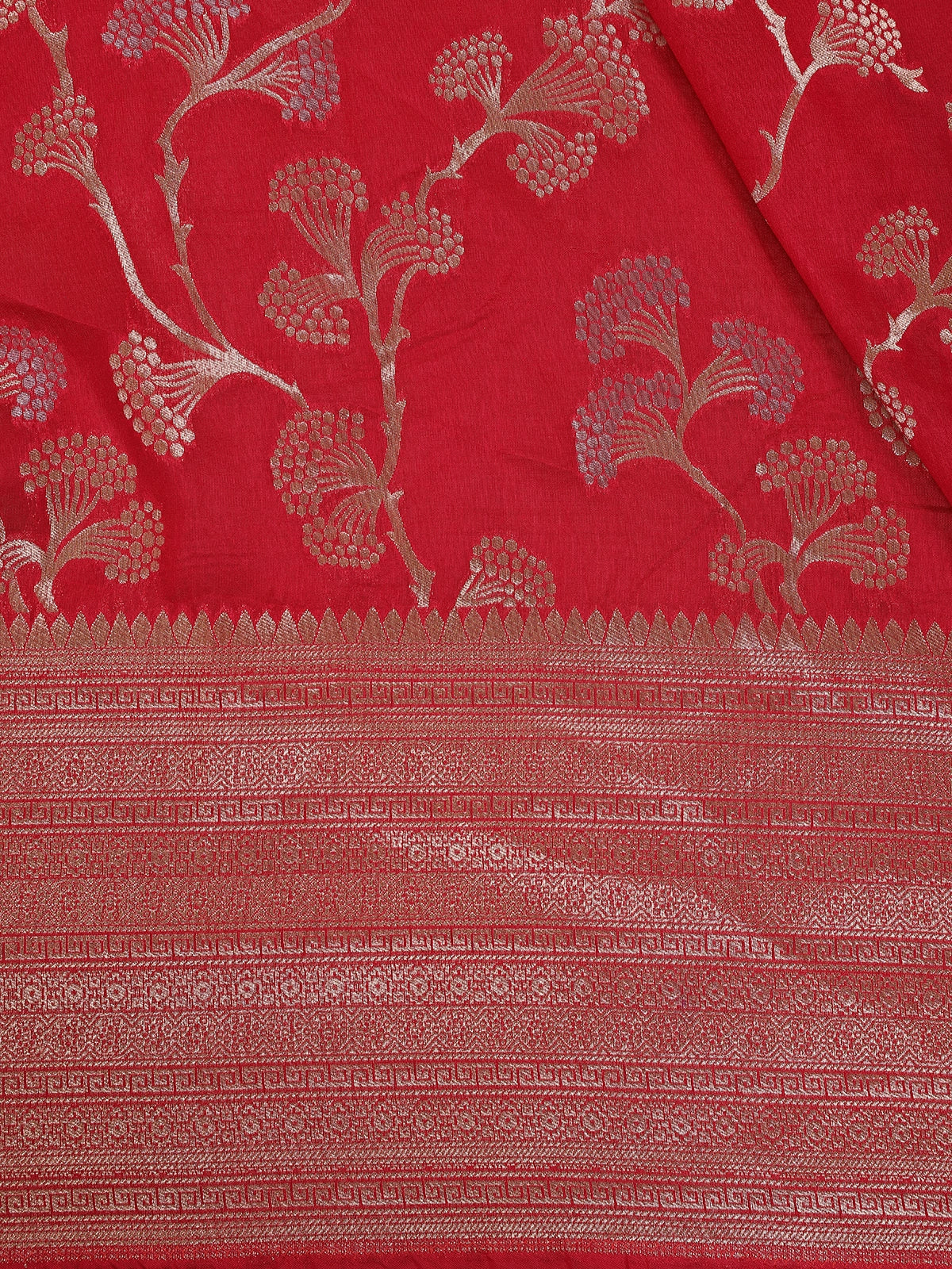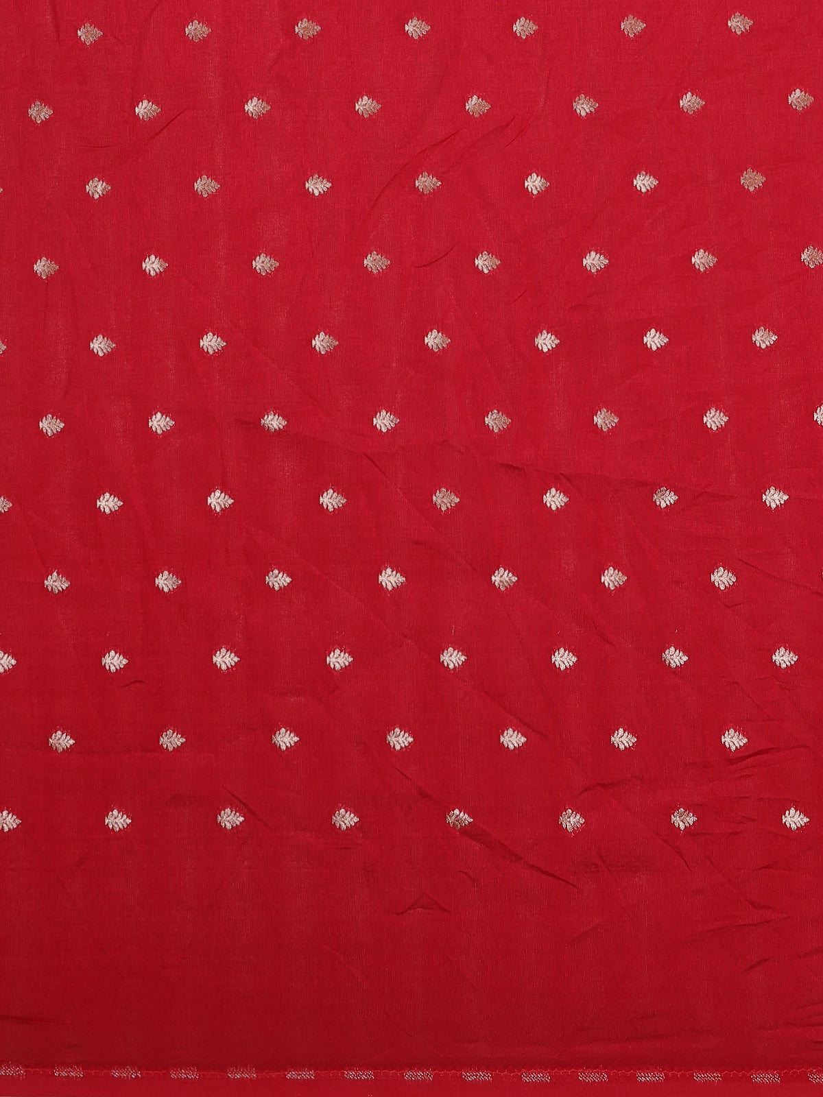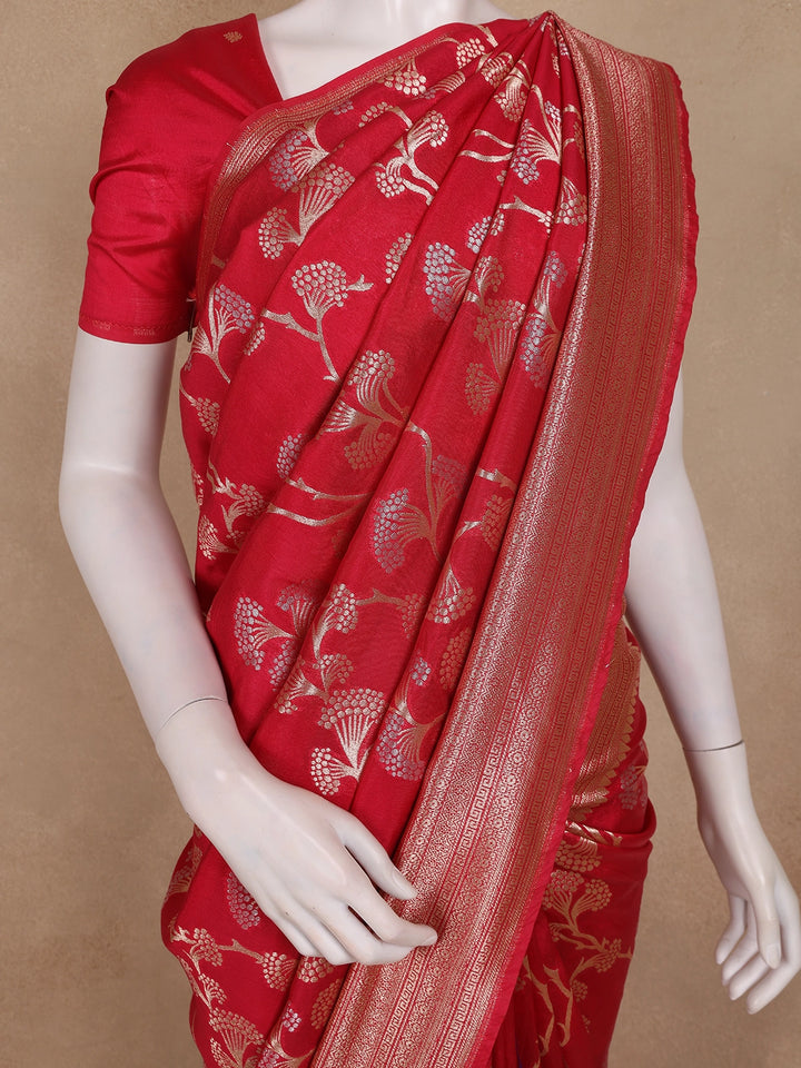 The saree is completed with a matching red blouse and pallu, maintaining a harmonious tone that exudes sophistication. The intricately woven zari border adds a touch of grandeur, lending the drape a royal edge that’s perfect for weddings, festive celebrations, and traditional occasions.