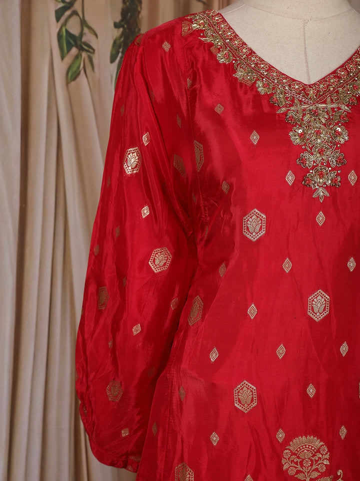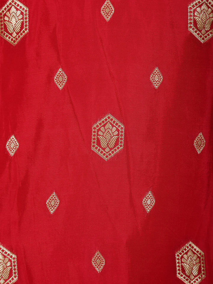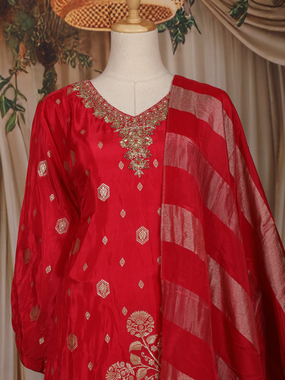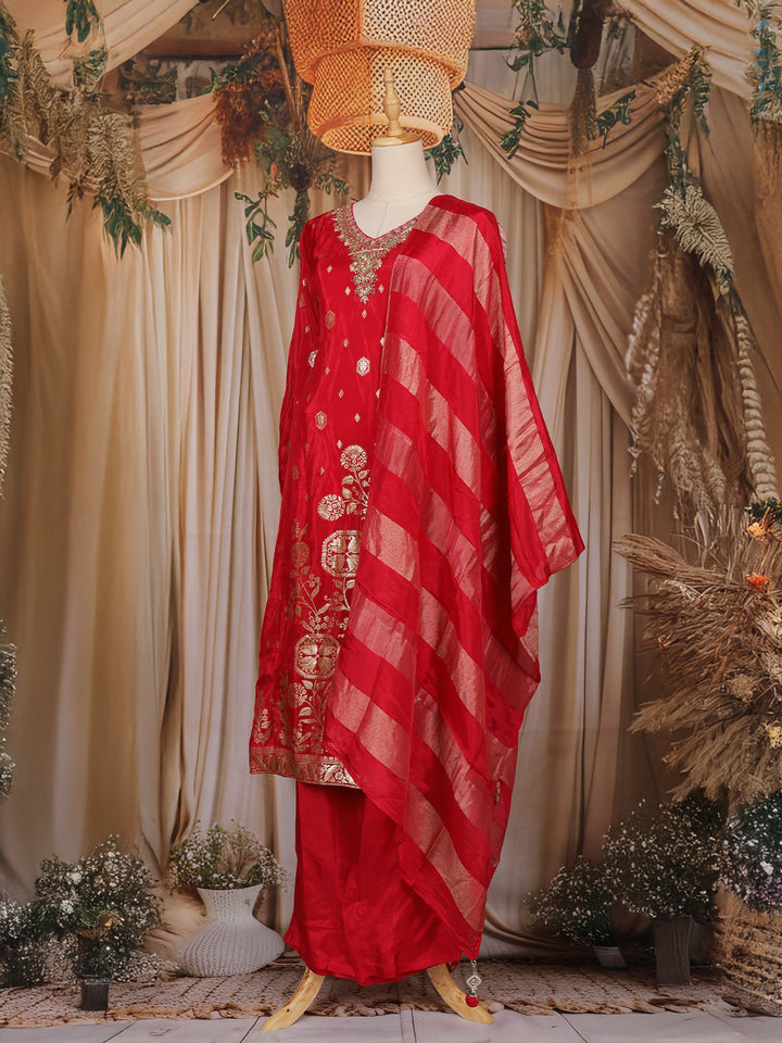 Step into regal elegance with this captivating Red Floral Design Banarasi Silk Salwar Suit, a timeless ensemble that embodies grace and sophistication. Crafted from luxurious Banarasi silk, this suit showcases floral woven motifs that reflect the grandeur of traditional Indian craftsmanship. The glossy silk fabric lends a rich sheen, while the floral design adds a feminine charm perfect for festive and celebratory occasions.