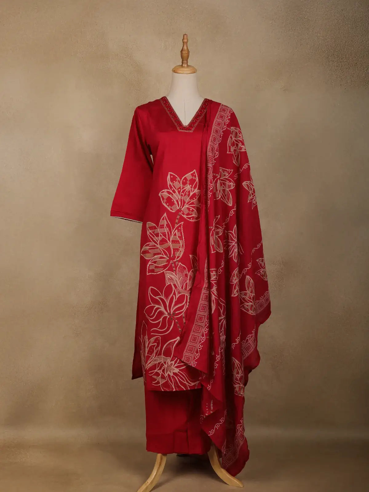Bright and elegant, this Red Floral Designed Cotton Salwar Suit is the perfect blend of everyday comfort and festive charm. Crafted from breathable and lightweight cotton fabric, the straight-cut kurta features vibrant floral print designs that stand out against the rich red base.
