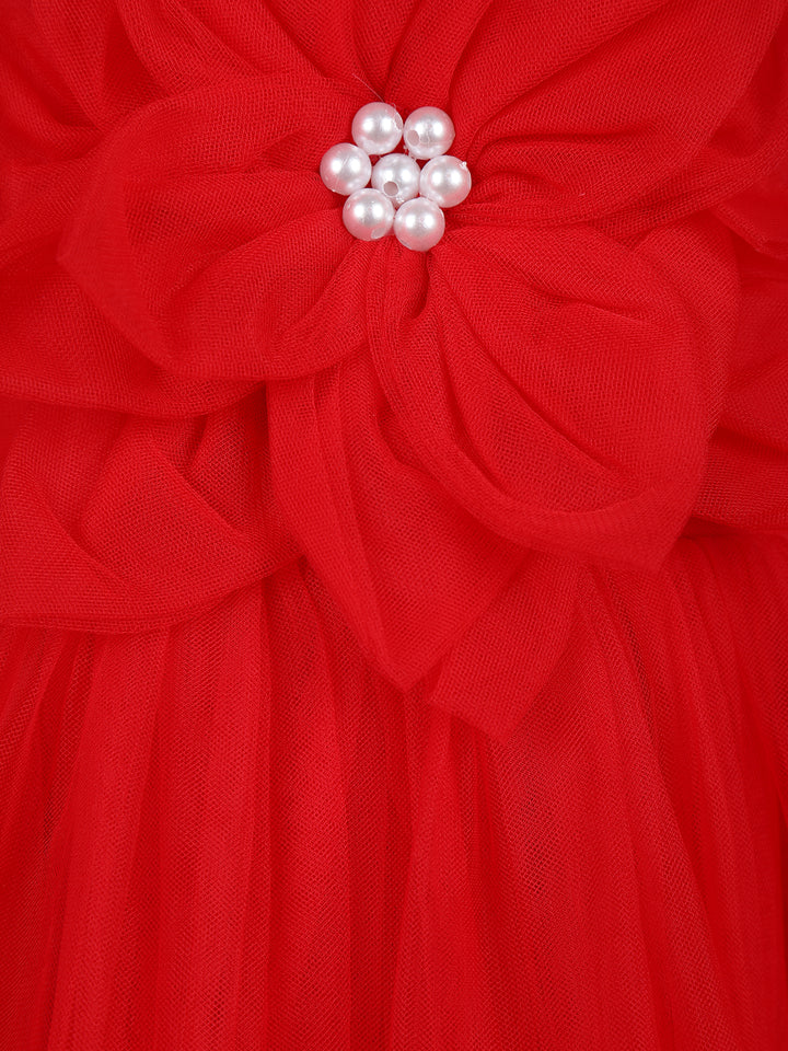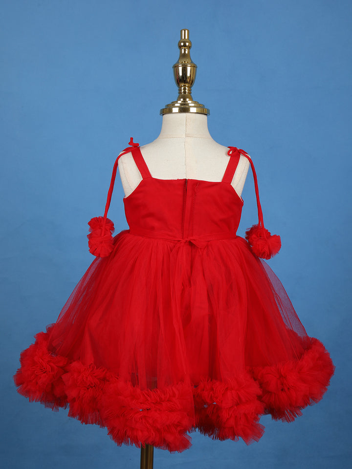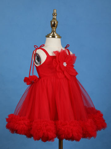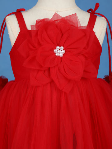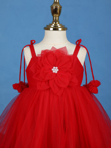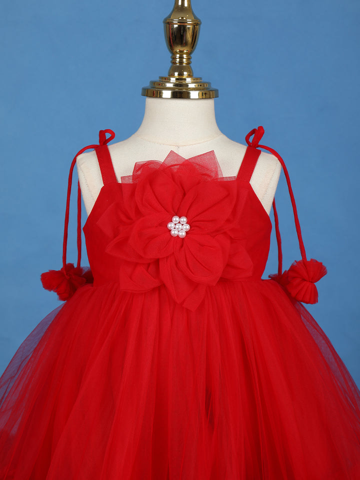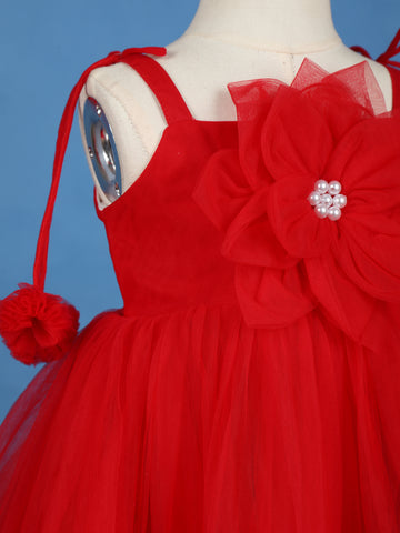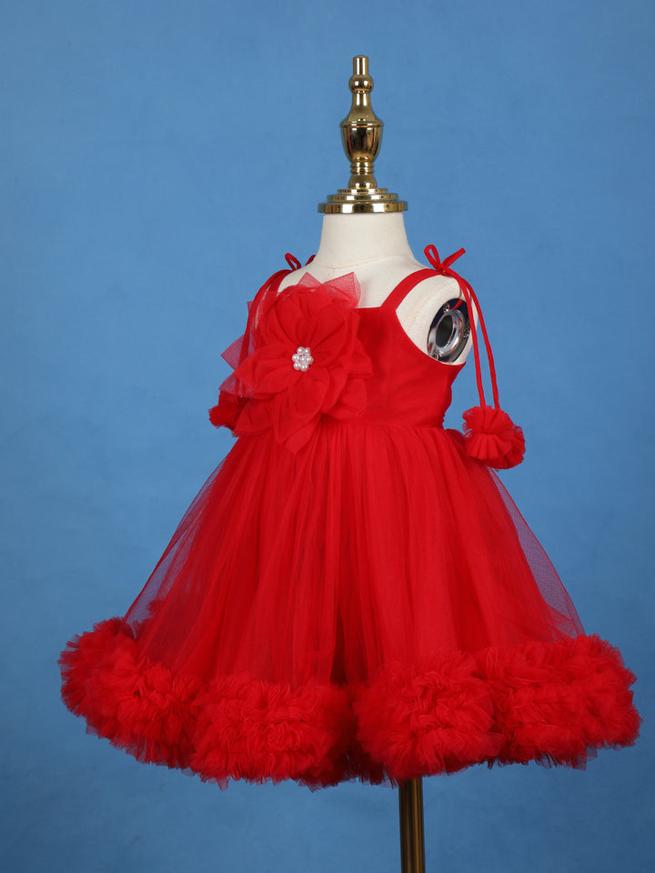 The vibrant red hue radiates festive energy, while the oversized floral embellishment with pearl detailing at the bodice adds a touch of fairy-tale magic. The frock features layered net ruffles along the hem, creating a voluminous flare perfect for twirling at parties. Delicate tie-up straps with pom-pom accents complete the adorable look.