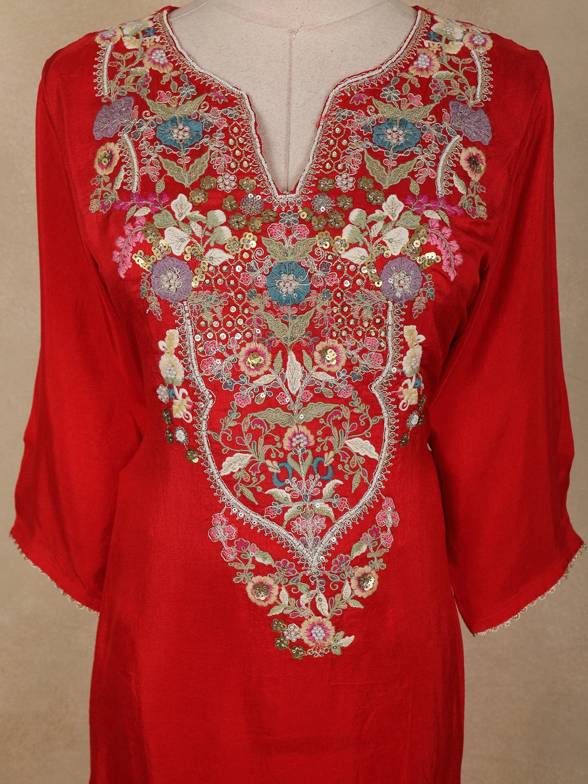 Make a bold and beautiful statement with this red cotton salwar suit adorned with intricate floral embroidery. Designed with a stylish round neck featuring a V-cut and 3/4 sleeves, this outfit effortlessly blends comfort with festive elegance. The breathable cotton fabric ensures ease of movement, while the embroidery adds a rich, traditional appeal. Paired with a matching dupatta to complete the look, this ensemble is perfect for celebrations, family gatherings, and cultural occasions.