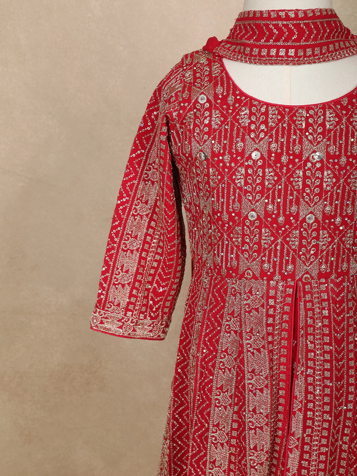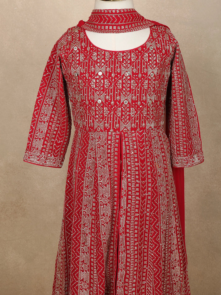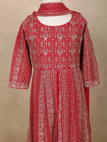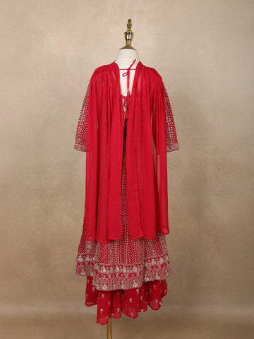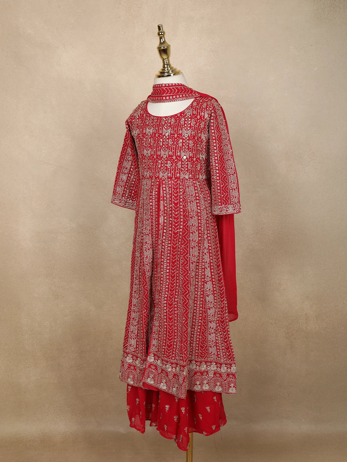 Red Floral Embroidered Georgette Kids Palazzo Suit