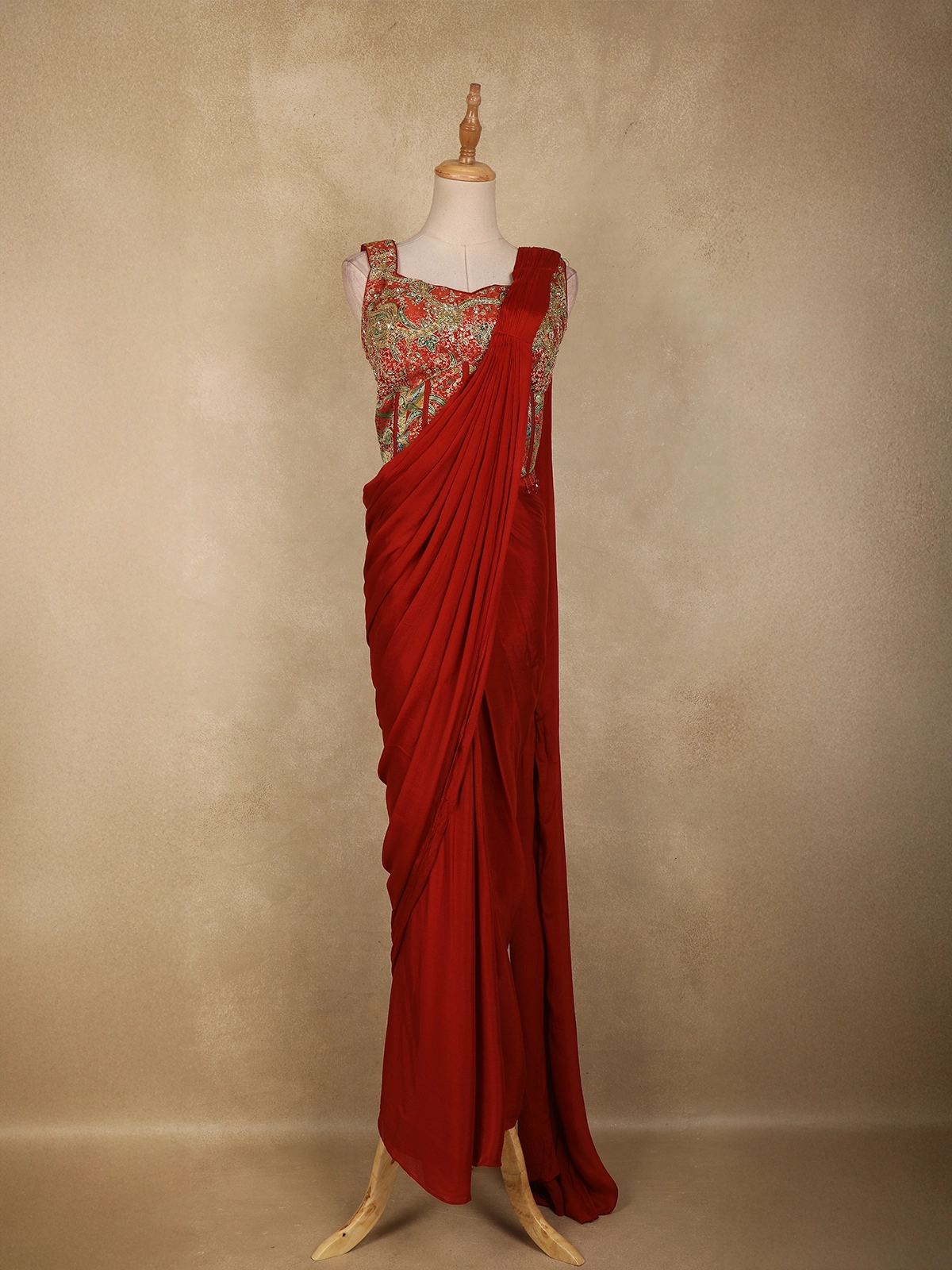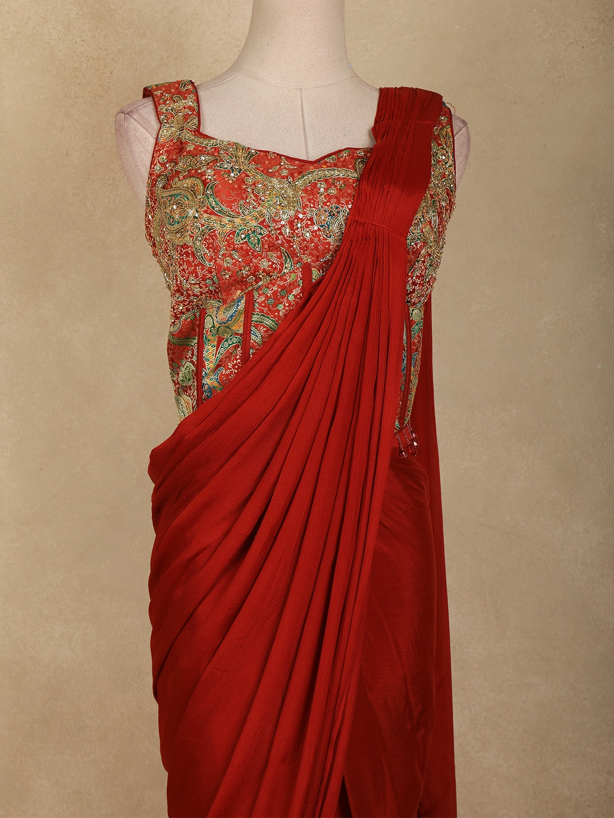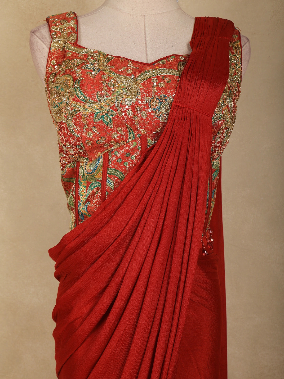 The ready-to-wear silhouette ensures a perfectly pre-stitched drape, making it ideal for those who want the classic saree look without the hassle of traditional pleating. The vibrant red hue enhances its appeal, making it a stunning choice for celebrations, parties, festive gatherings, and special occasions.