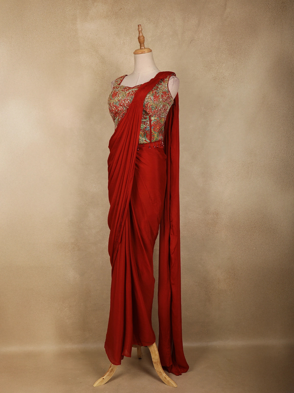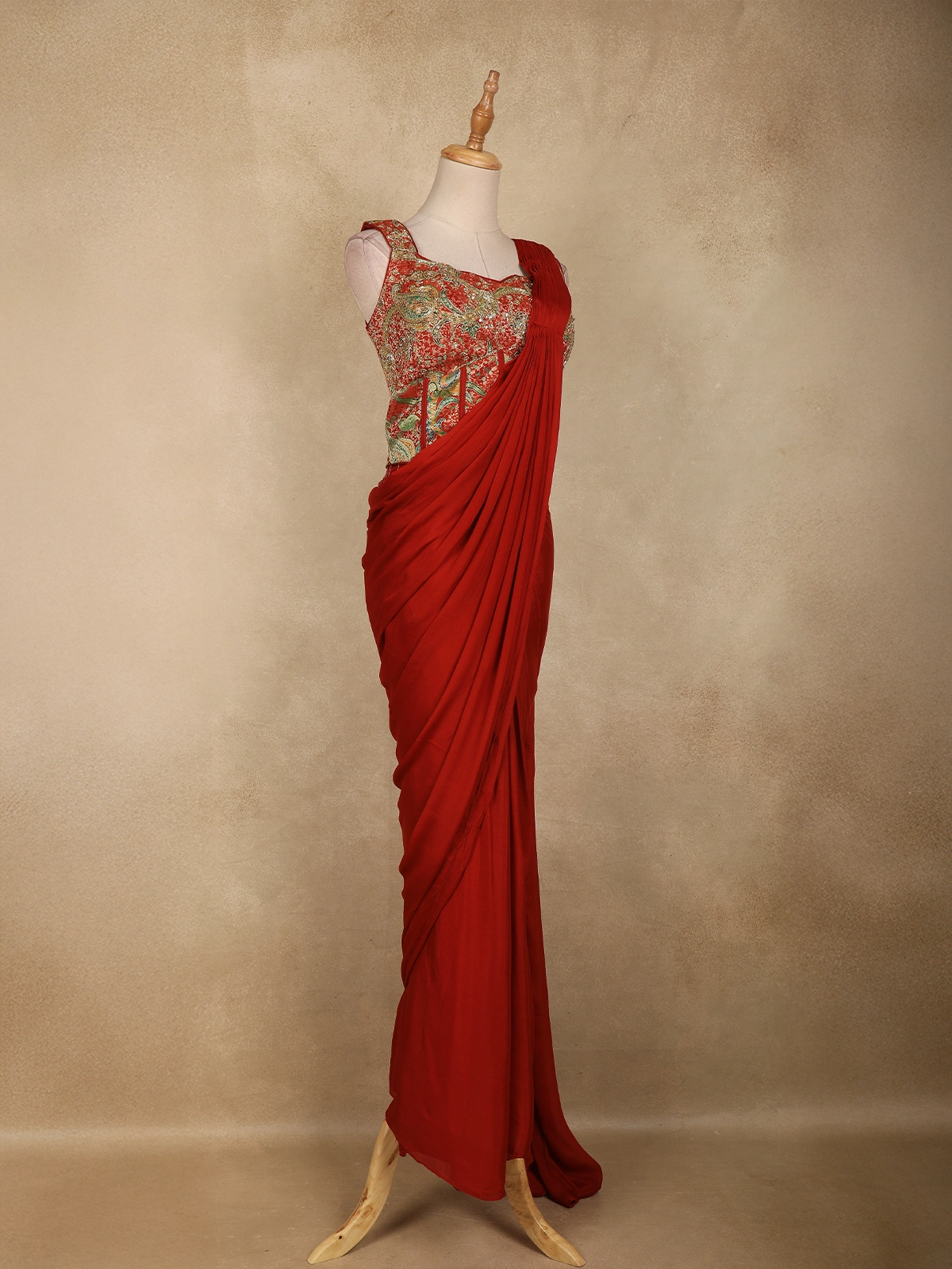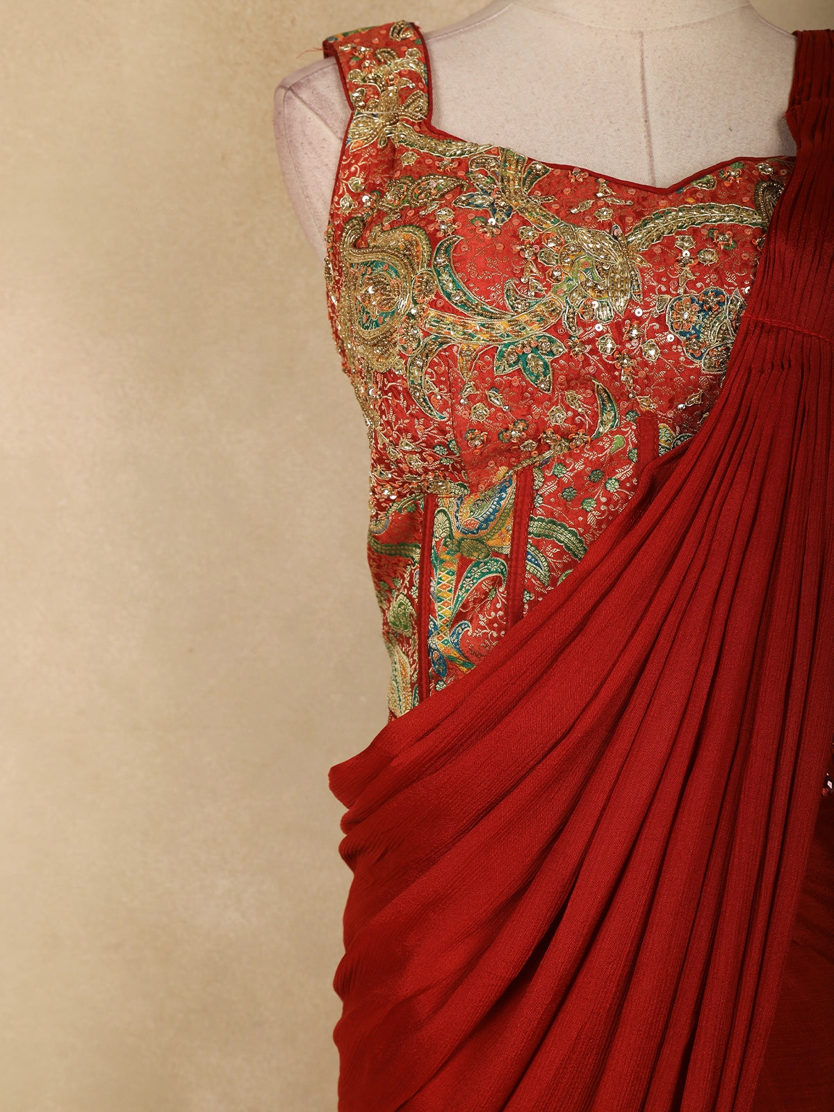 The ready-to-wear silhouette ensures a perfectly pre-stitched drape, making it ideal for those who want the classic saree look without the hassle of traditional pleating. The vibrant red hue enhances its appeal, making it a stunning choice for celebrations, parties, festive gatherings, and special occasions.