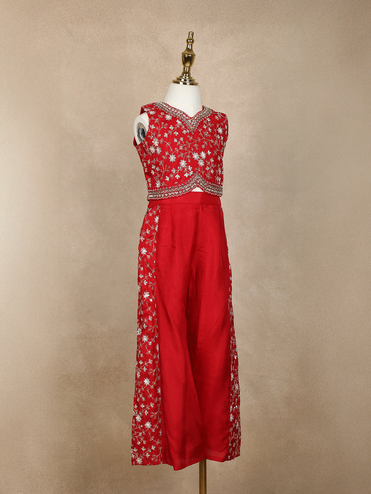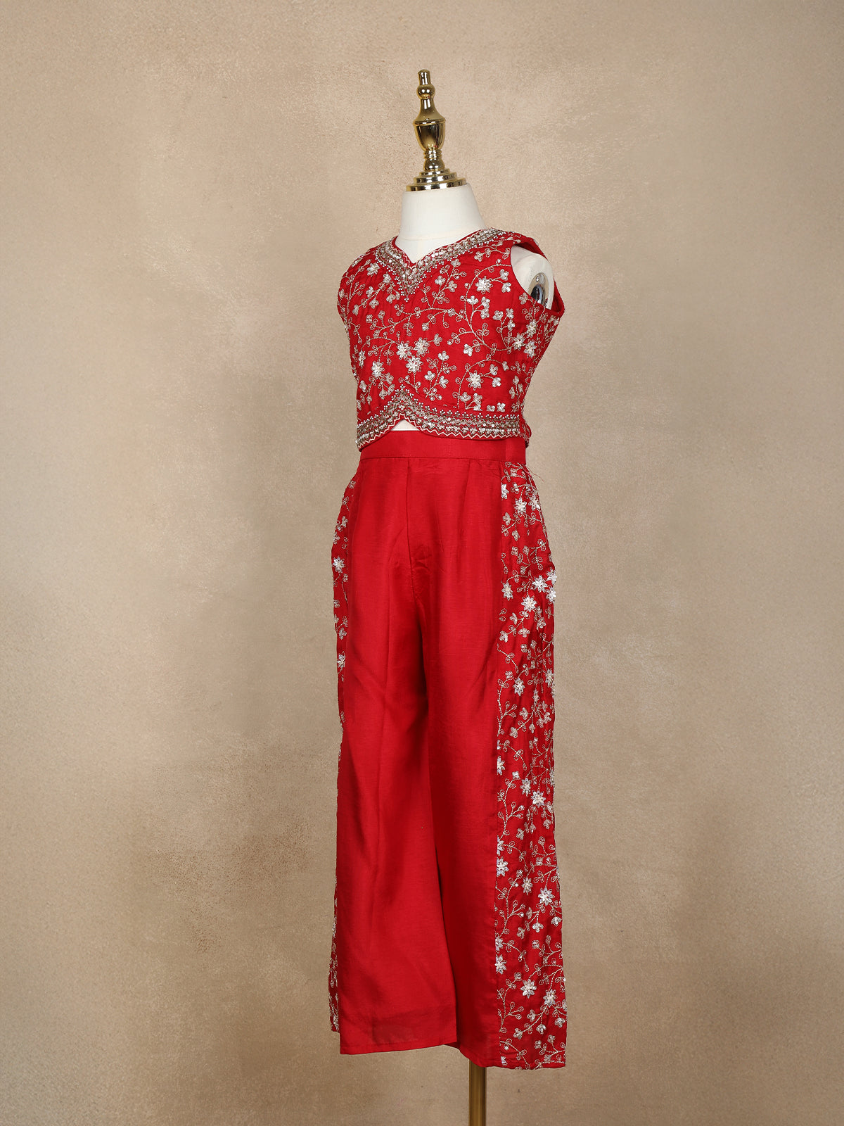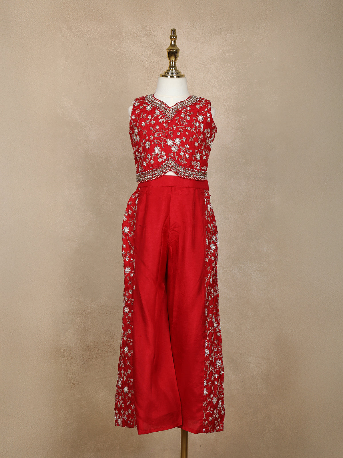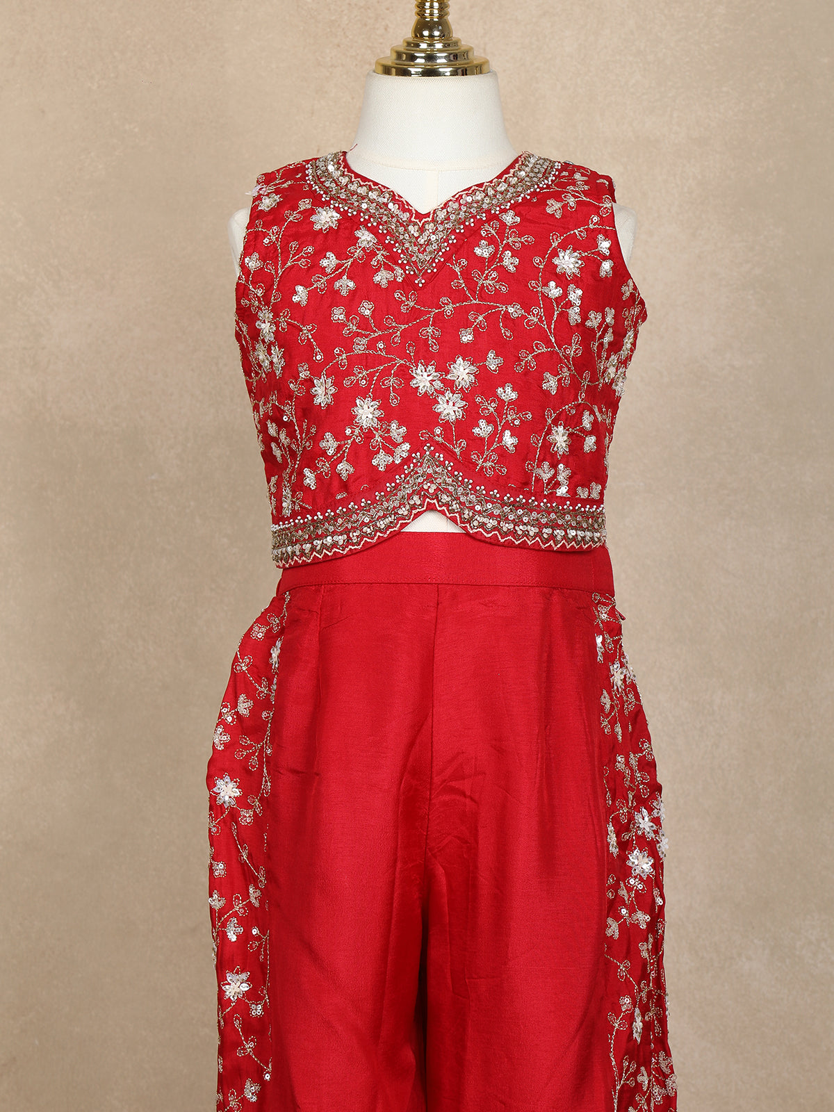 Dress your little one in festive elegance with this charming Red Floral Embroidered Palazzo Set for Girls. Designed with intricate floral embroidery on a vibrant red base, this outfit brings a beautiful blend of tradition and playful style. The soft and breathable fabric ensures all-day comfort, while the stylish palazzo pants add a trendy twist to her ethnic look.