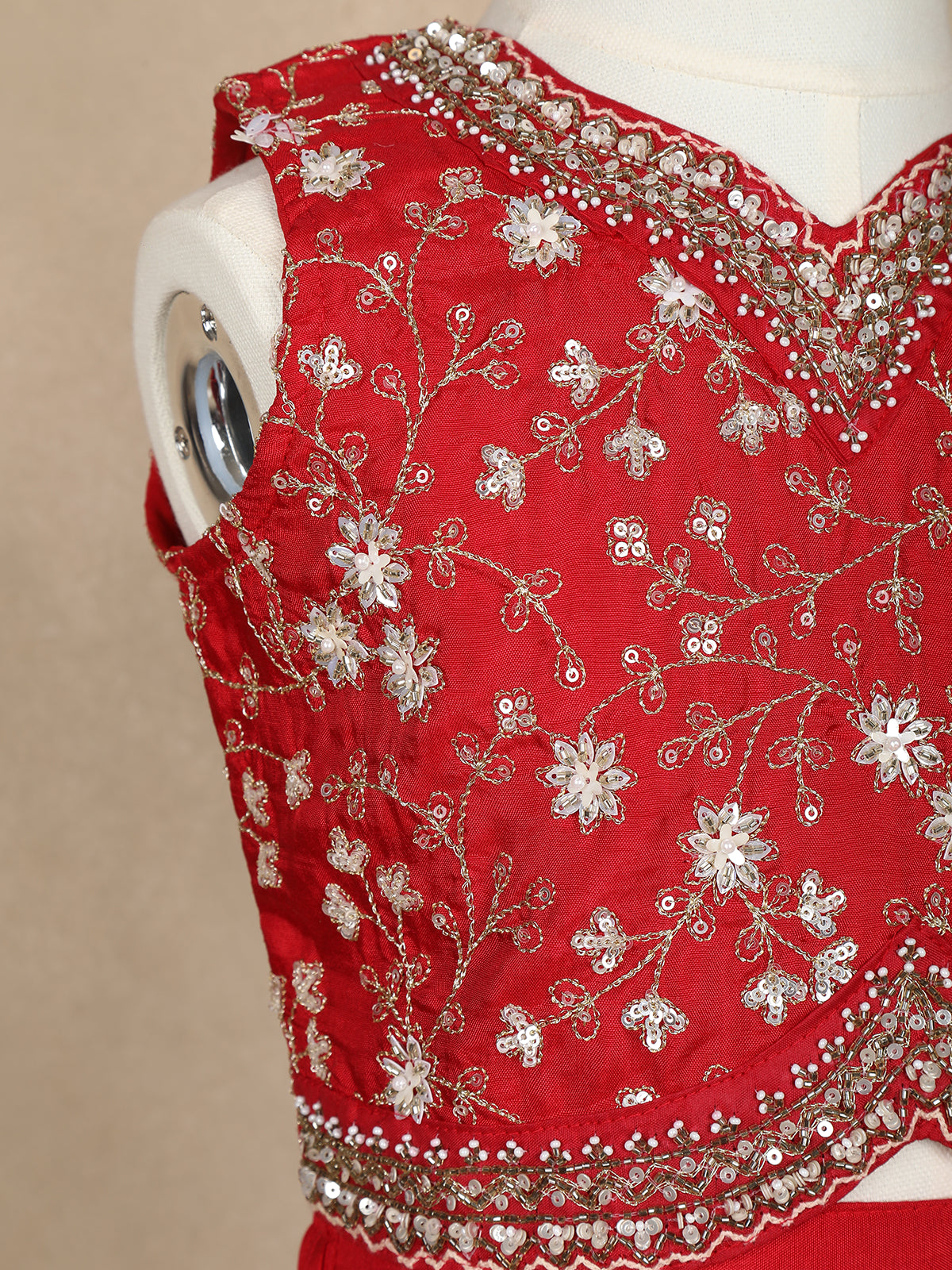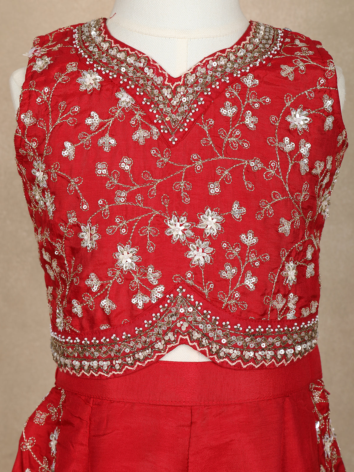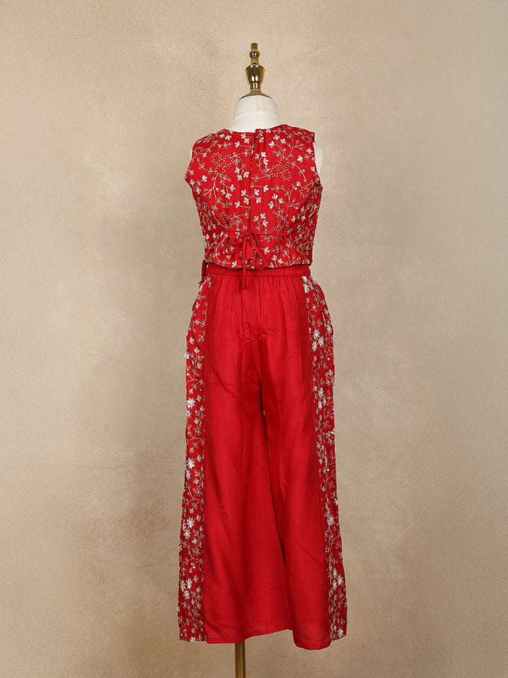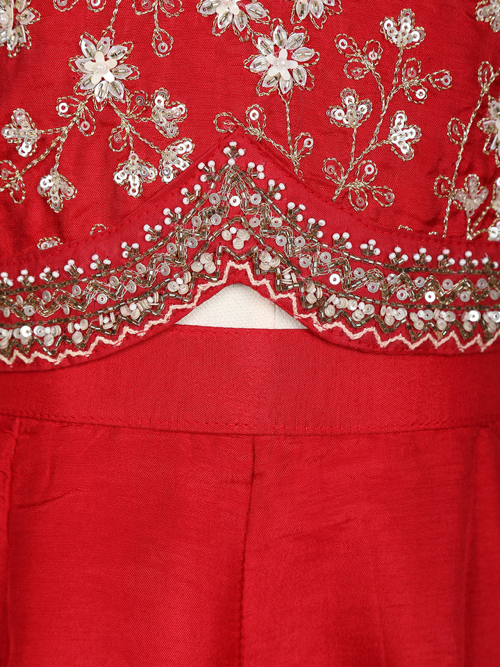 Dress your little one in festive elegance with this charming Red Floral Embroidered Palazzo Set for Girls. Designed with intricate floral embroidery on a vibrant red base, this outfit brings a beautiful blend of tradition and playful style. The soft and breathable fabric ensures all-day comfort, while the stylish palazzo pants add a trendy twist to her ethnic look.