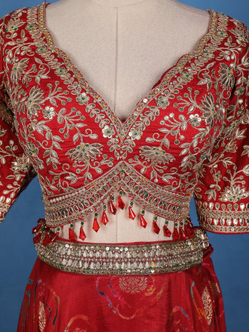 Elevate your bridal charm with this exquisite Red Silk Lehenga Set, a true ode to regal artistry. The blouse is intricately embroidered with resplendent zari, sequins, and mirror work in delicate floral patterns, featuring a flattering V-neck and Half sleeves for a graceful silhouette. The lehenga showcases a blend of woven floral motifs with subtle multicolor detailing, exuding heritage elegance with a modern twist.
