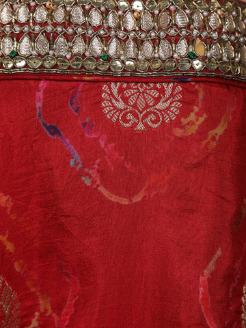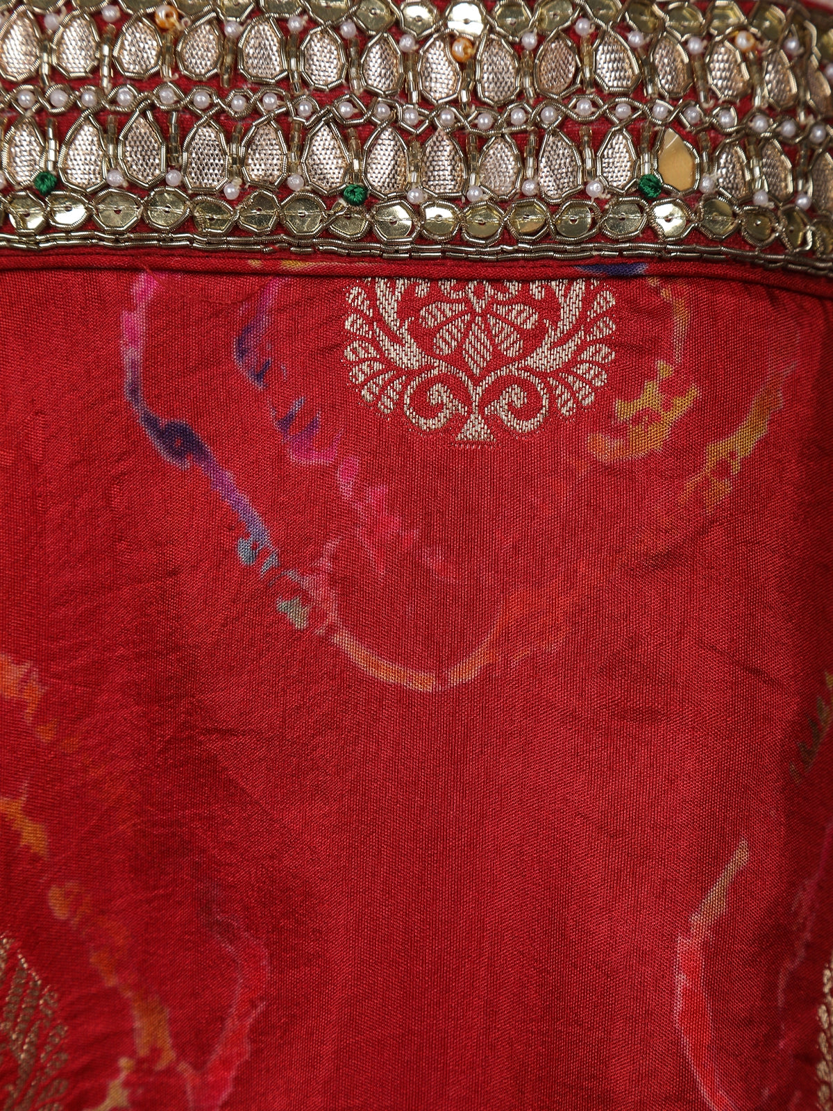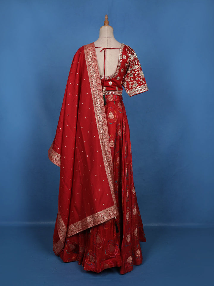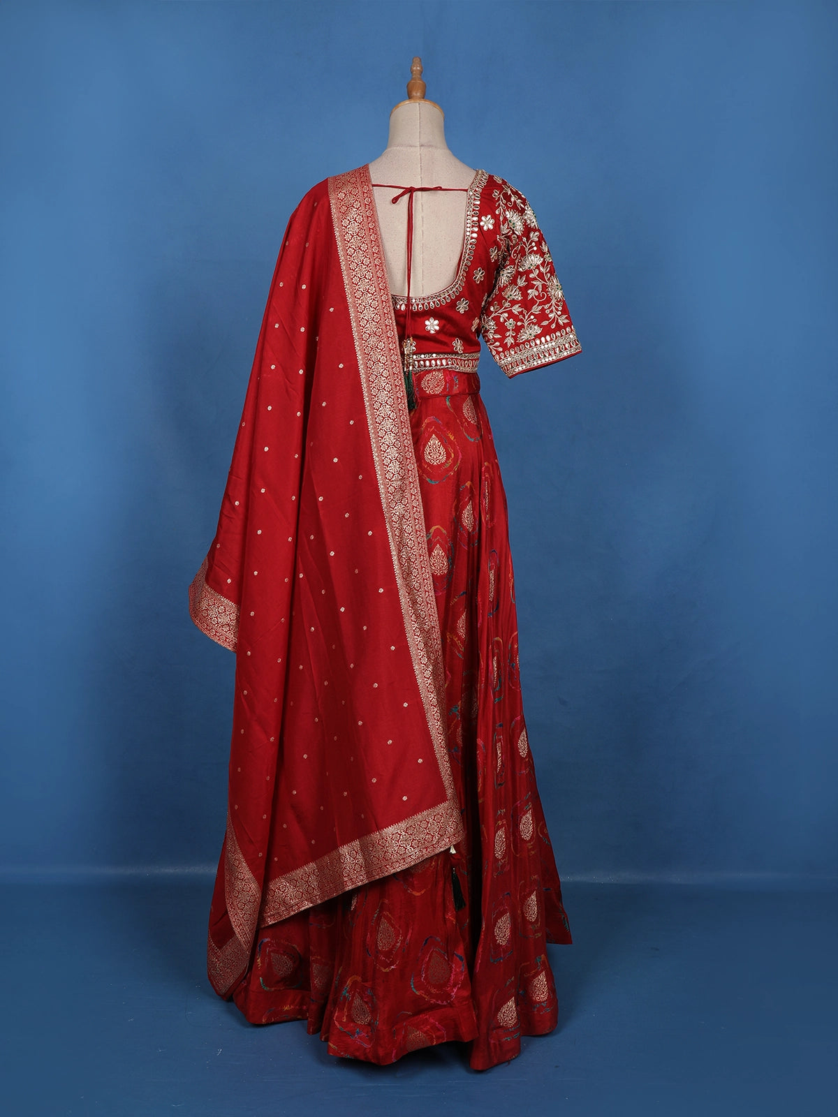 A matching red silk dupatta, adorned with fine zari butta motifs and an ornate embroidered border, completes the ensemble. Perfect for weddings, receptions, and grand festive celebrations, this lehenga embodies timeless craftsmanship and royal sophistication.