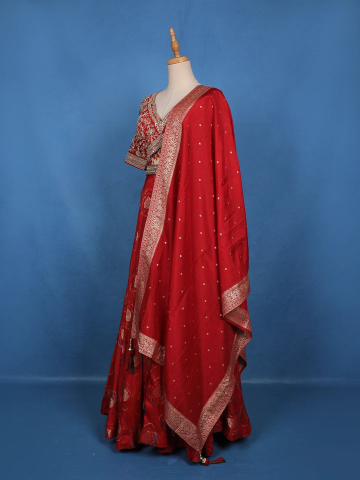 Red Floral Embroidered Silk Bridal Lehenga Set With Zari Dupatta
