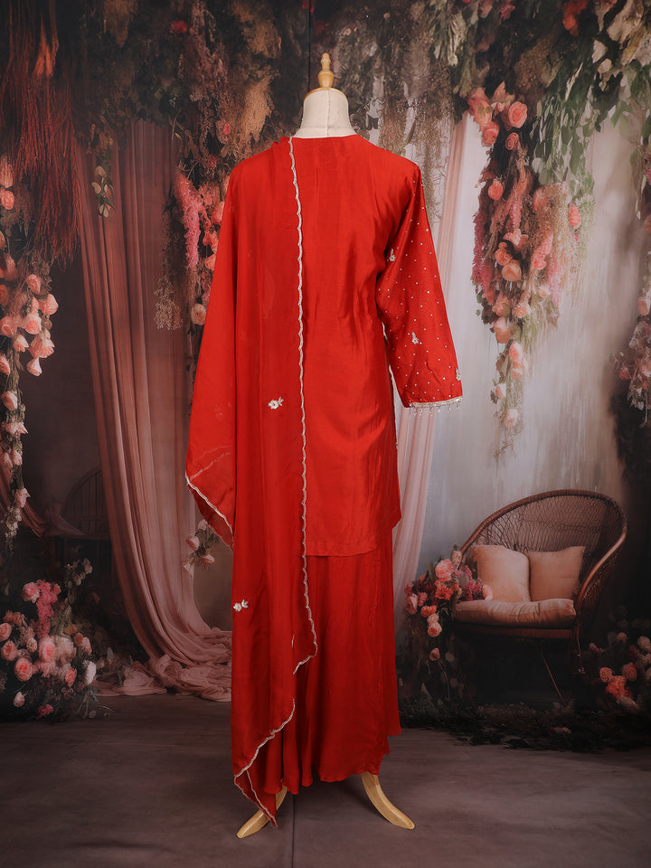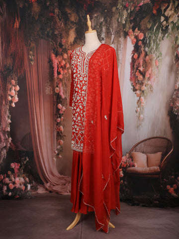 The hemline of the top showcases geometric and floral embroidery patterns, giving depth and royal finesse to the silhouette. The matching raw silk flared skirt flows softly, offering comfort with elegant movement. Completing the set is a sheer georgette dupatta adorned with delicate embroidered motifs and a finely finished border, adding a soft and graceful drape to the ensemble.