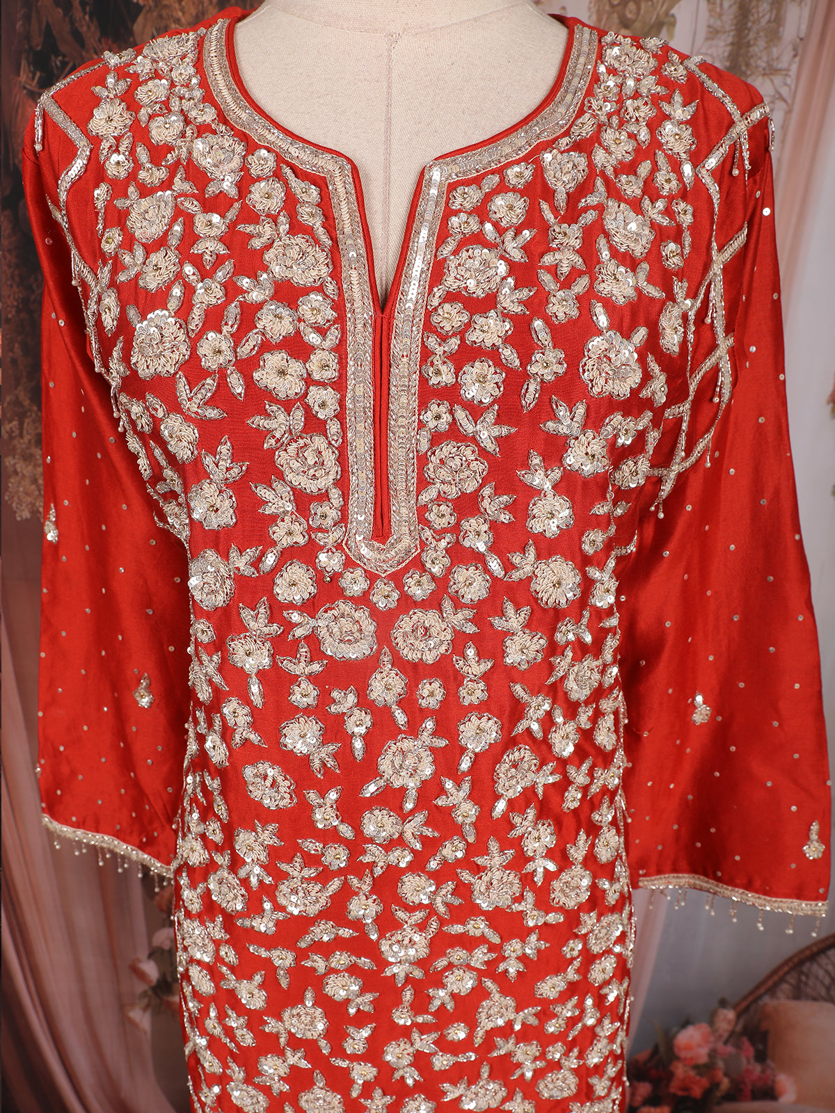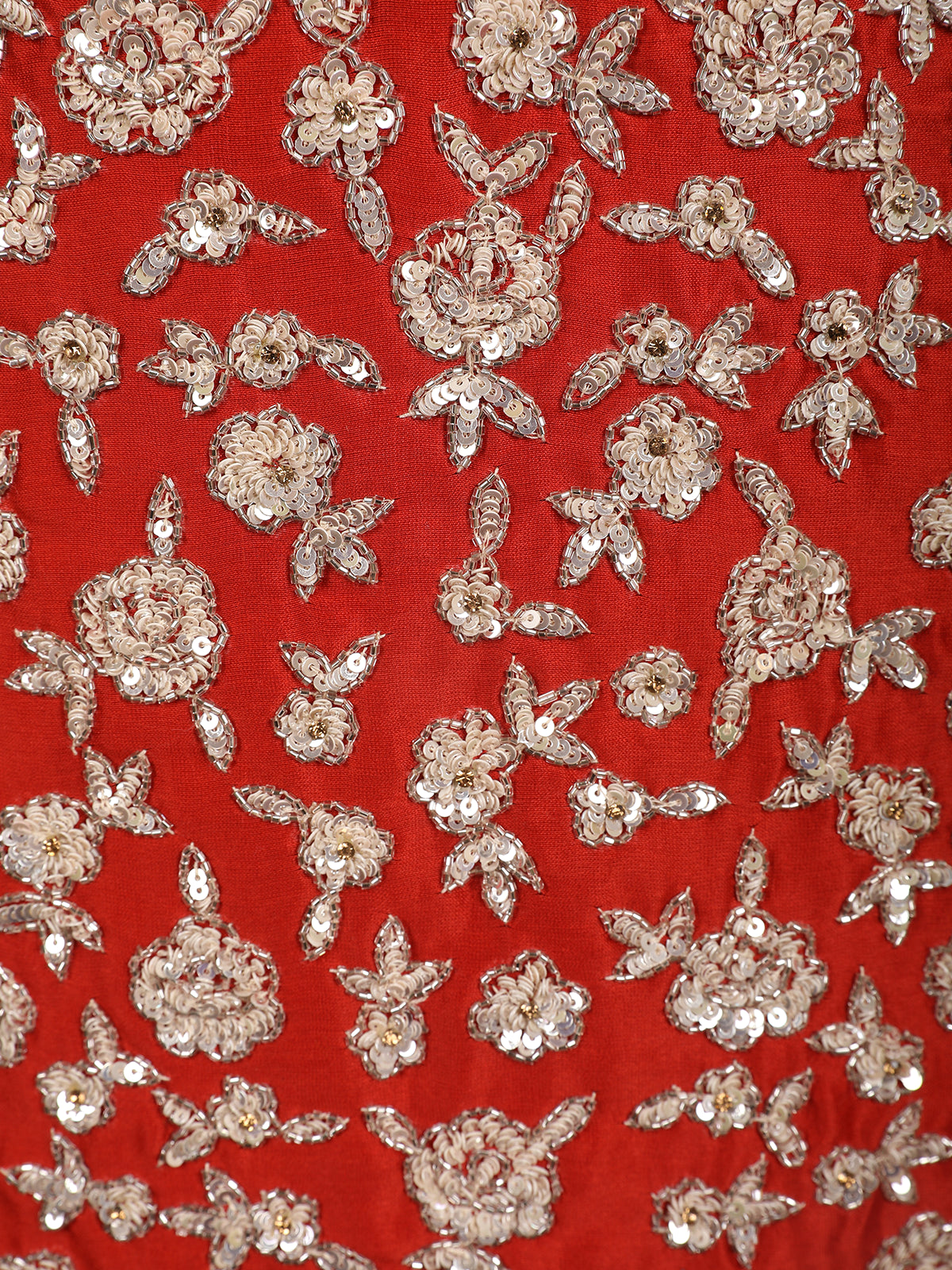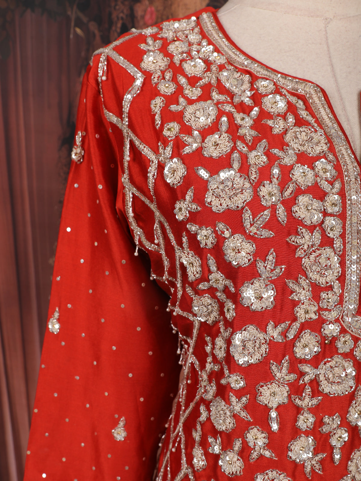 Red Floral Heavy Sequins and Thread Embroidered Design Raw Silk Skirt Top Lehenga