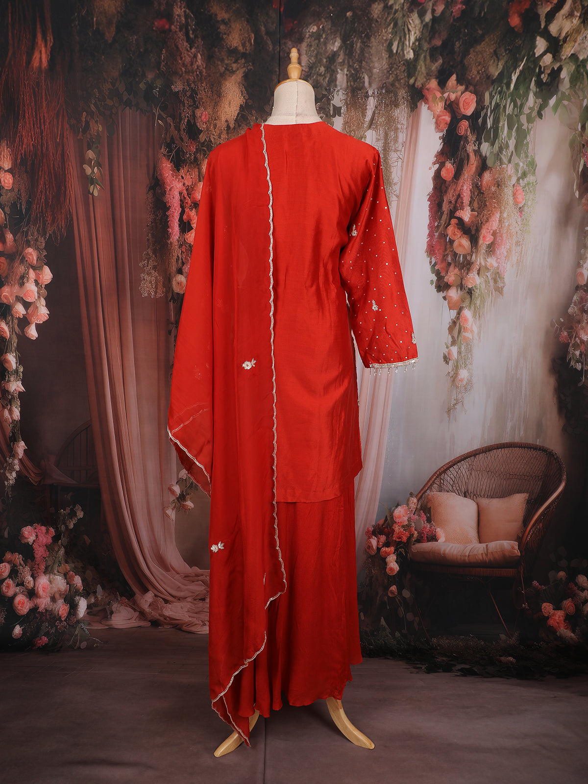 A festive favorite in a bold and vibrant red, this raw silk skirt top lehenga set brings together traditional artistry and modern glamour. The top features detailed floral thread embroidery highlighted with shimmering sequins, creating a rich and ornate surface that instantly draws attention. The neckline is tastefully embellished, adding a graceful shape that flatters beautifully.