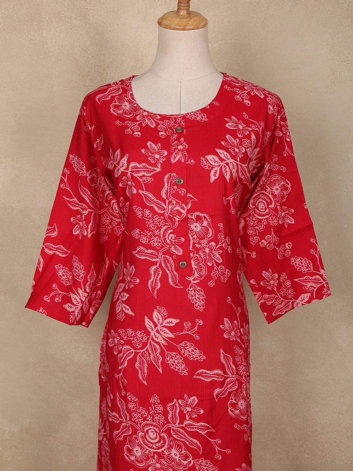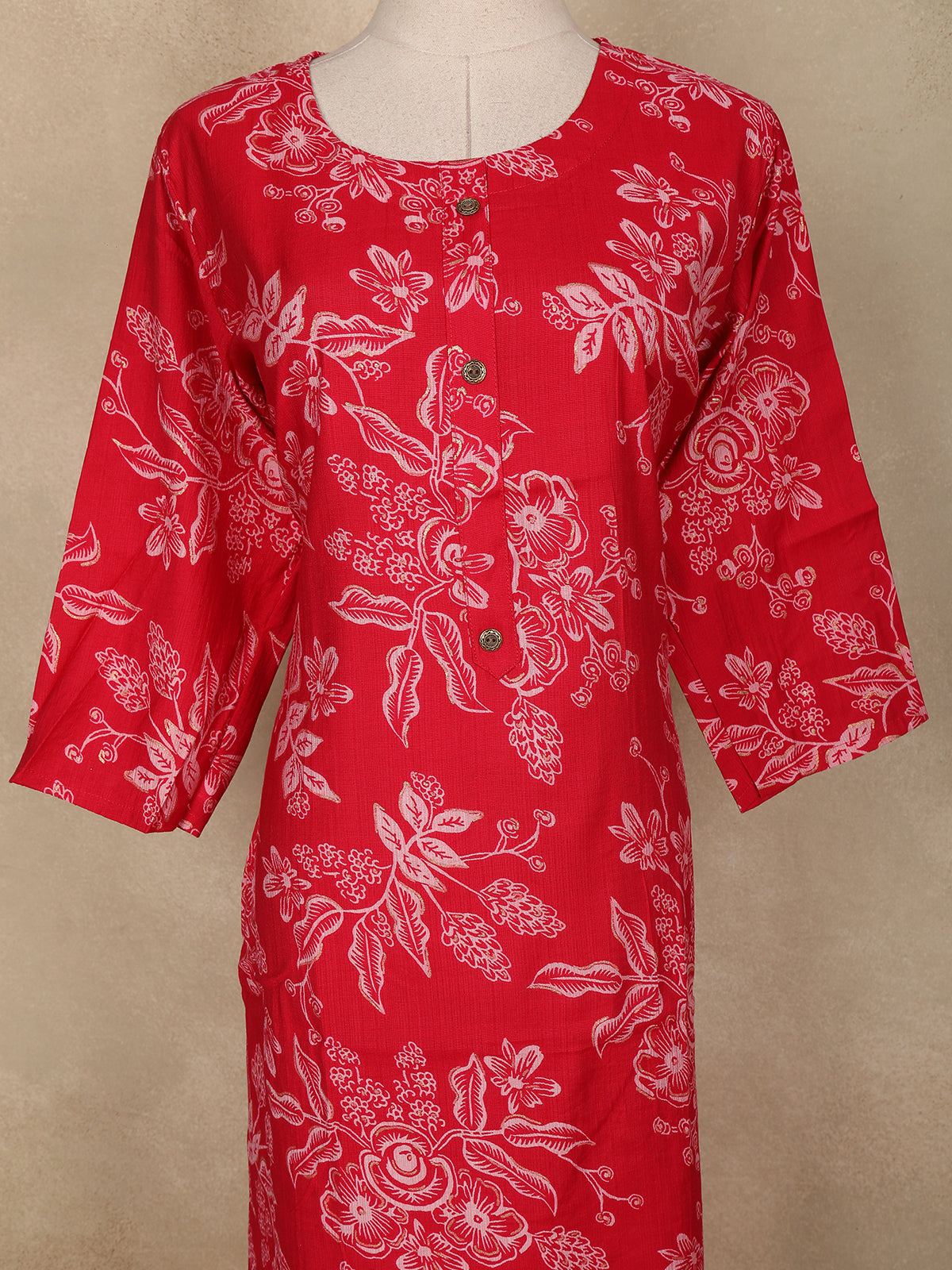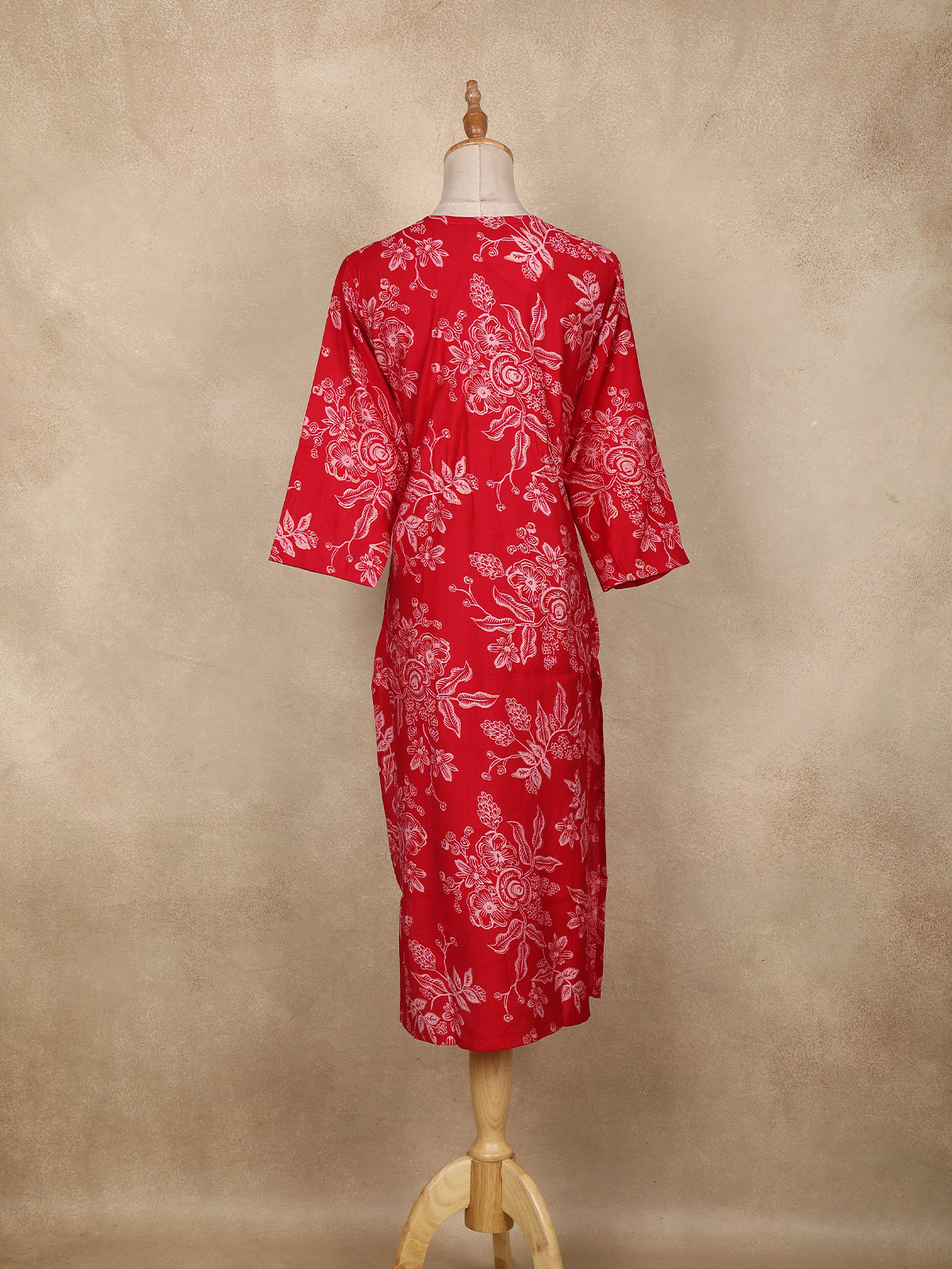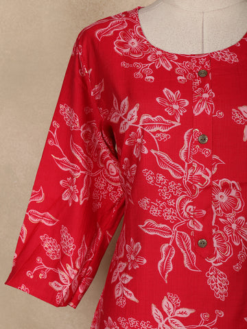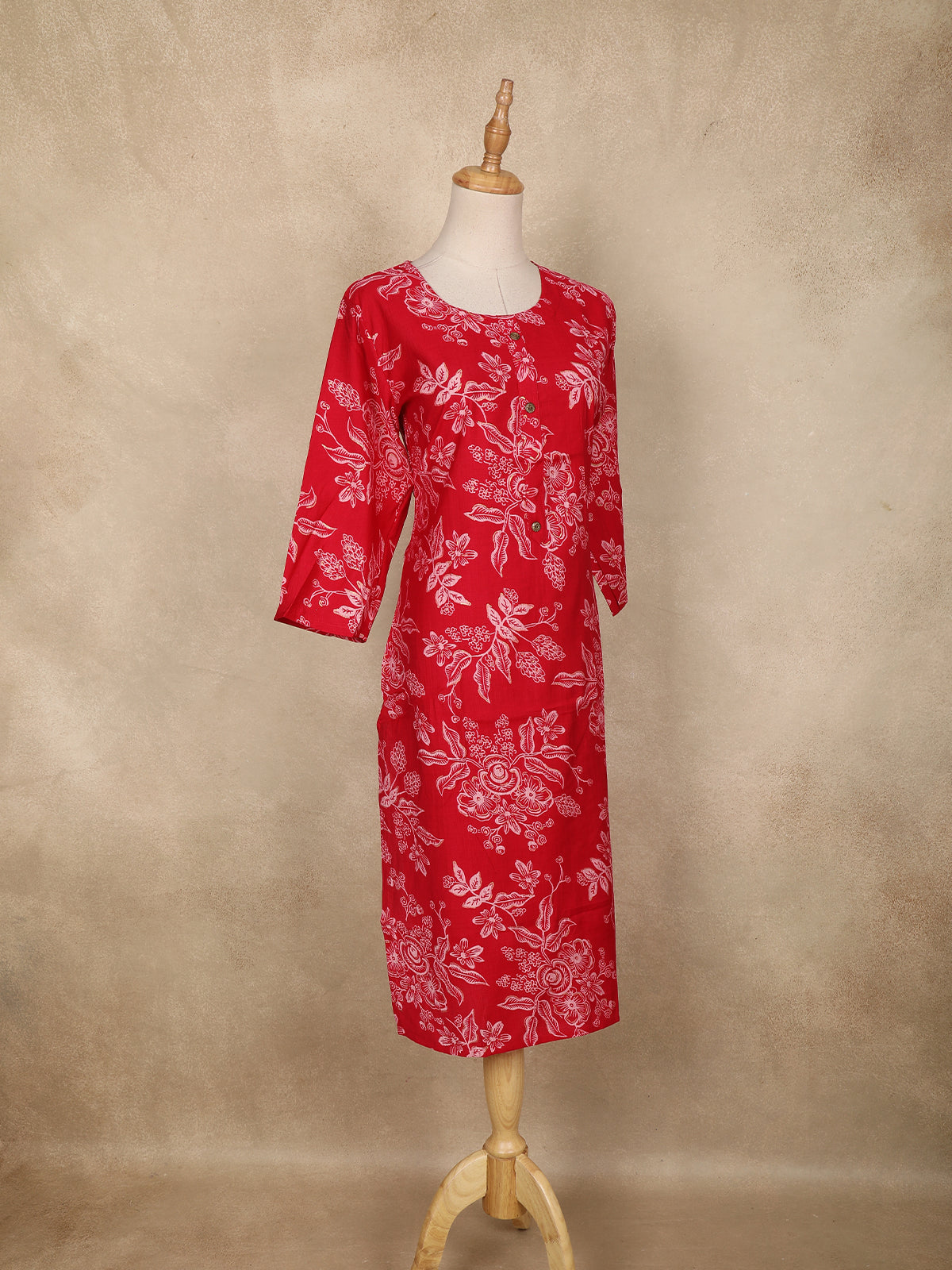 Refresh your everyday ethnic wardrobe with this vibrant Red Floral Printed Cotton Straight Kurti. Featuring an all-over white floral print, this kurti offers a playful yet elegant touch to your casual style. Tailored in soft and breathable cotton, it ensures all-day comfort, perfect for workdays, outings, and warm weather seasons.