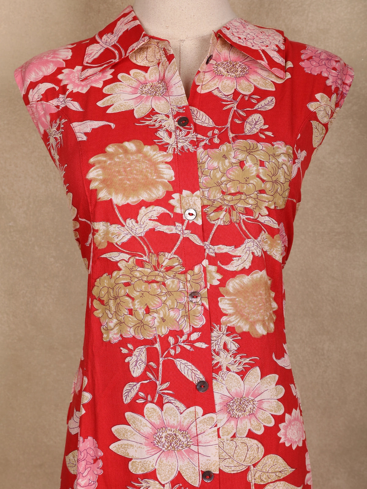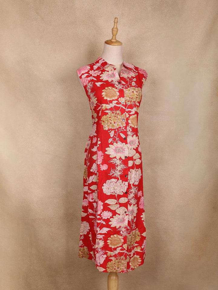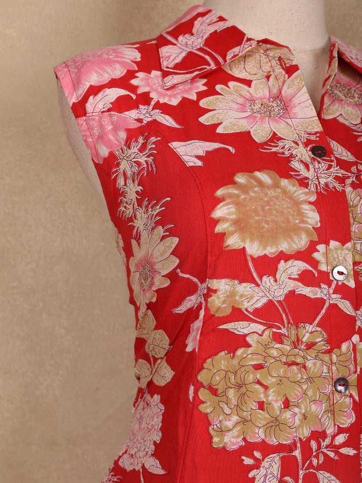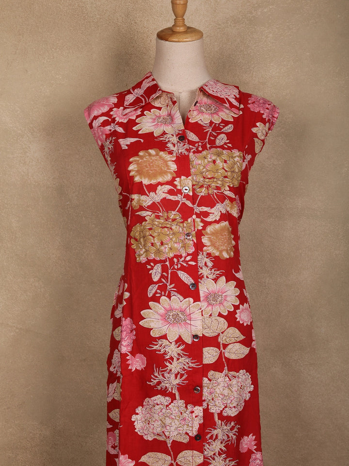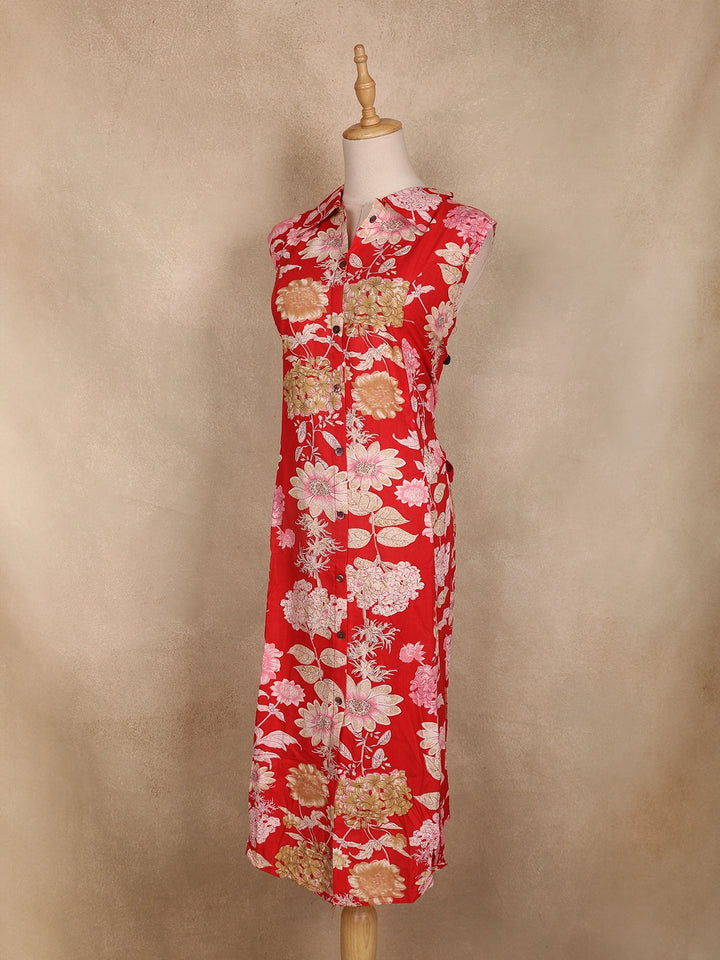 Add a vibrant touch to your ethnic wardrobe with this red floral printed cotton kurti, designed for effortless elegance and all-day comfort. Crafted from breathable cotton fabric, it features an eye-catching floral print in contrasting hues that brings a cheerful charm to your look. The collar neck adds a structured appeal, while the sleeveless design ensures comfort during warm days. Perfect for casual outings, festive gatherings, or office wear, this kurti pairs beautifully with white leggings, cigarette pants, or palazzos for a polished ethnic ensemble.