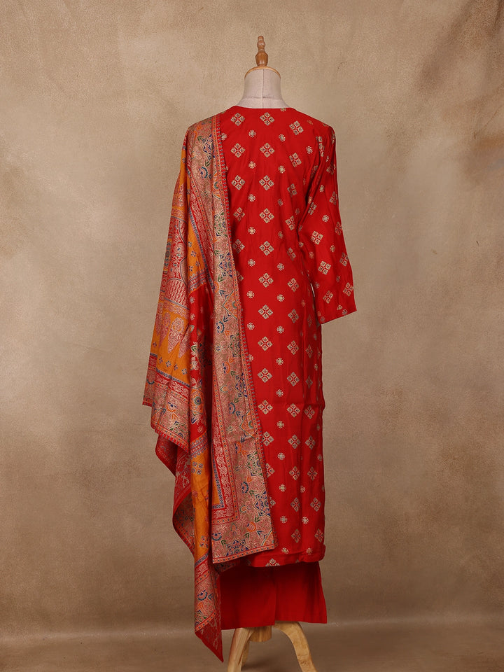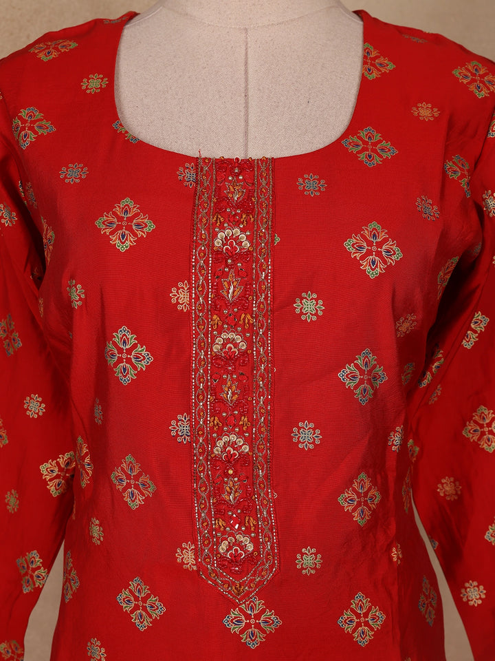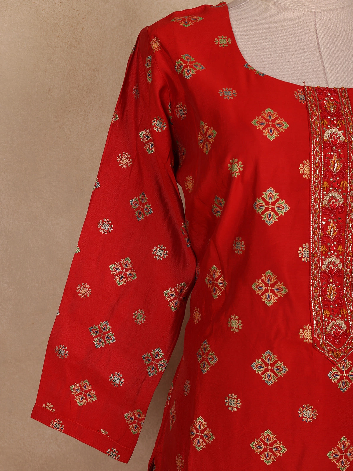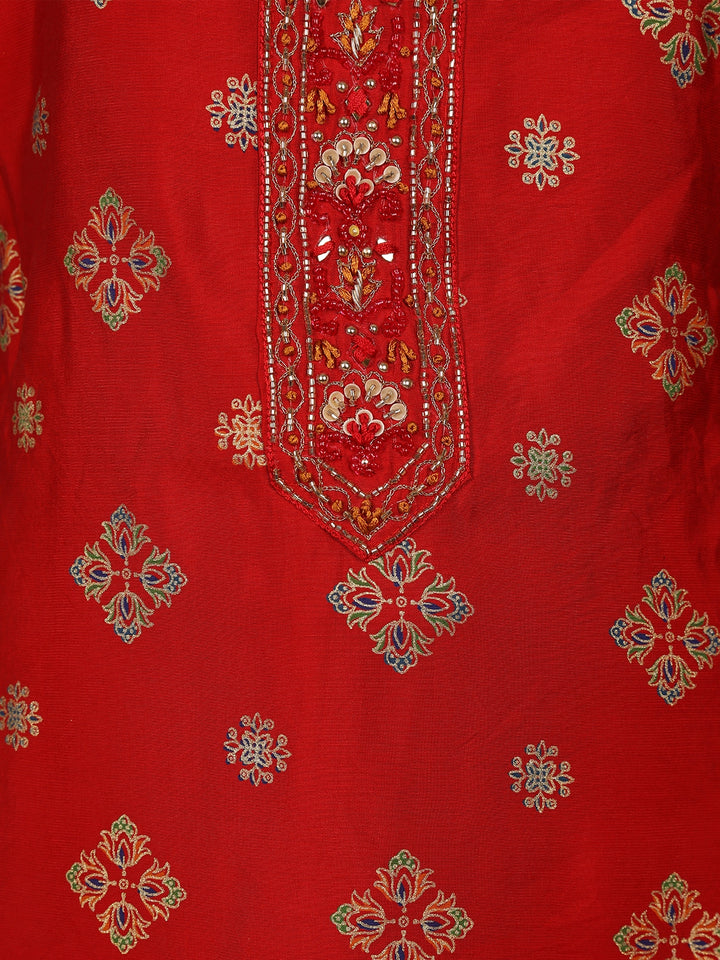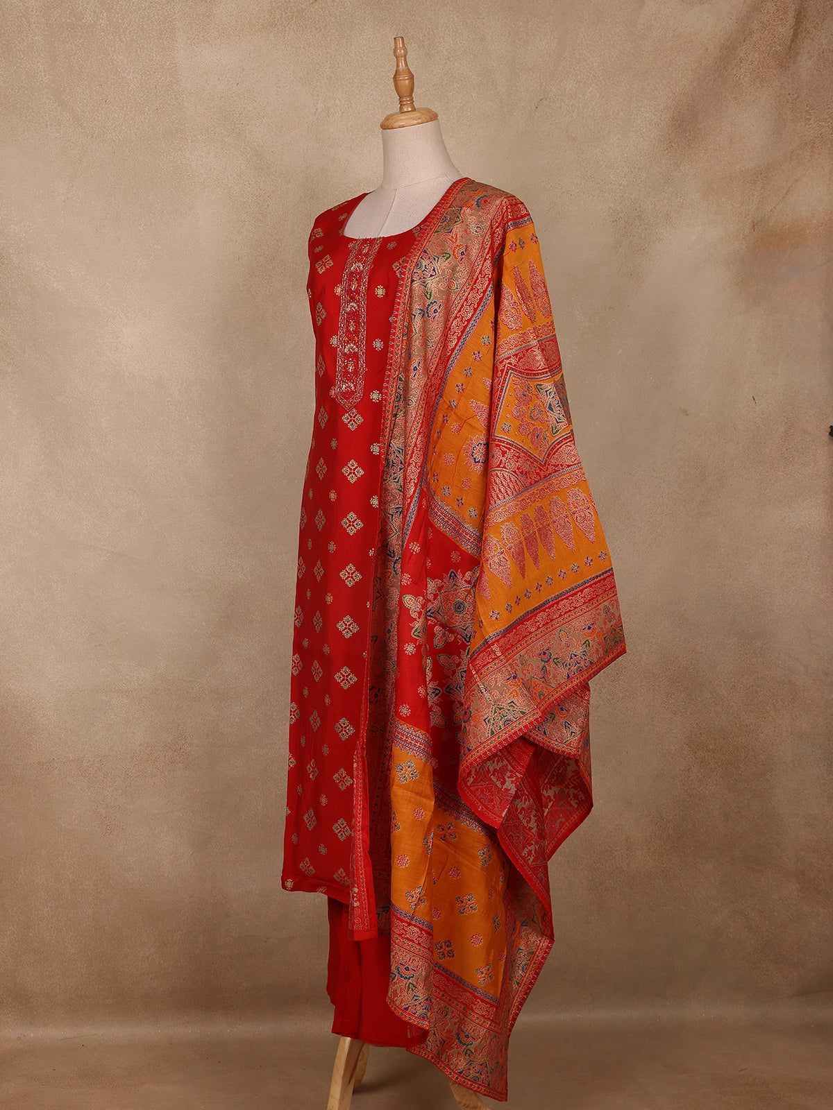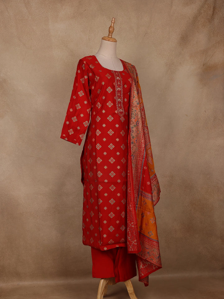 Elevate your ethnic charm with this stunning red cotton salwar suit, featuring exquisite mirror and thread embroidery on the yoke panel and scattered motifs all over. The straight-cut silhouette paired with a square neckline offers a flattering, graceful appeal, perfect for festive gatherings and casual celebrations. Complementing the kurta is a vibrant multicolor printed dupatta in shades of orange and red, enhancing the outfit’s traditional elegance. The matching solid red bottom completes the ensemble with effortless sophistication.