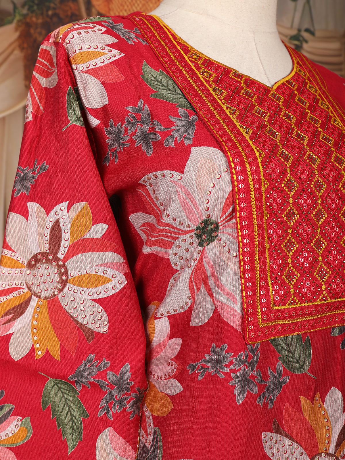Step into effortless elegance with this Red Floral Printed Cotton Salwar Suit that beautifully merges traditional aesthetics with everyday comfort. The outfit features a bold floral print in hues of mustard, ivory, and green that lends a vibrant and cheerful appeal.