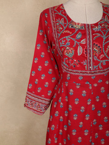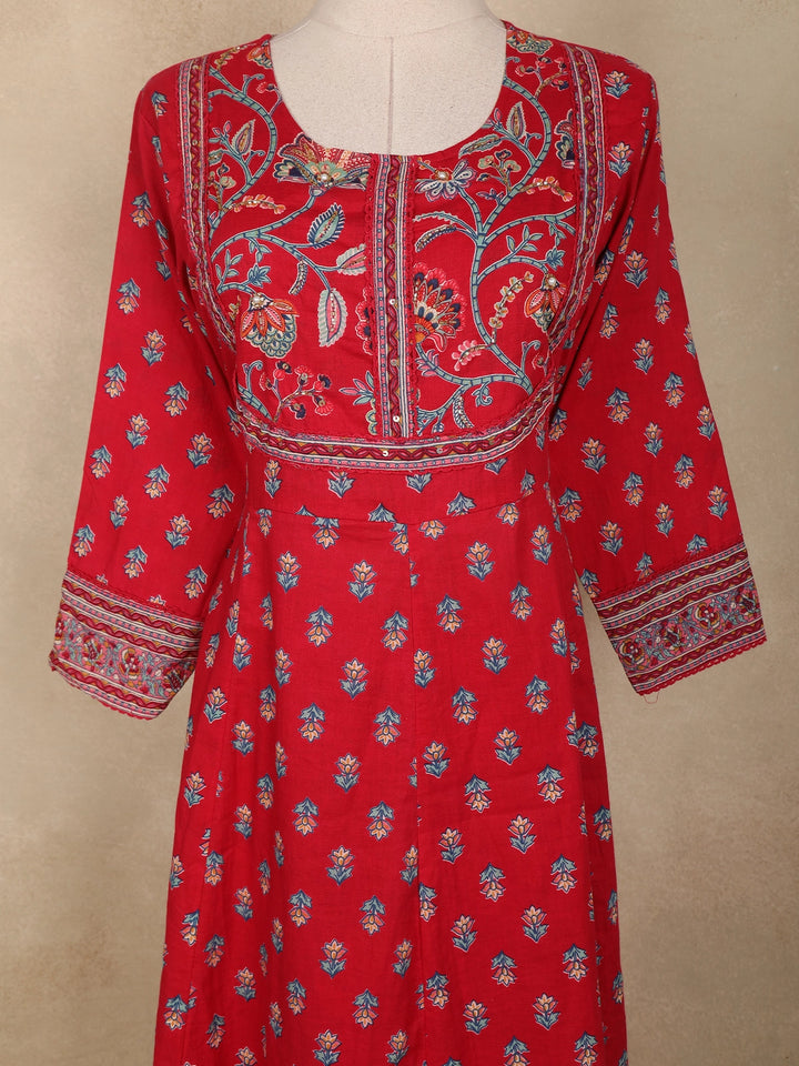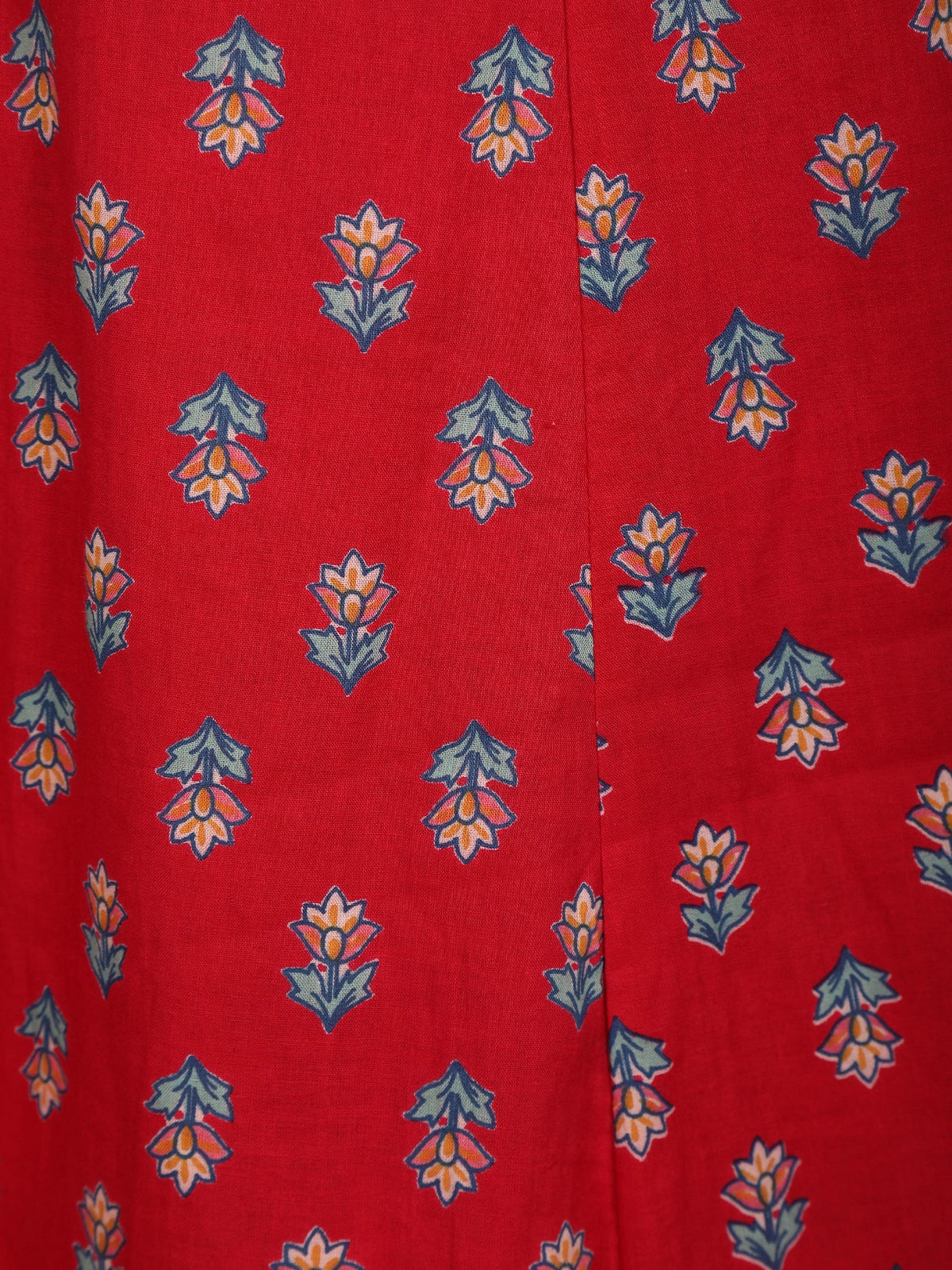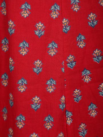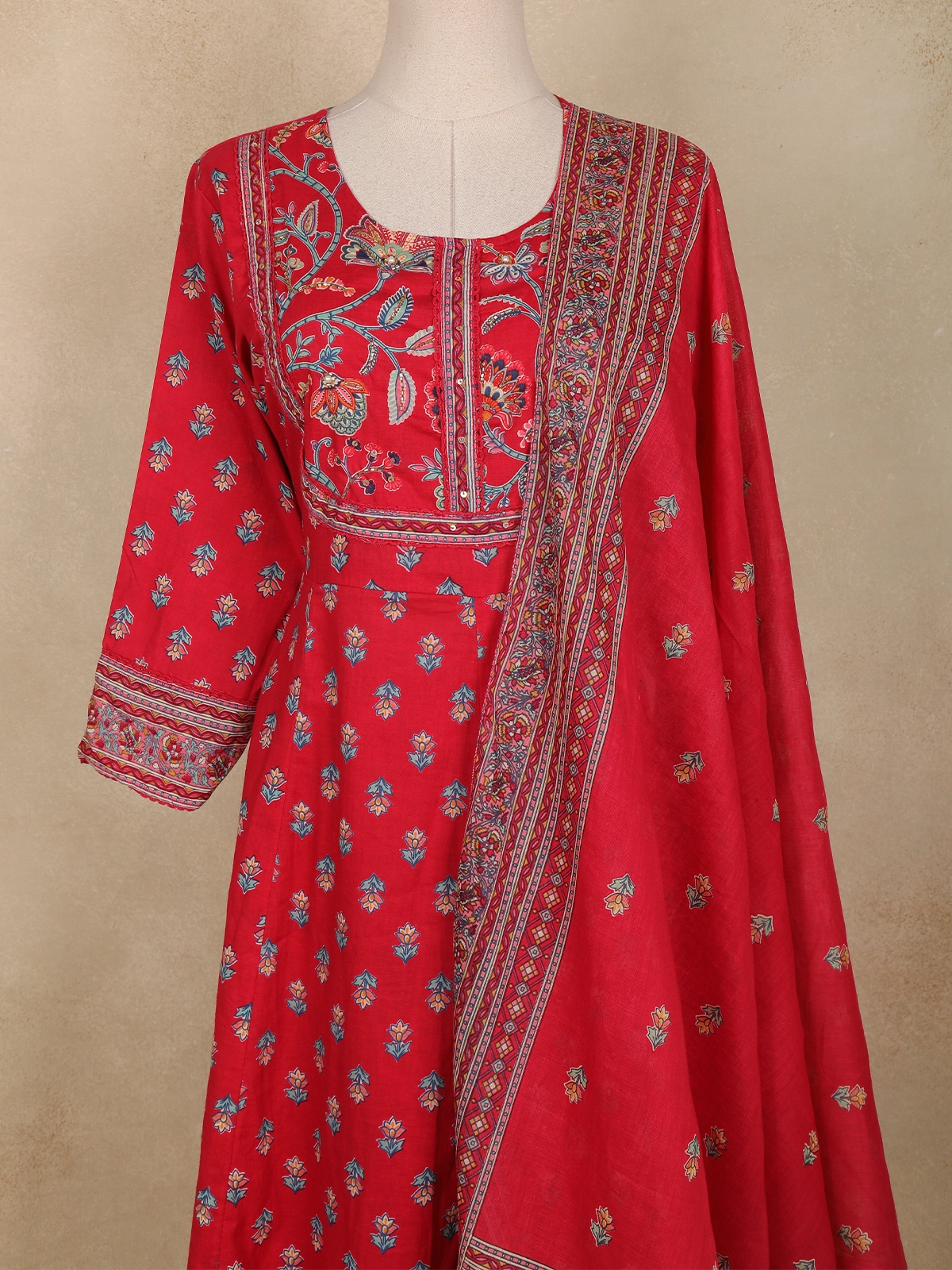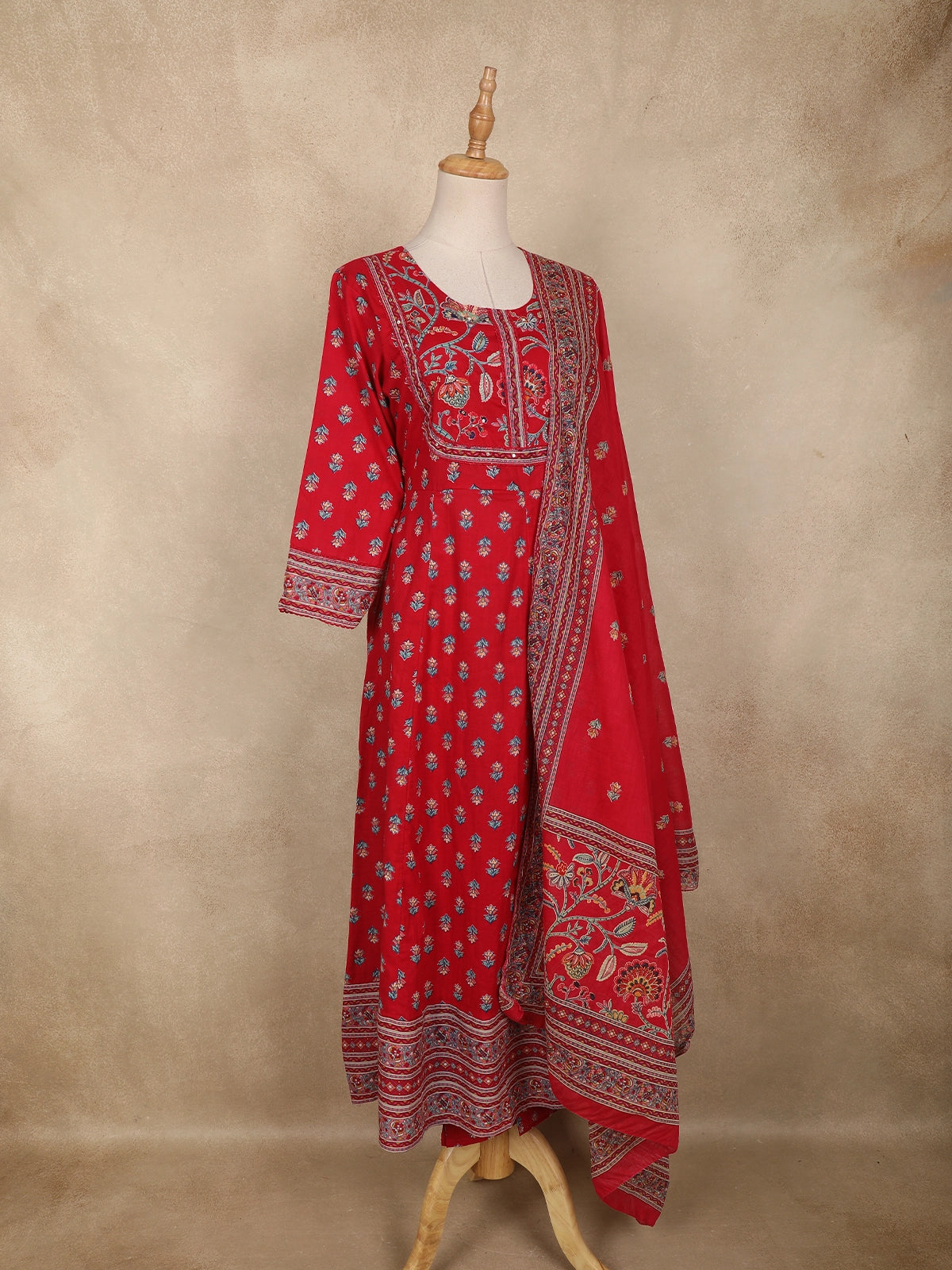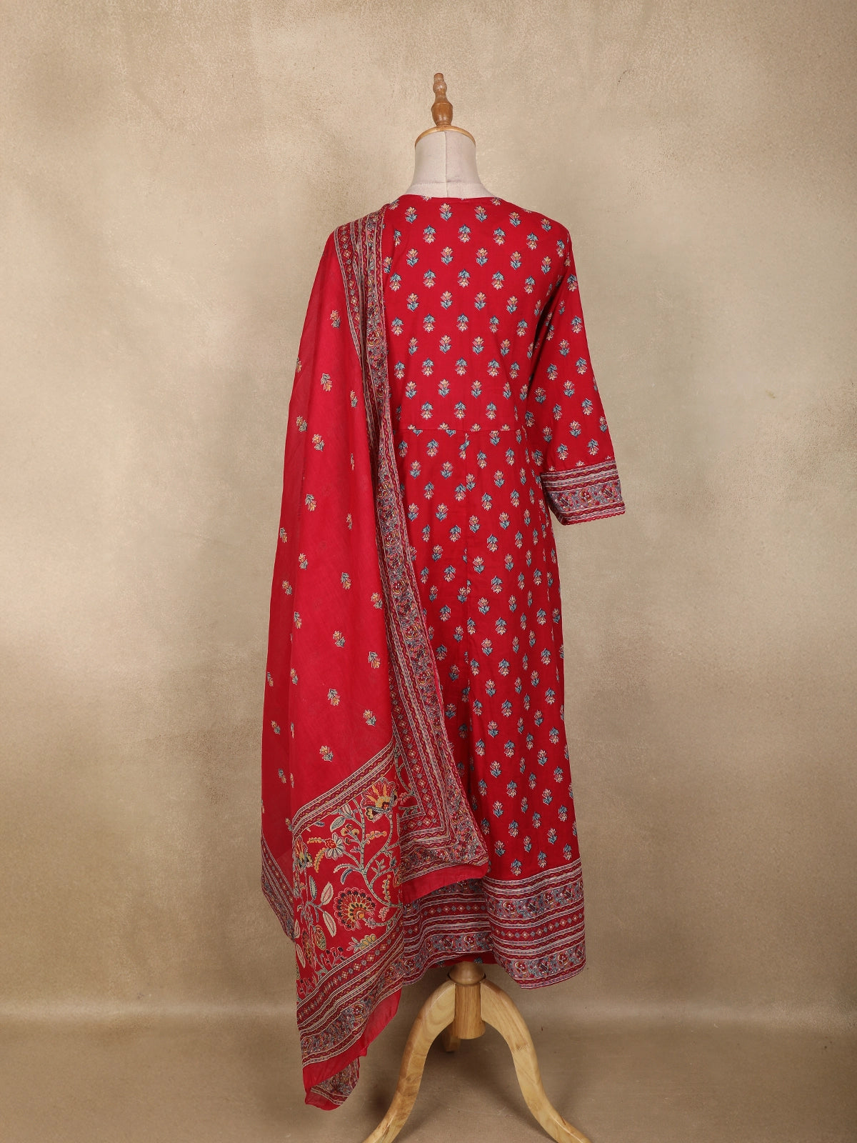 Red Floral Printed Design Cotton Anarkali Salwar Suit with Dupatta