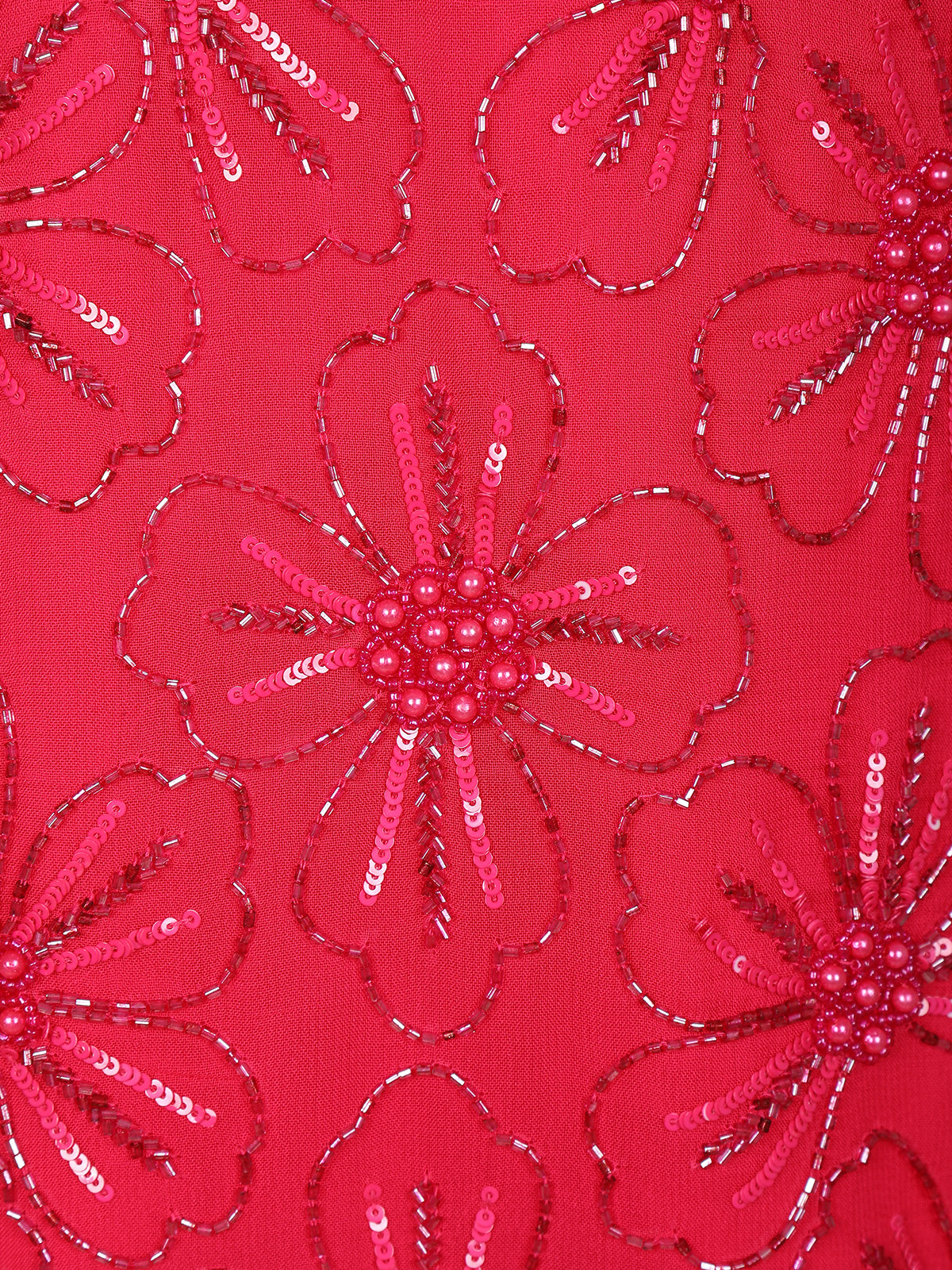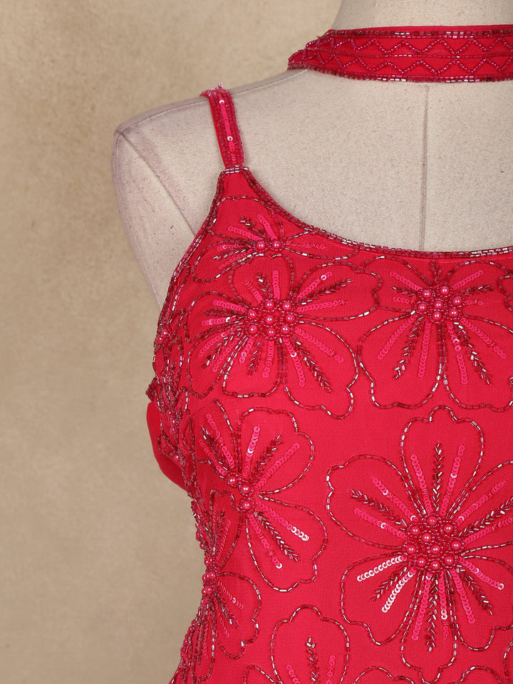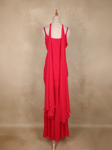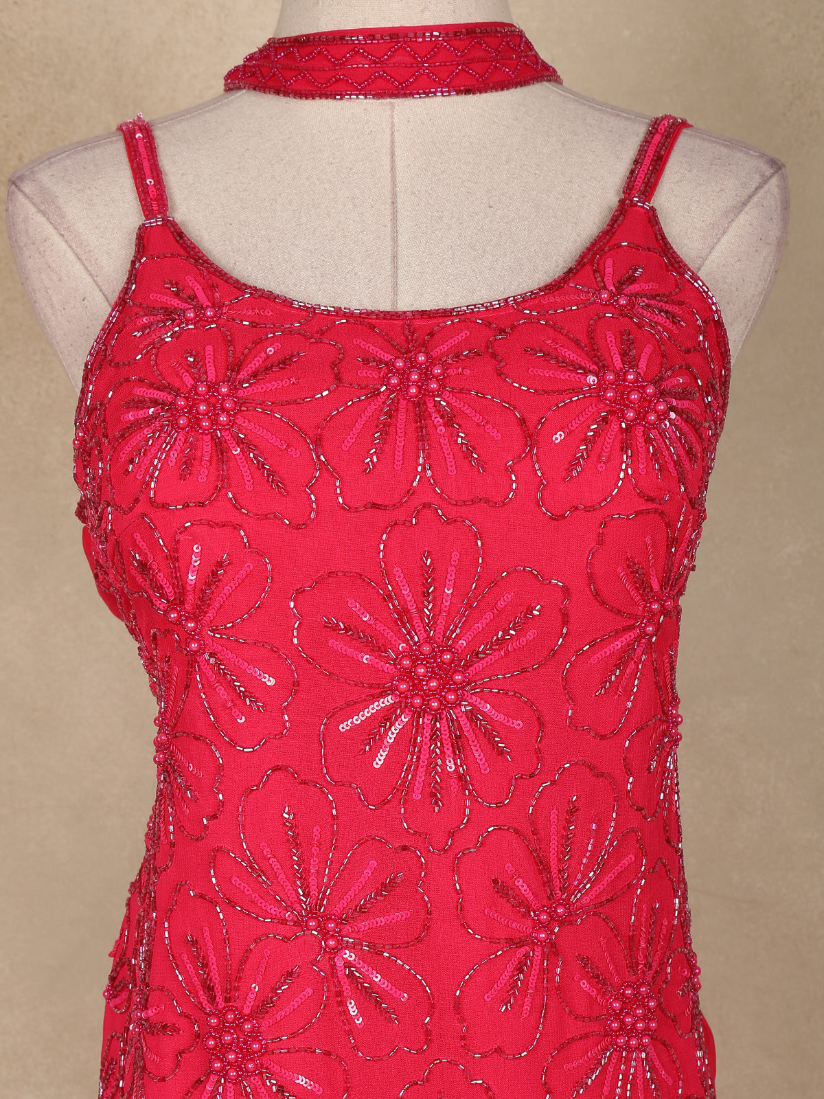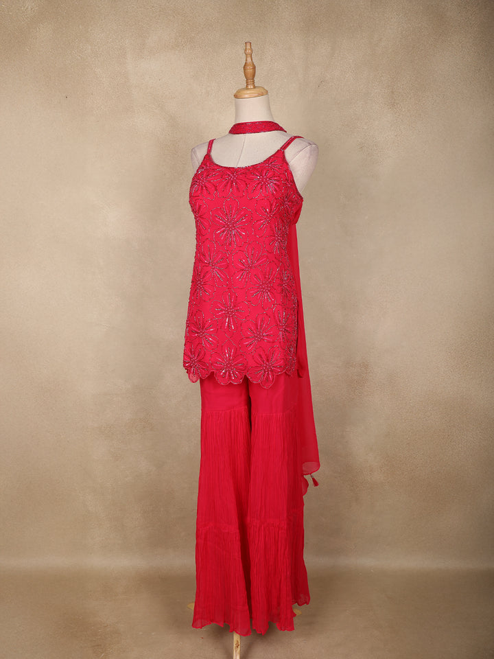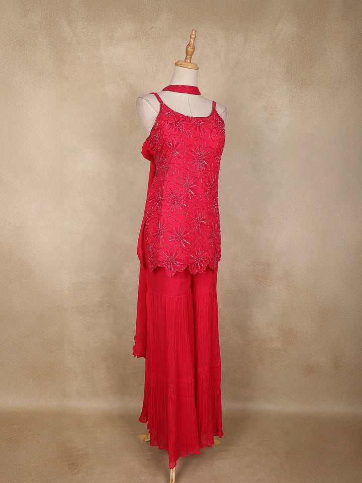 Turn heads with this glamorous Red Georgette Sharara Set crafted for the modern diva who loves to shine with elegance. The sleeveless top features exquisite floral sequin embellishments arranged in a radiant petal pattern, adding a dazzling sparkle to your festive look. The scalloped hemline enhances the designer appeal, making every detail stand out beautifully.