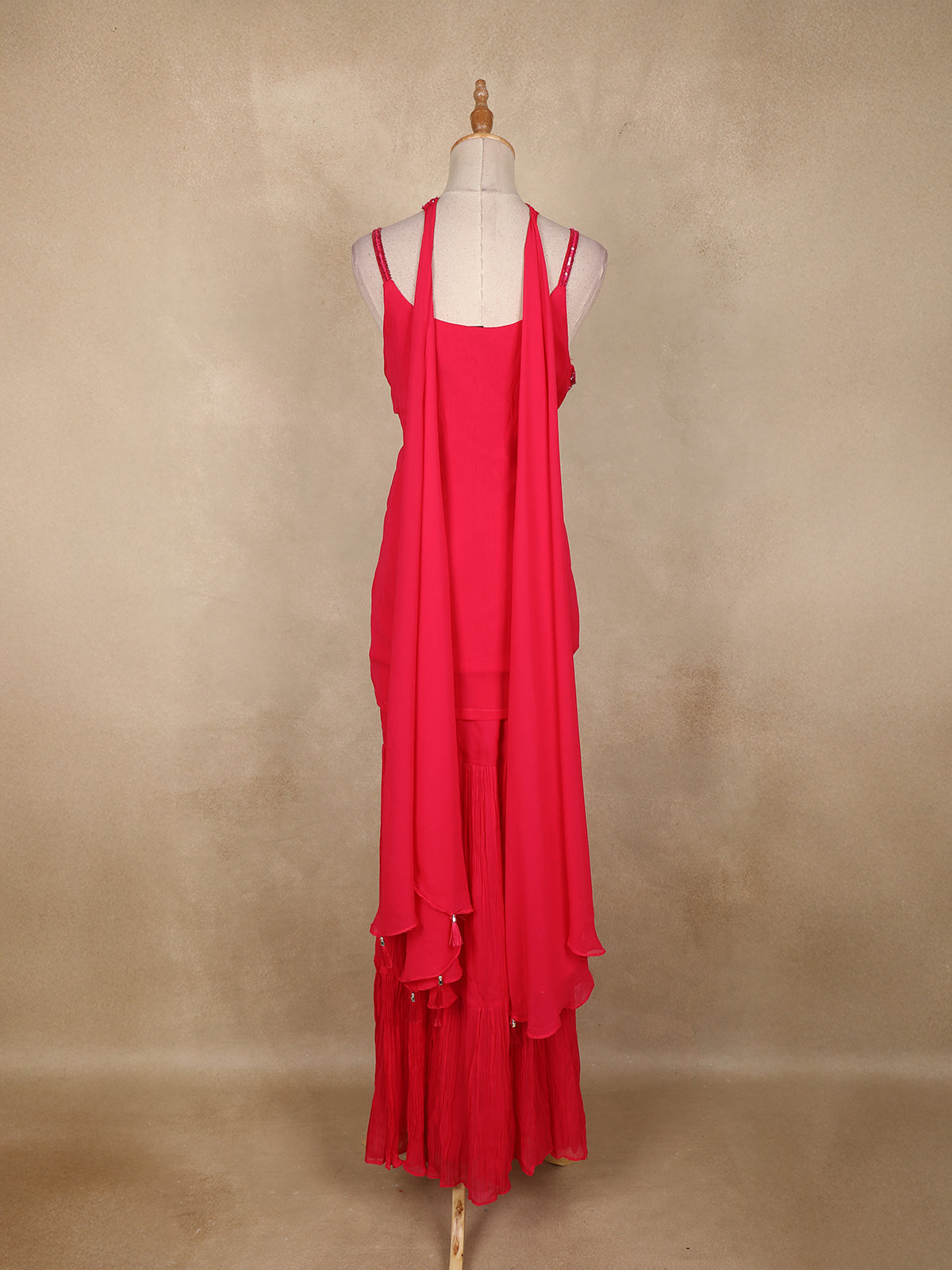 Paired with a flared georgette sharara bottom, the outfit flows gracefully with every step. The lightweight, soft fabric ensures comfort while maintaining a luxurious drape. The addition of a matching neck accessory gives a chic, coordinated finish — effortlessly elevating the ensemble for special occasions.