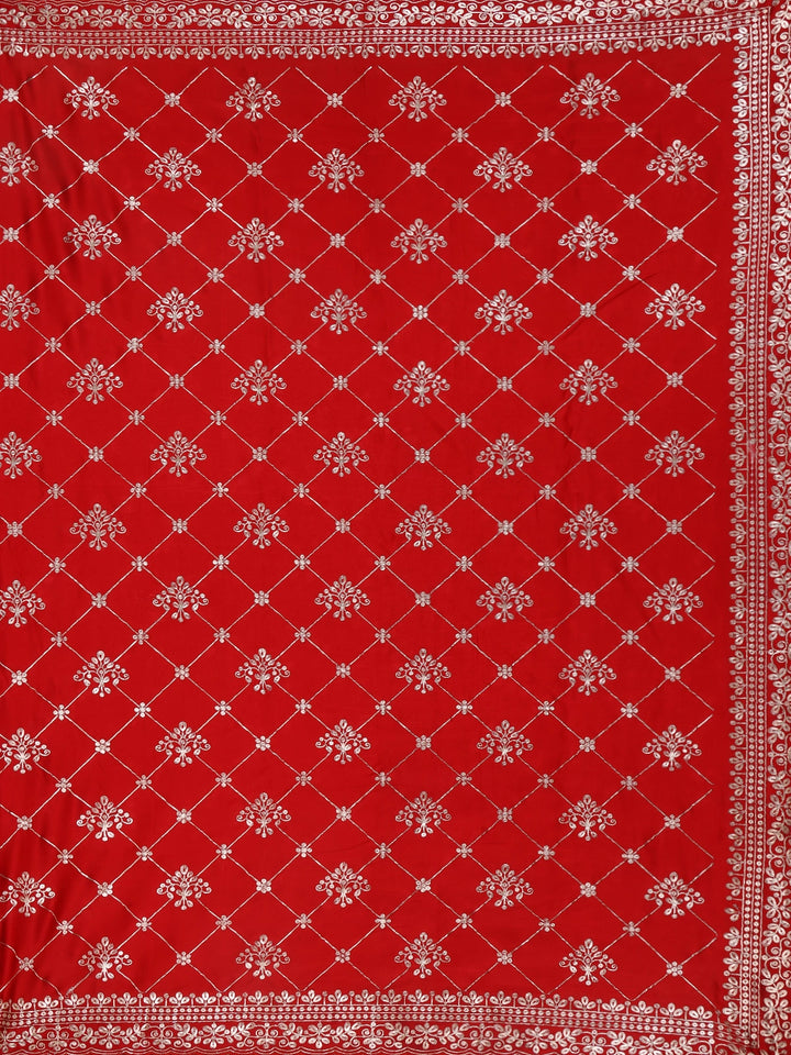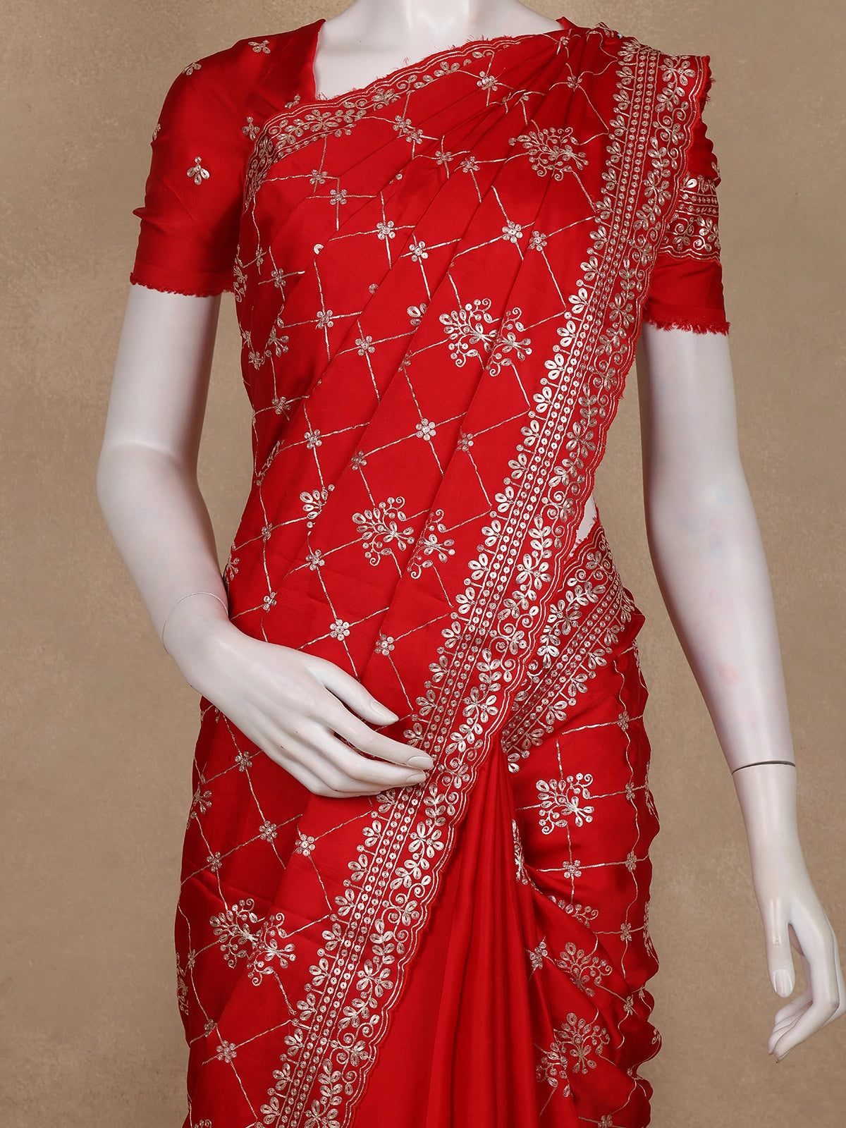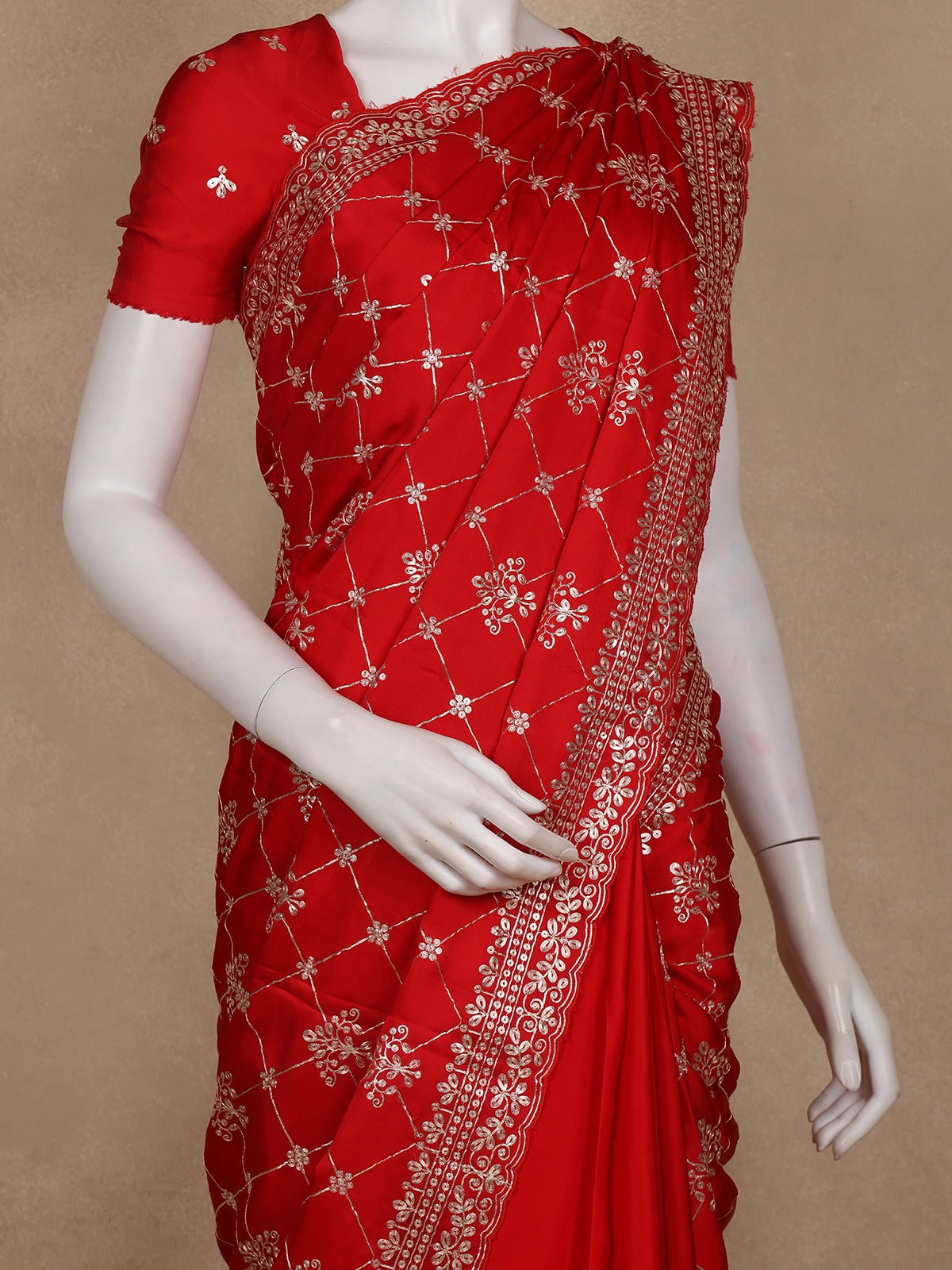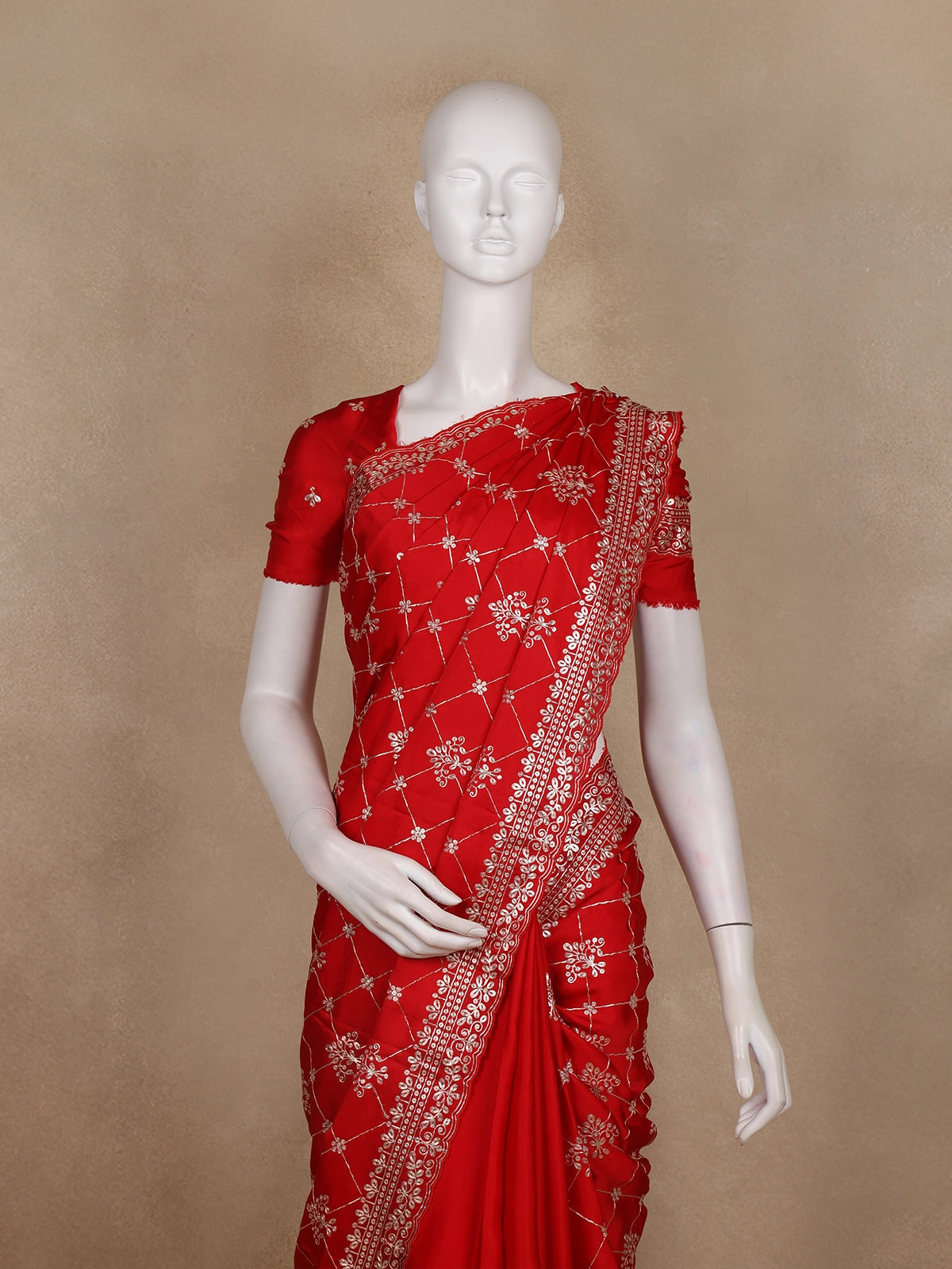Step into timeless elegance with this breathtaking red Semi Banarasi saree, exquisitely adorned with floral motifs highlighted by shimmering sequins and delicate thread embroidery. Designed with a classic lattice pattern throughout the drape, the rich craftsmanship radiates festive charm and regal appeal. The saree features a beautifully detailed designer border inspired by traditional Banarasi weaving, adding a majestic finish to the ensemble. Crafted in a smooth and flowy fabric, it drapes effortlessly to enhance every movement with grace. Paired with a coordinated embroidered blouse, this saree is a perfect pick for weddings, receptions, festive celebrations, and special family occasions—ensuring you glow with sophistication and cultural grandeur.